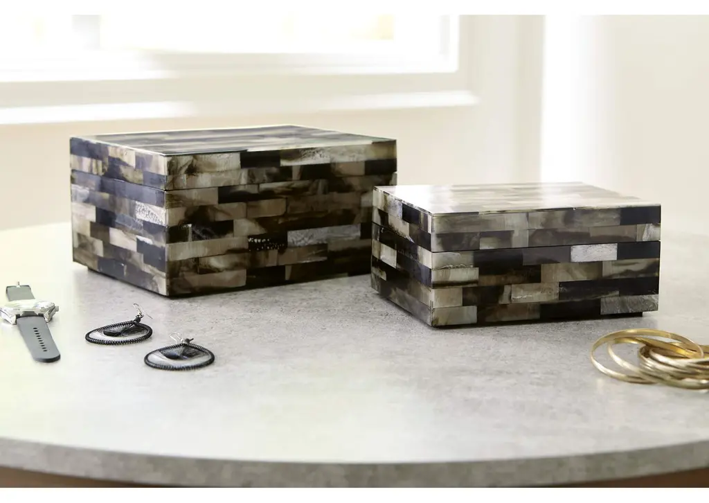 The mosaic patterned Ellford box set is a masterful interpretation of neutral hues. A stylish habitat to hide your tiny treasures, the set can store jewelry and accessories (along with other odds and ends), keeping clutter off the tops of your dressers and accent tables. Weight 5.000 lbs. (2.25kgs.)