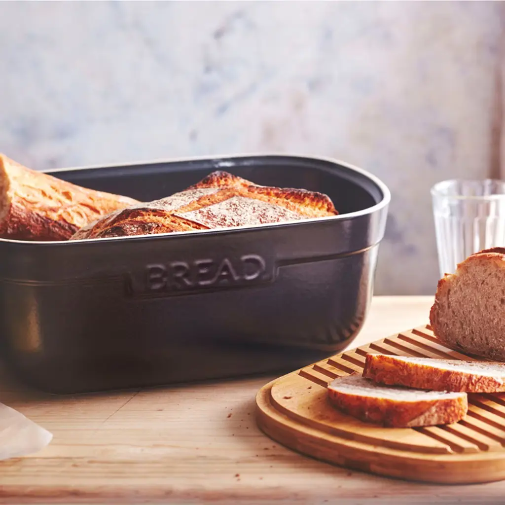 Elegance and function converge in our Emile Henry Bread Box, meticulously designed to create an environment that harmonizes humidity for a soft bread interior and ensures proper air circulation to maintain a crispy crust. Our spacious yet compact design offers ample room for airflow while neatly fitting onto any countertop. The wooden lid, smooth on top and grooved on the cutting side, effortlessly collects crumbs during slicing, adding convenience to its charm.