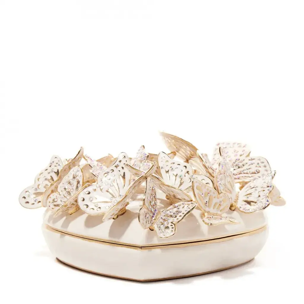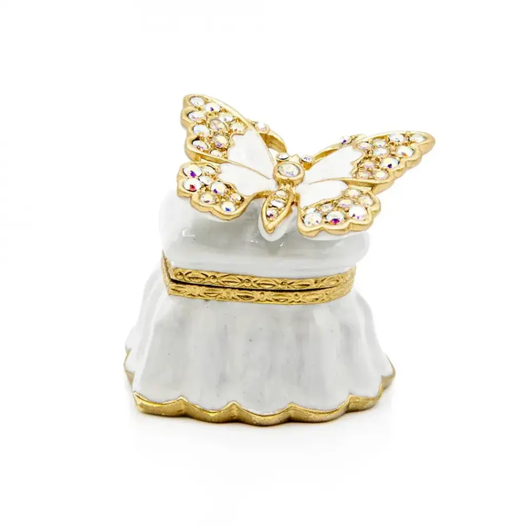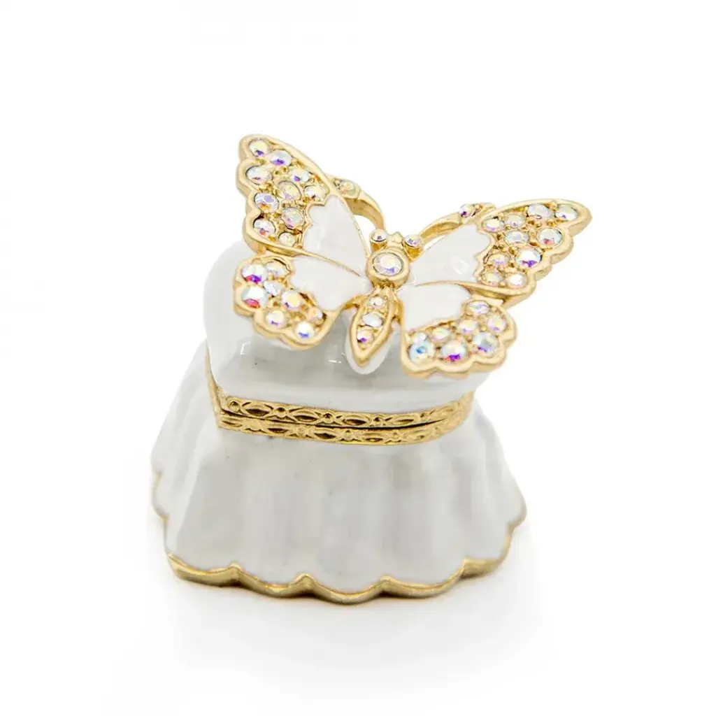 The lovely Emma Mini Heart Box is adorned with a hand-enameled butterfly, sparkling European crystals, opal hues on the outside, and a sweet something blue inside. With its 14k matte gold light brown antique finish, this box captures the essence of timeless love and refined taste. Whether you're giving it as a gift or keeping it for your own treasures, this enchanting box is sure to delight with its delicate charm and enduring allure.