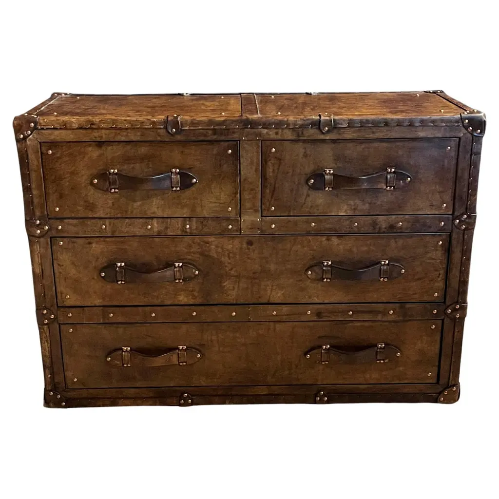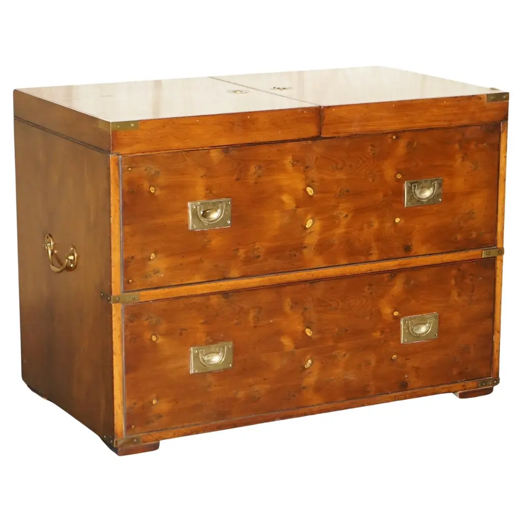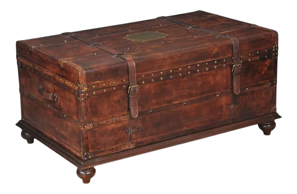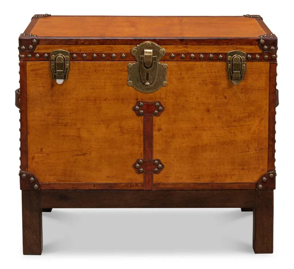 An English Campaign style decorative box on stand, this smaller wood box is beautifully detailed with brass tacks and hardware with leather accents. The interior of the box is lined with decorative paper. It rests on a wood stand. Dimensions: 23" W x 13" D x 20" H.