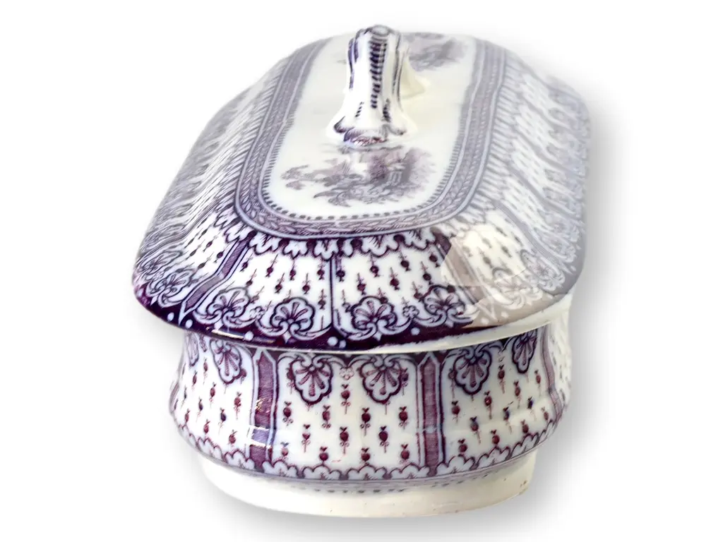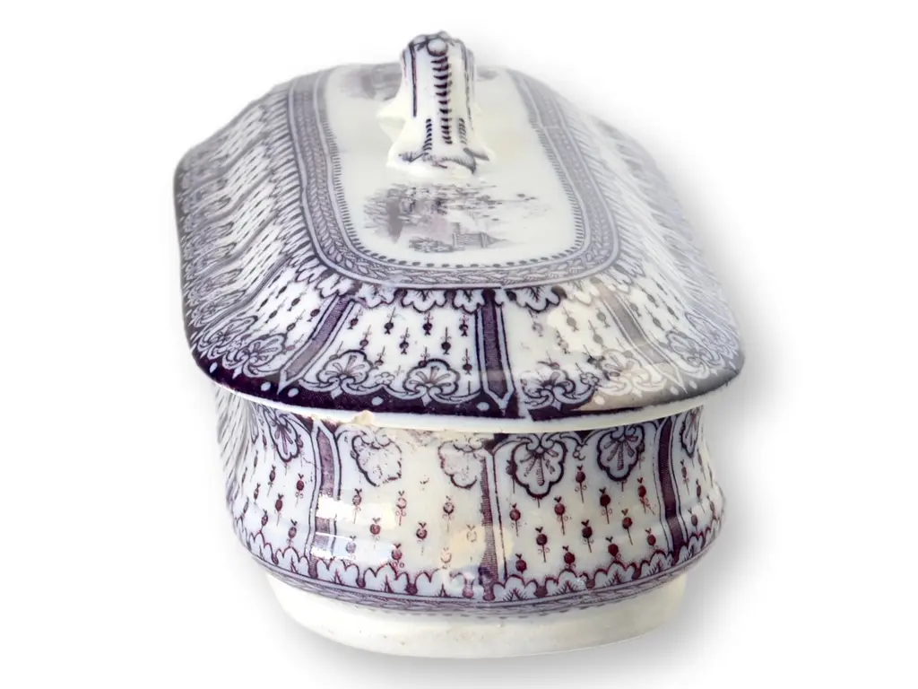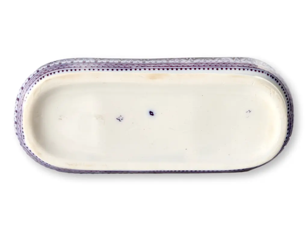 English transferware toothbrush box in a striking mulberry palette. A lovely example of 19th-century personal hygiene design, this lidded ceramic box features intricate Gothic-inspired motifs with delicate vine and floral elements. Originally intended for the Victorian washstand, it now makes an elegant storage solution for jewelry, brushes, or desktop odds and ends. Small 19th century pottery marks on underside .