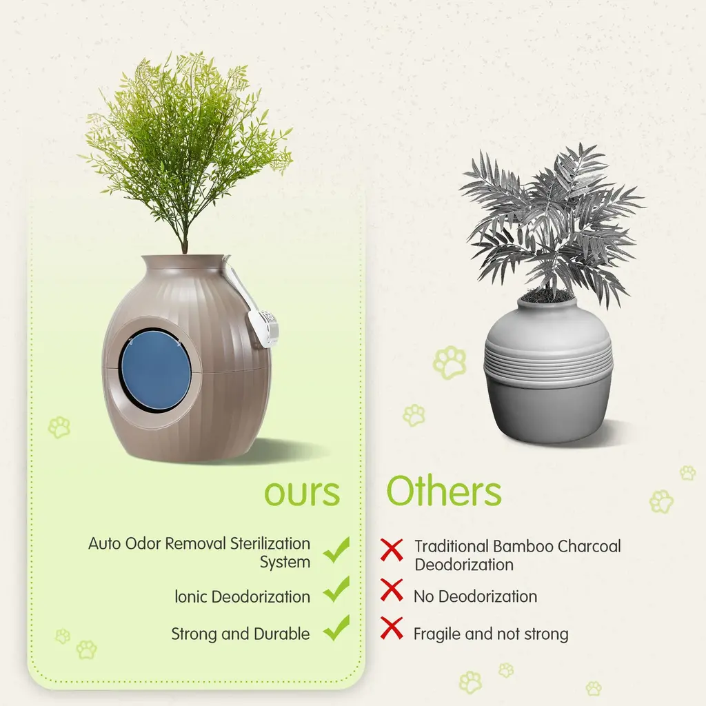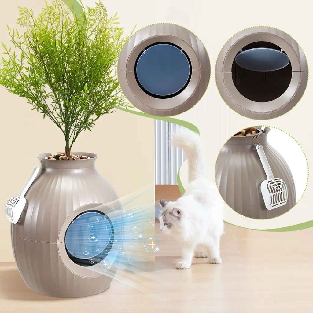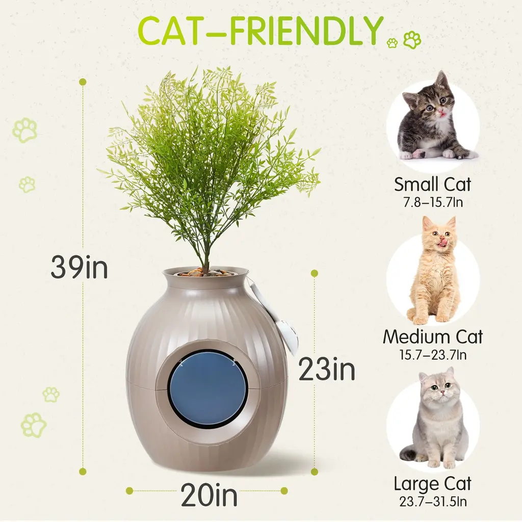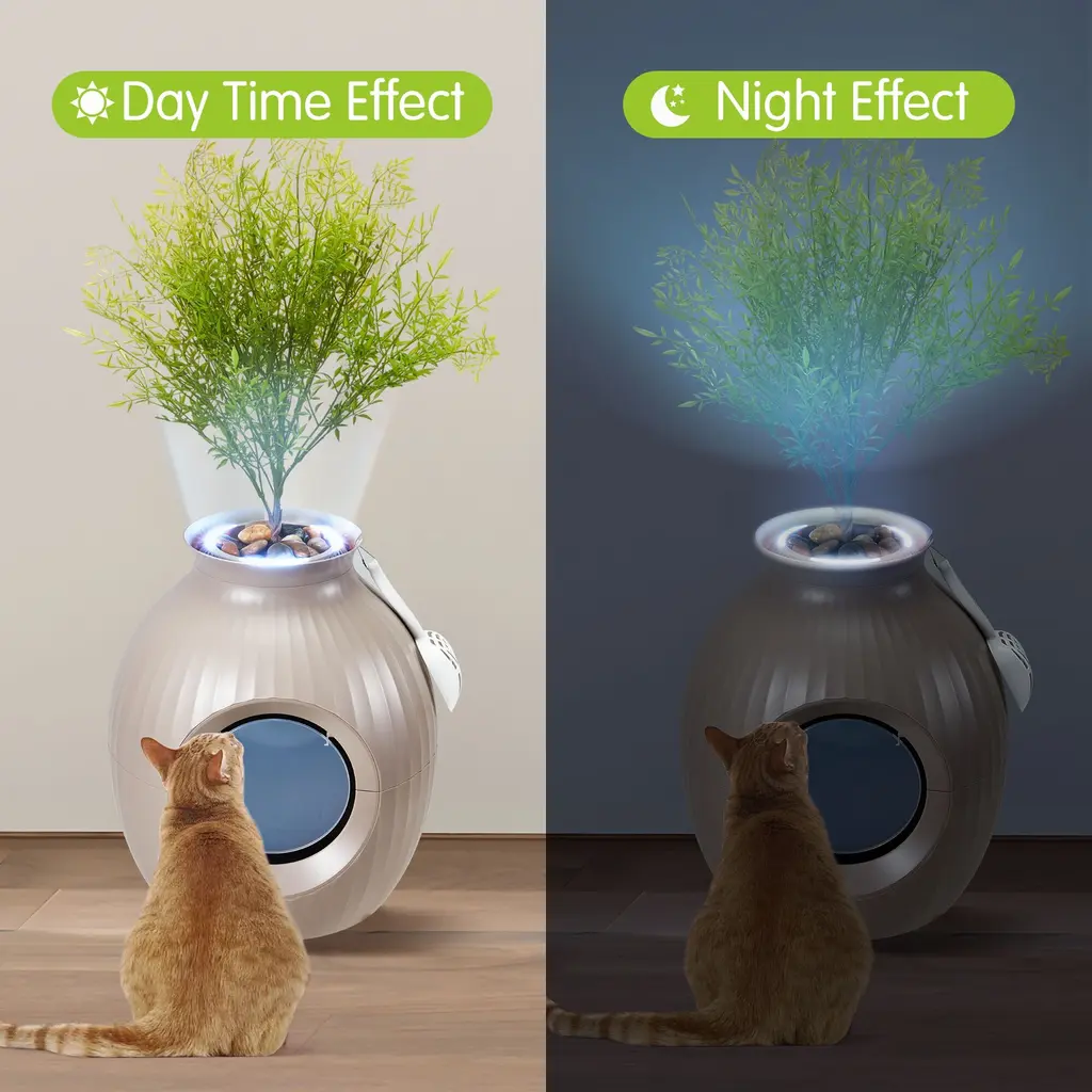 Discreet and Decorative Cat Furniture This hidden cat litter box enclosure features a low-profile egg-shaped design that doubles as a decorative plant stand. The realistic artificial plants, including lush Nandina domestica, add a natural touch, blending seamlessly with your home decor while discreetly concealing your cat's litter box. Spacious and Private Interior Designed for comfort and privacy, the enclosed litter box offers a spacious 20 by 39-inch interior, ideal for both cats and small pets like rabbits. Its generous size and wide opening make it perfect for multi-cat households while reducing litter mess and tracking. Advanced Plasma Sterilization System Unlike traditional litter box furniture, this model includes an integrated plasma sterilization system and a carbon filter, helping to neutralize odors and eliminate harmful bacteria. This keeps the air in your home fresh and provides a cleaner, healthier environment for your pets. Durable, Waterproof, and Easy to Clean Constructed from high-quality ABS material, this enclosed litter box is strong, waterproof, and resistant to deformation. It comes with a detachable tray for hassle-free cleaning, making daily maintenance simple and efficient even for busy pet parents. Modern LED Lighting for Ambiance The built-in RGB LED strip adds a playful, tech-savvy vibe to your home. Whether day or night, the soft red, green, and blue lights turn your cat's litter area into a stylish focal point while giving your pet a calming and inviting space.