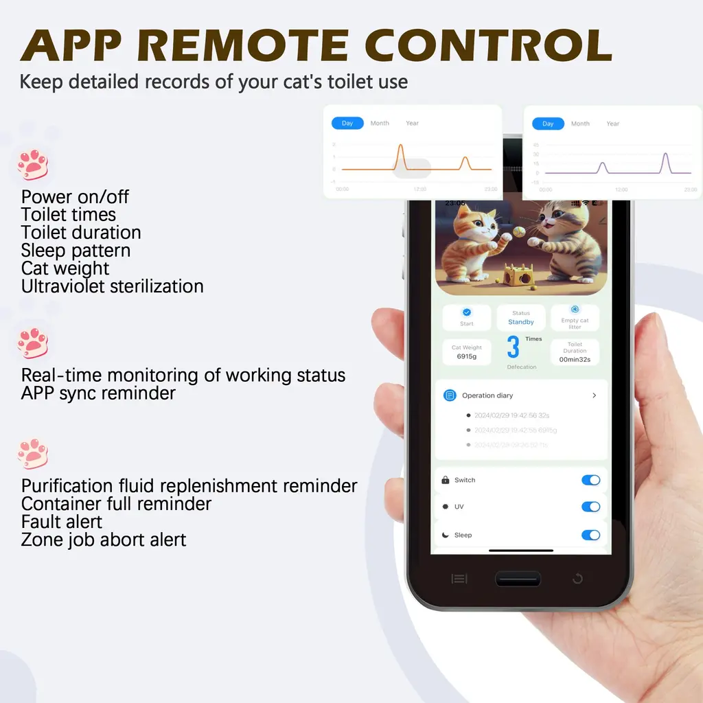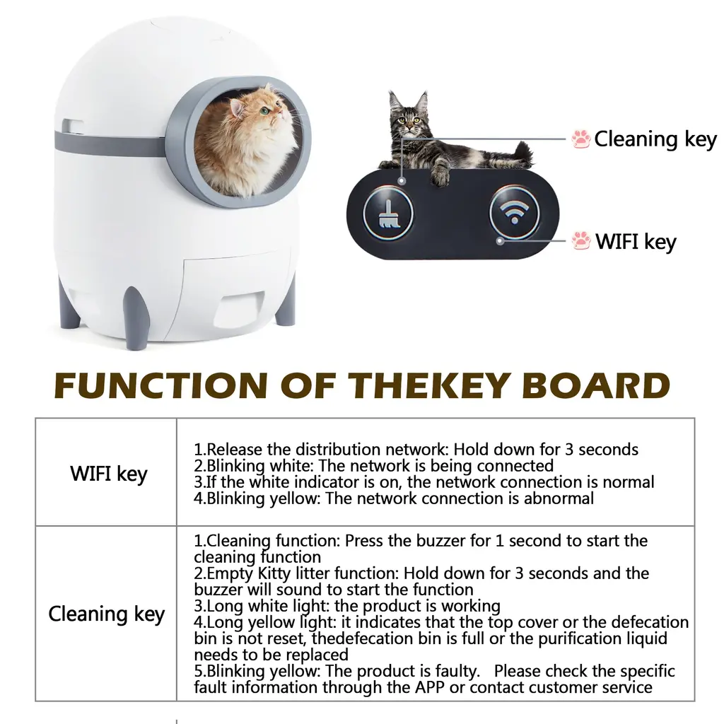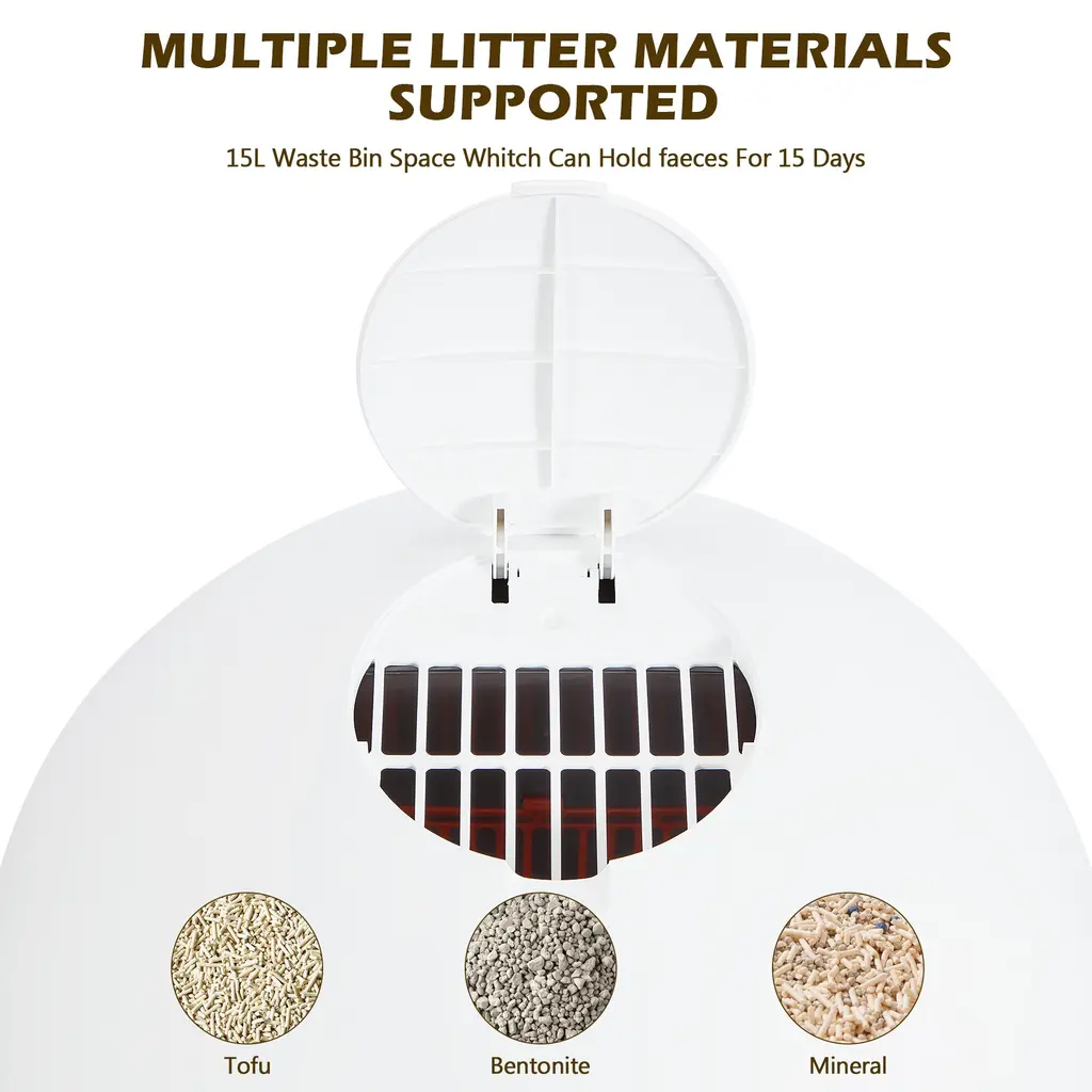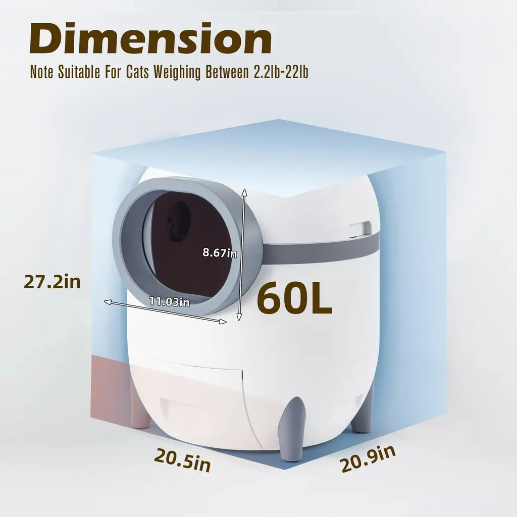 Are you tired of scooping poop every single day? Worried about your cat's health while you're away? Well, worry no more! Our automated litter box is here to save the day. With the companion app, you can track your cat's weight, toilet habits, and monitor the litter box's status with ease.Say goodbye to the hassle of constant cleaning! With a spacious 60-liter capacity, it's perfect for cats of all sizes. Whether you have one furry friend or a whole bunch, our litter box provides a clean and comfortable space for them all.FeaturesSpecification