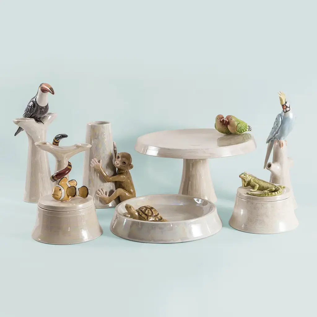 This exquisite box with lid was entirely made by the hands of master artisans in Capodimonte porcelain, a precious material that gets its name from the hills by Naples where it was first used in the middle of the 18th century to create decorative objects. The simple body and lid, featuring the delicate shimmer that is characteristic of the Capodimonte production, are enhanced by the presence of a statuette depicting a magnificent iguana resting on the lid with its tail curled up.