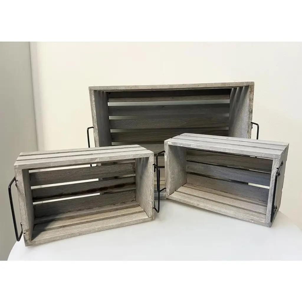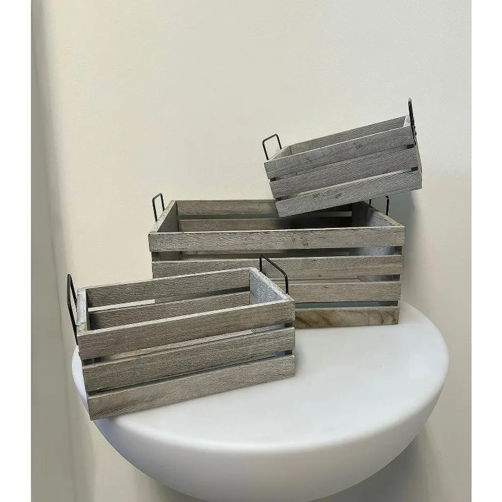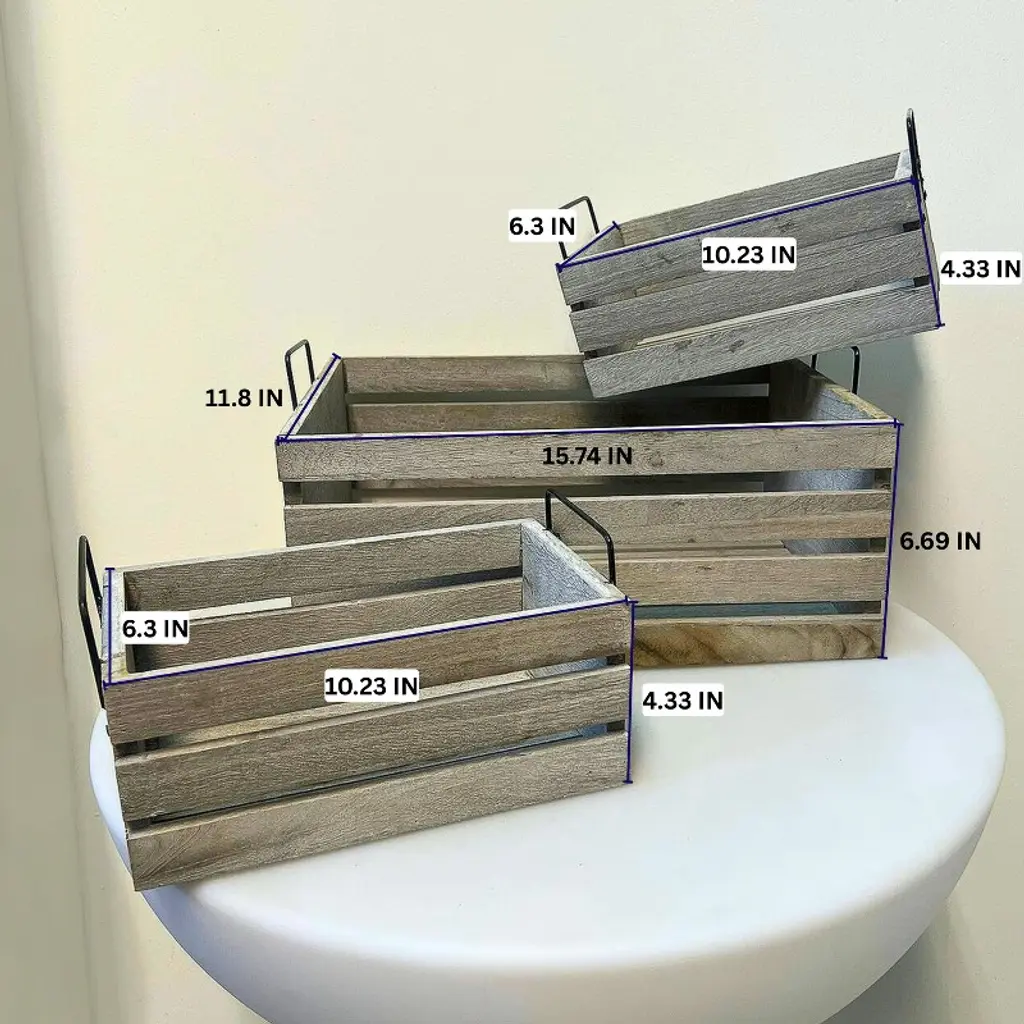 The Essential Decor & Beyond 3-Piece Set Wooden Box with Handle Accent Decor includes three rectangular wooden crates featuring sturdy metal handles, combining rustic charm with an industrial aesthetic. Perfect for both decorative and practical use, these versatile crates offer stylish storage, organization, or display options, adding warmth and character to any interior space.
