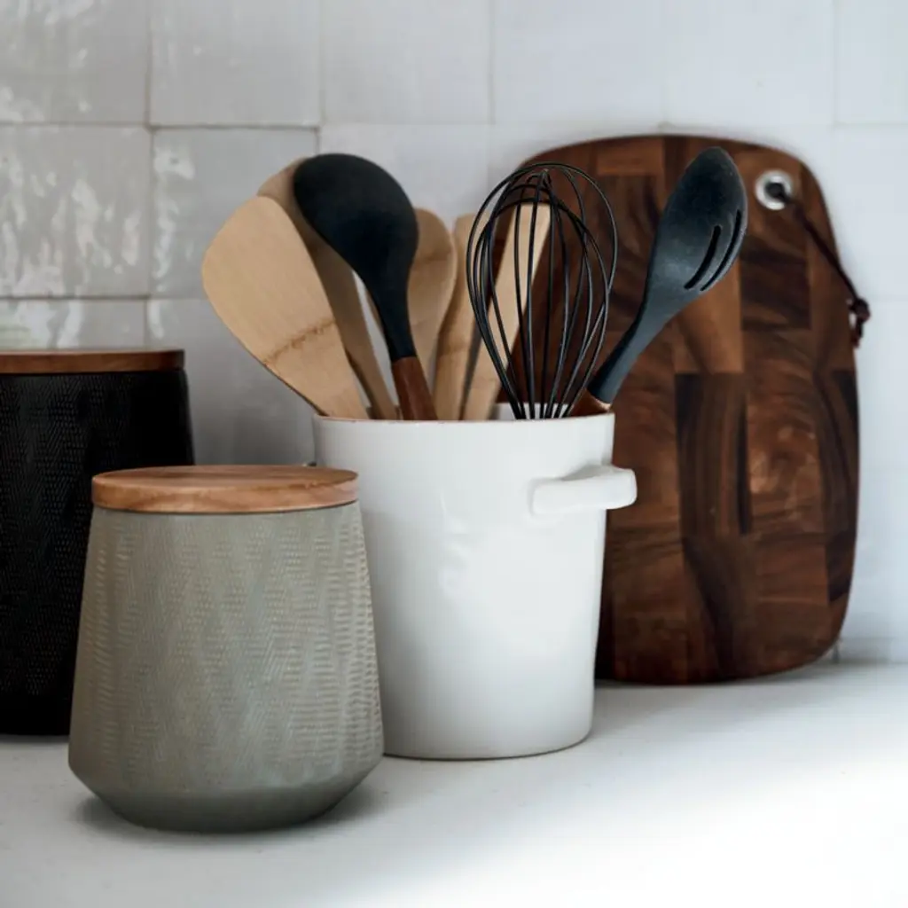 Alone or as a set of three, our Ethan canisters elevate kitchen or household storage with global-accented texture and room-friendly neutrals. Each smartly angled container in black, cream or grey is subtly textured with fine lines that crisscross on the diagonal. Perfectly proportioned wood lids top off for a clean look.