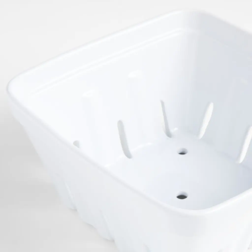 The classic farmers market berry box reimagined in white ceramic takes whimsy a step further with oversized proportions. Fill the whimsical container with fresh apples, peaches, pears or a bounty of berries for a sweet addition to the breakfast table. For an especially delightful presentation, pair it with one of our stoneware egg crates filled with soft boiled eggs. A Crate & Barrel exclusive, the extra-large berry basket is glazed bright white and doubles as a colander for rinsing and straining fruit.