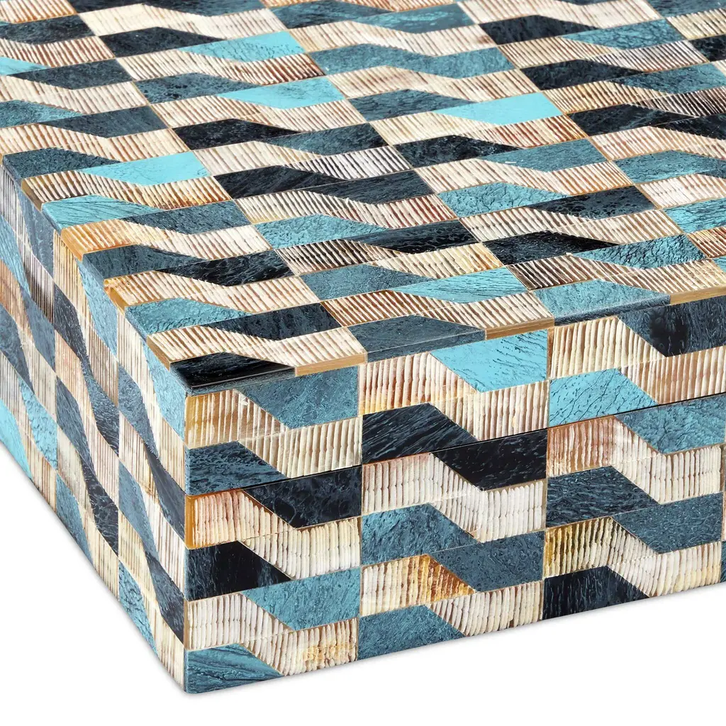 The Ezra Box Set includes two decorative boxes that are made of alternating colors of bone and chiseled horn. The wavy pattern is created when blue, brown, and ivory colored bone and horn are hand-applied to the surface to make the boxes artisanal accessories that pack a textural punch. The interiors of the boxes are linen-lined for a sophisticated feel. In Stock Late May 2026 This image is for illustrative purposes only. The colors shown are accurate within the constraints of lighting, photography, and the color accuracy of your screen.