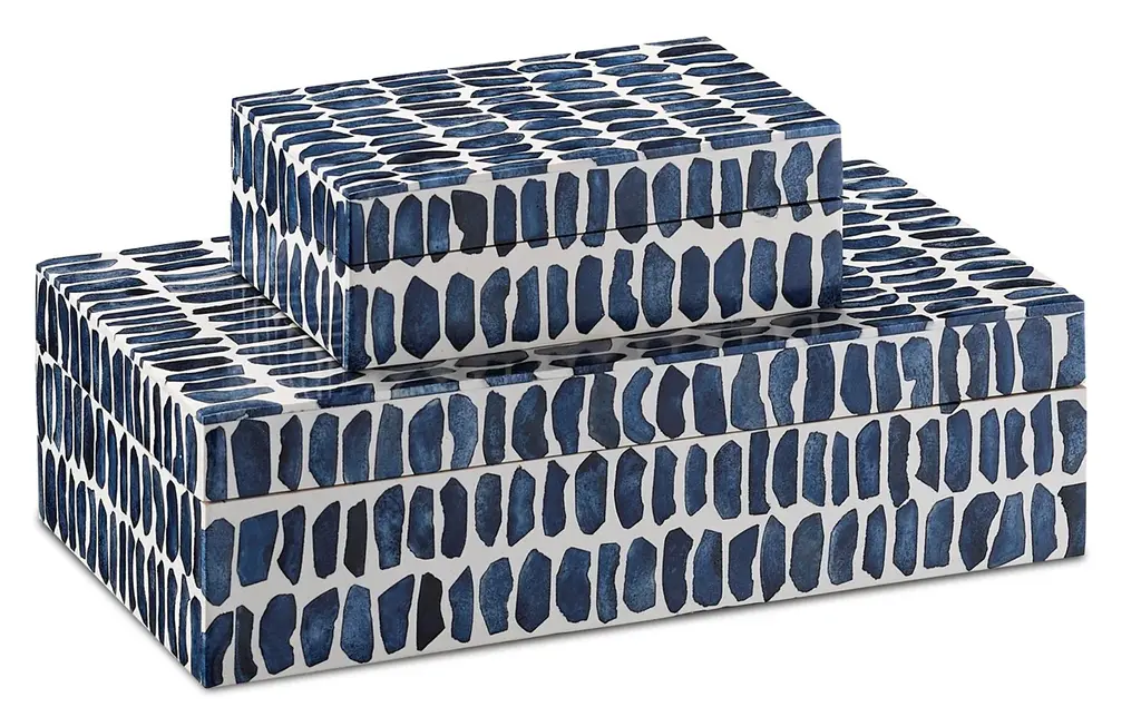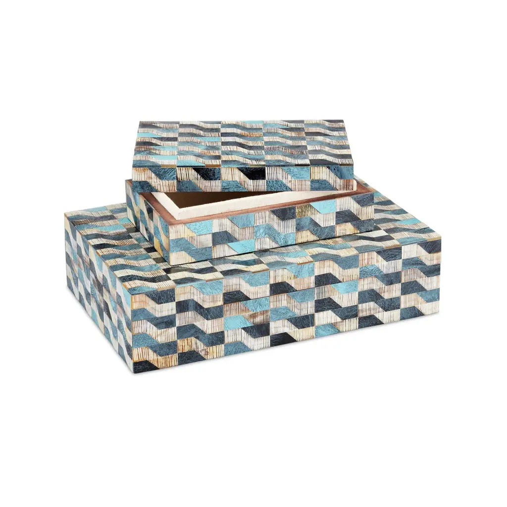 The Ezra Box Set includes two decorative boxes that are made of alternating colors of bone and chiseled horn. The wavy pattern is created when blue, brown, and ivory colored bone and horn are hand-applied to the surface to make the boxes artisanal accessories that pack a textural punch. The interiors of the boxes are linen-lined for a sophisticated feel. In Stock Late May 2026 This image is for illustrative purposes only. The colors shown are accurate within the constraints of lighting, photography, and the color accuracy of your screen.