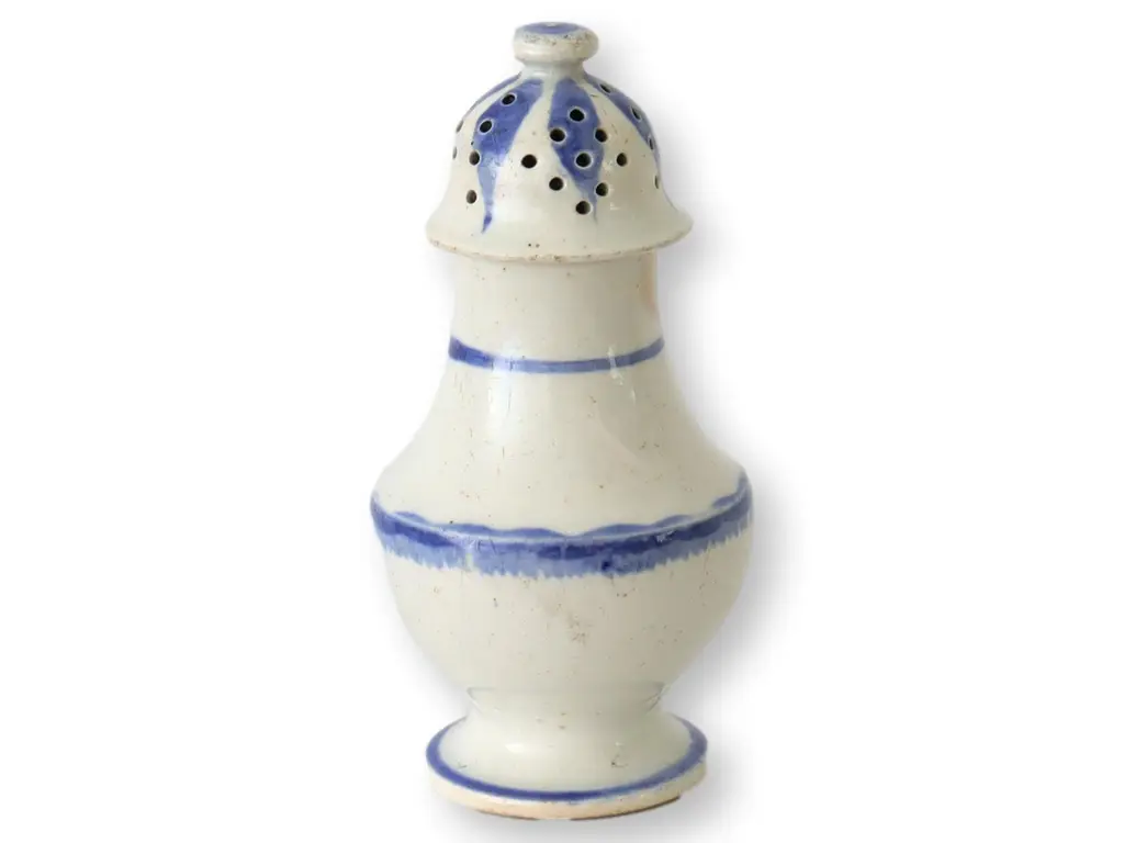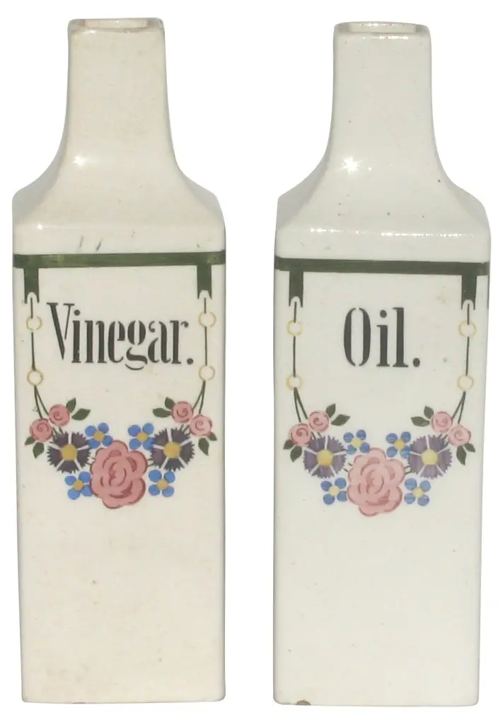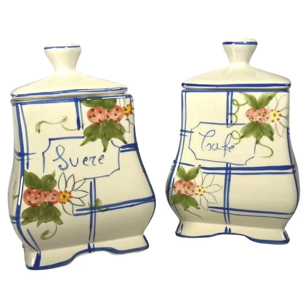 Five-piece European faience canister set. Set of: oil and vinegar cruets, nutmeg, pepper, and clove spice jars with lids. Underglaze mark on underside: Germany. Cruet, 2.5"L x 2.5"W x 8"H. Spice jars, 2"L x 2"W x 3"H (without lids) and 4.25"H (with lids). Cruets missing stoppers, minor glaze flaws and crazing.