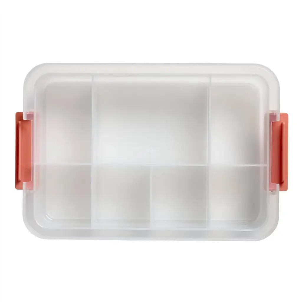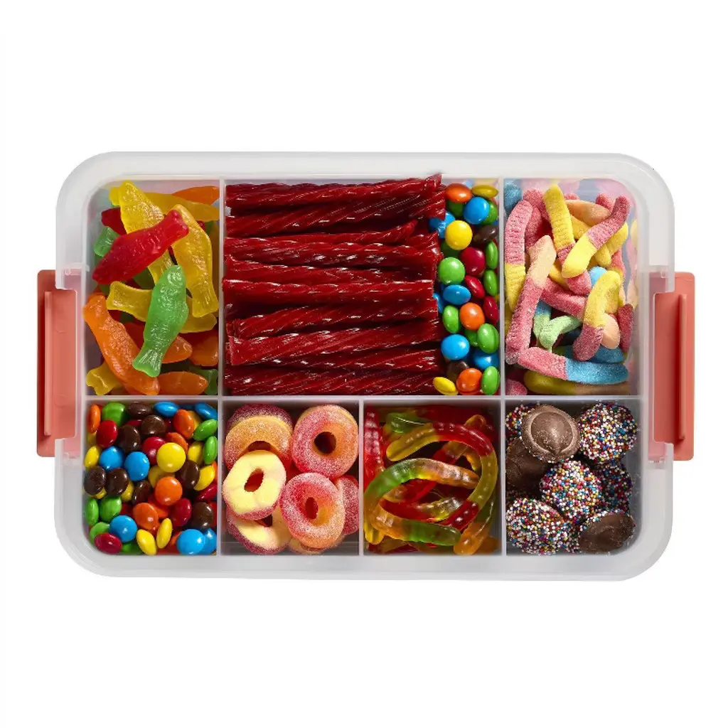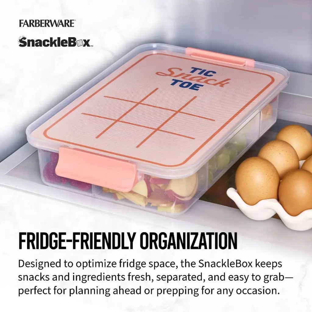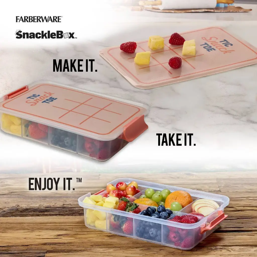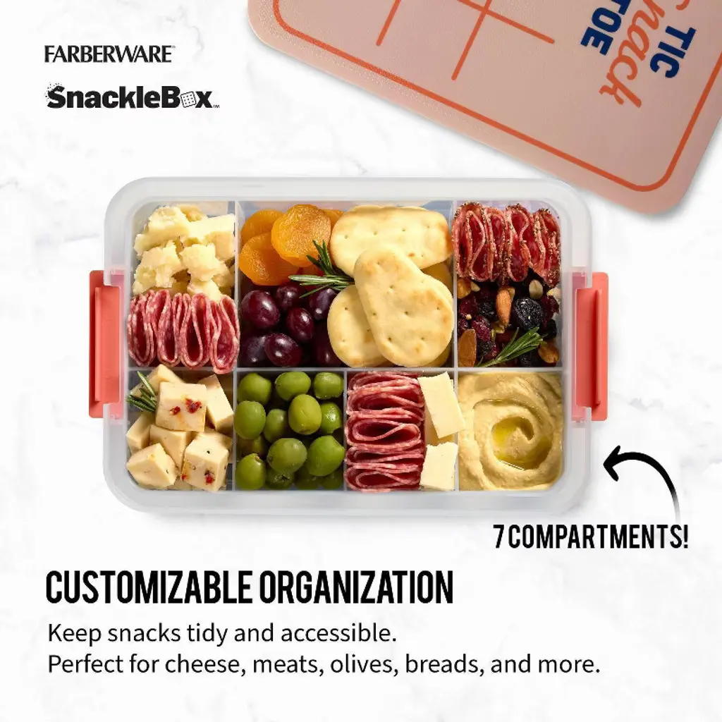 Elevate your snacking experience with the Snacklebox. "Make it. Take it.Enjoy it.™" wherever you are, this snacklebox is ideal for picnics,vacations, road trips, sports events, or snacking at home. It offers a practical solution for enjoying your favorite treats. Equipped with handles that securely lock the plastic cutting mat into place, ensuring your snacks stay safe and sealed during transport. The plastic lid alsoserves as a cutting mat, ideal for on the go prep and plating needs. This reversible cutting mat lid is perfect for everyday food preparation, from slicing fruit to chopping veggies. Designed with 7 compartments, this dishwasher safe snacklebox provides ample space to neatly organize a variety of snacks, making them easily accessible. The Tic Tac Toe pattern ensures a fun interactive way of snacking.