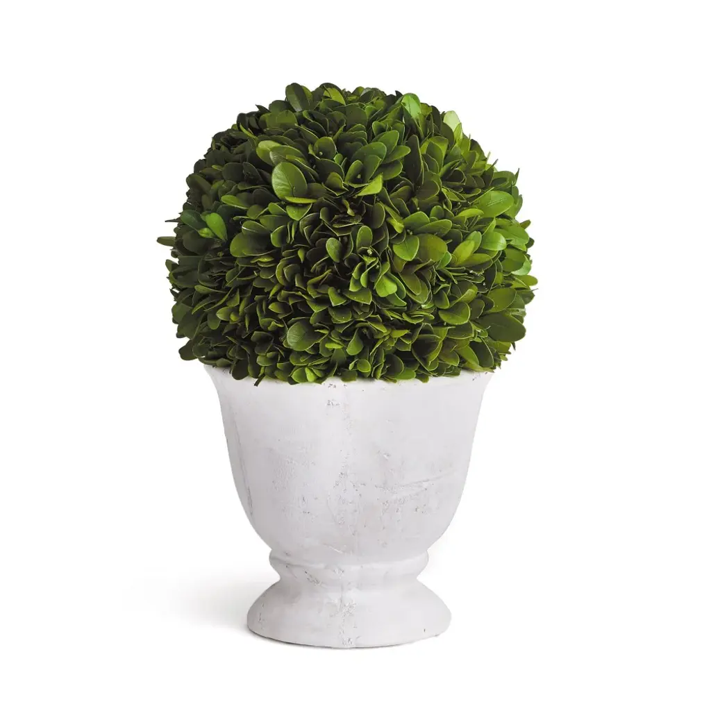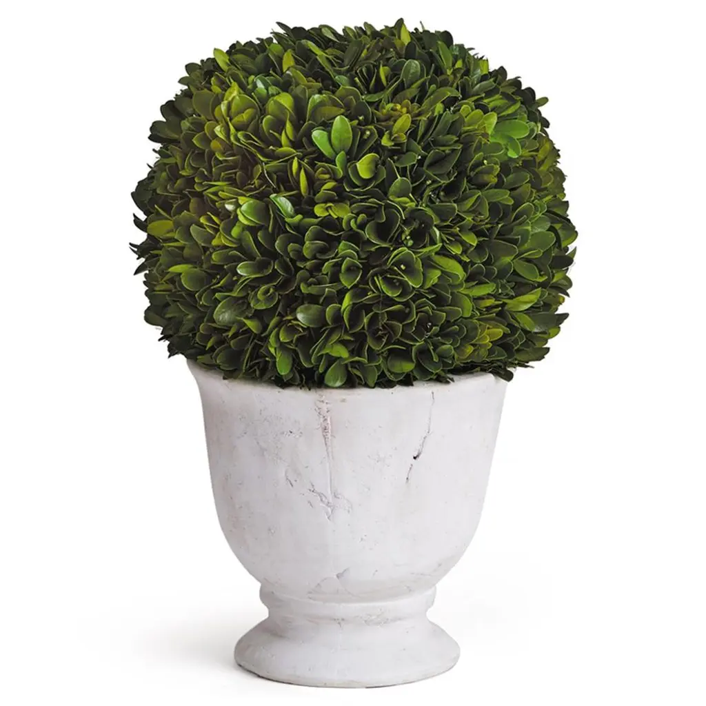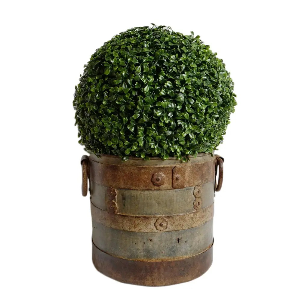 Old industrial iron bucket with faux boxwood topiary ball. Great display piece that does not need water. Each is slightly unique.