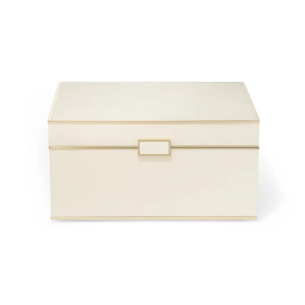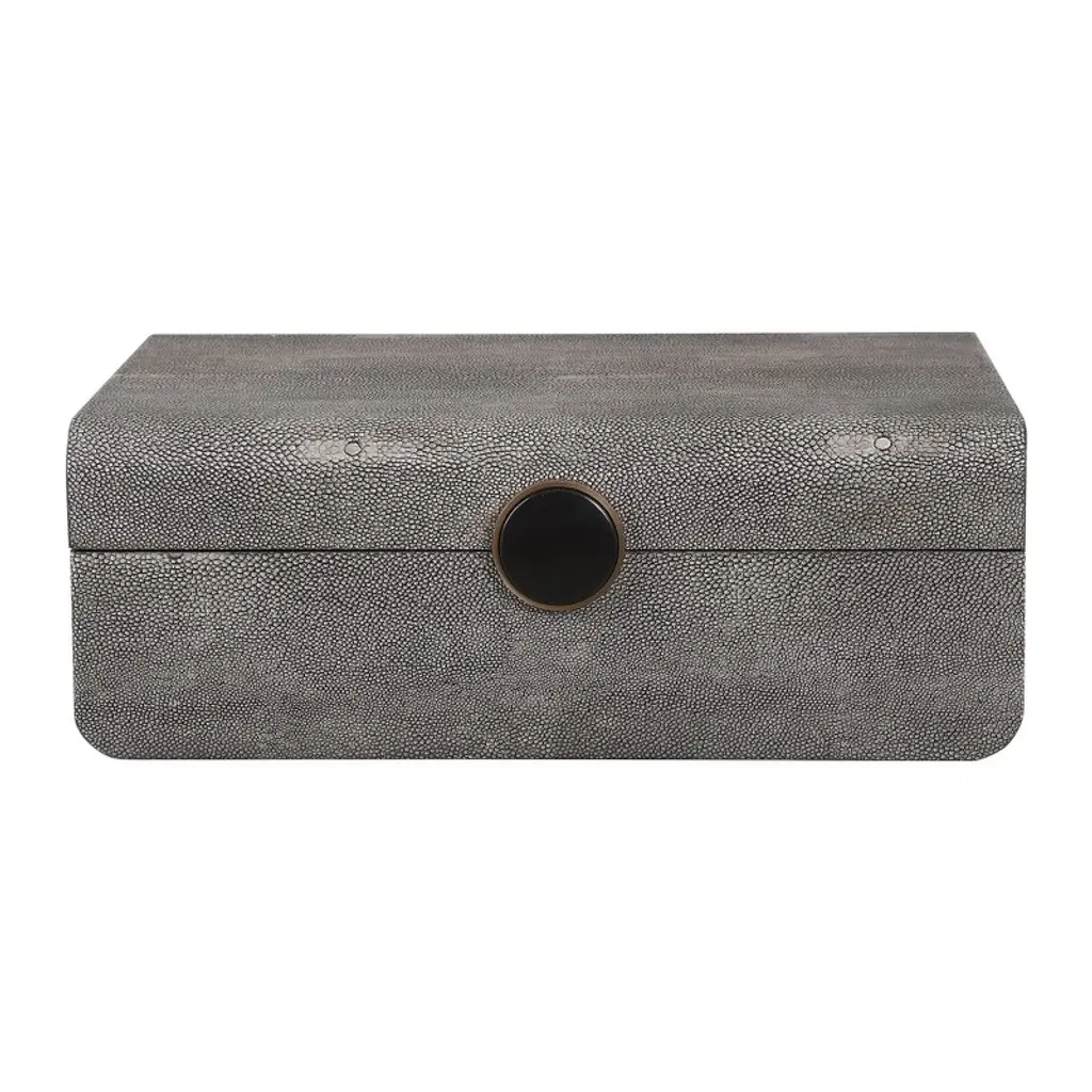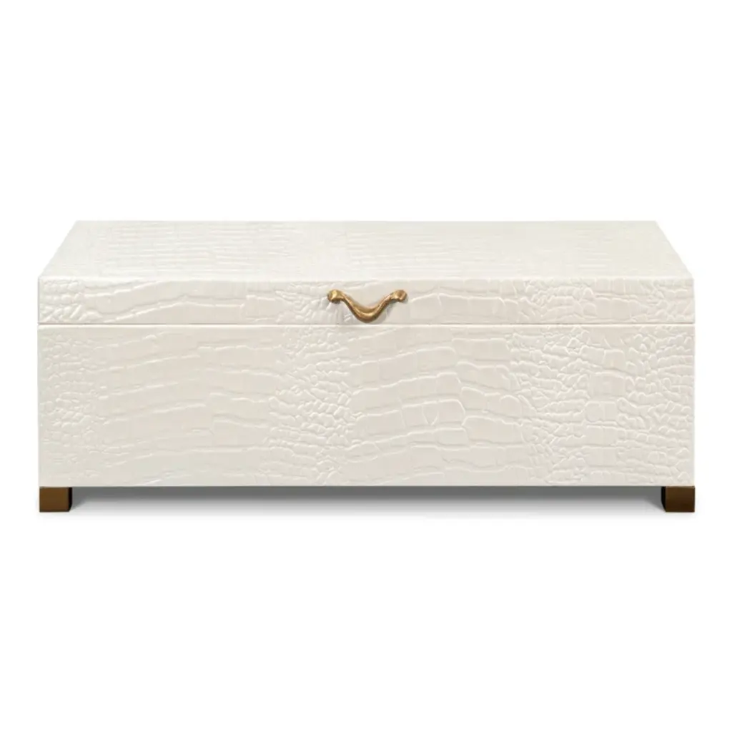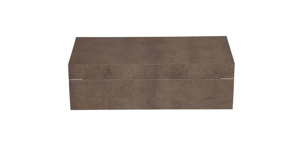 Looking for a place to keep your jewels, important papers, or spare change? Everything just seems more valuable when safely stored away in our gorgeous embossed leather box. Available in two sizes and accented by stylish hardware with a brilliant nickel finish, this genuine leather box gets a boost from a stylish faux snakeskin print, and it comes in a perfect shade of taupe that can live anywhere.