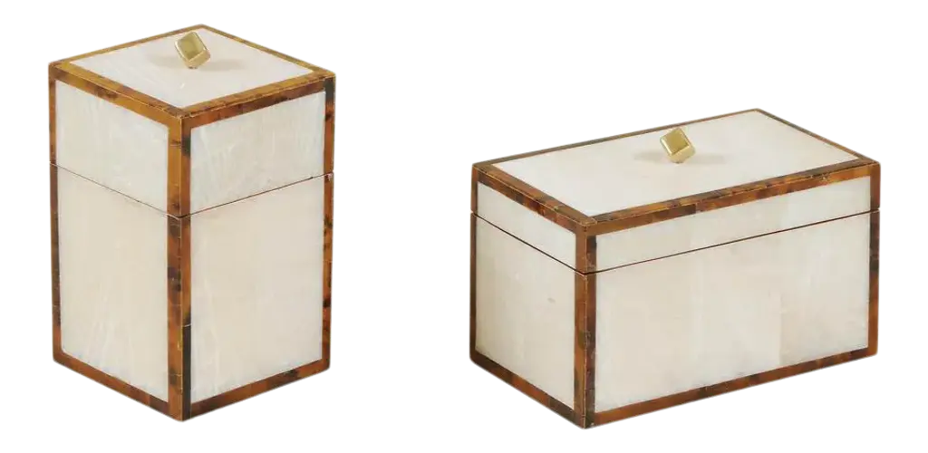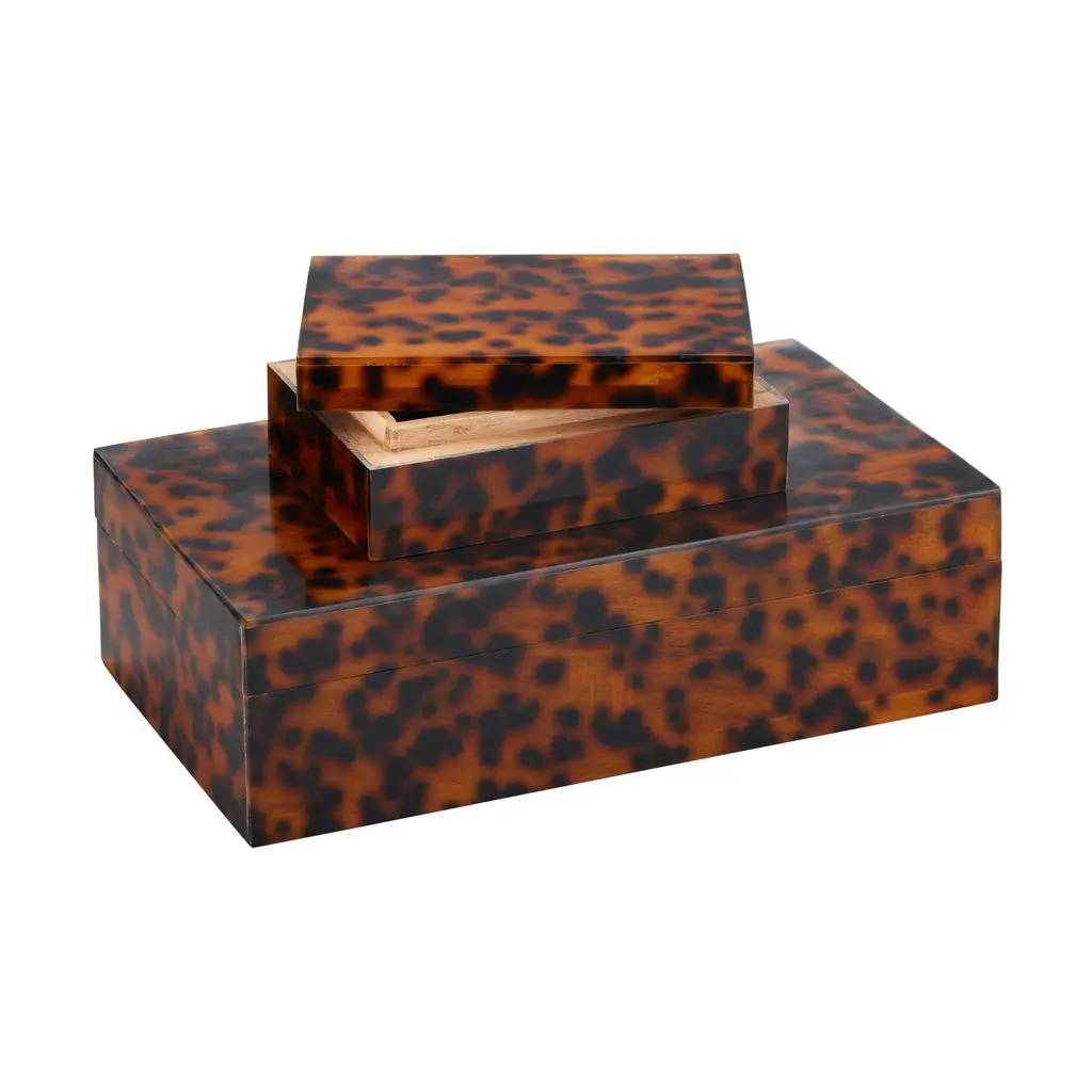The Faux Tortoise Box Set is made of black and brown mottled composite. The chic pattern has been popular in interiors for centuries, which makes these brown decorative boxes timeless. Adding interest and texture to a room, tortoiseshell acts as a neutral, so it works with any color scheme and every design style from modern to traditional. These boxes will be durable because they have solid wood interiors. Ships In 7-10 Business Days This image is for illustrative purposes only. The colors shown are accurate within the constraints of lighting, photography, and the color accuracy of your screen.