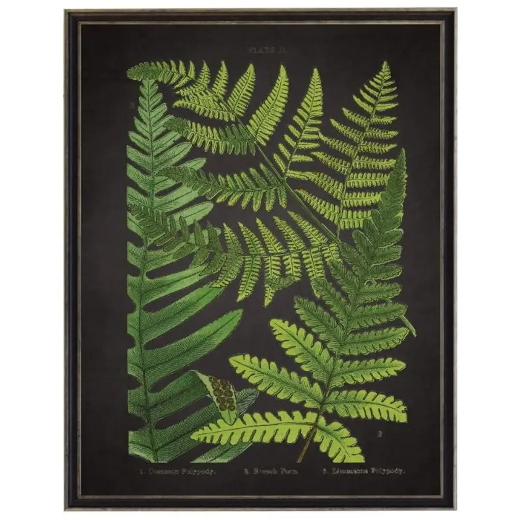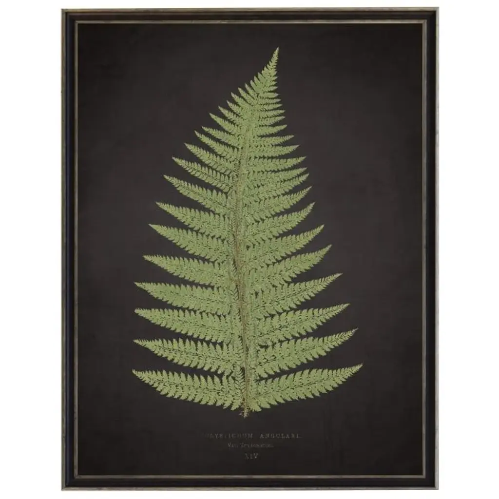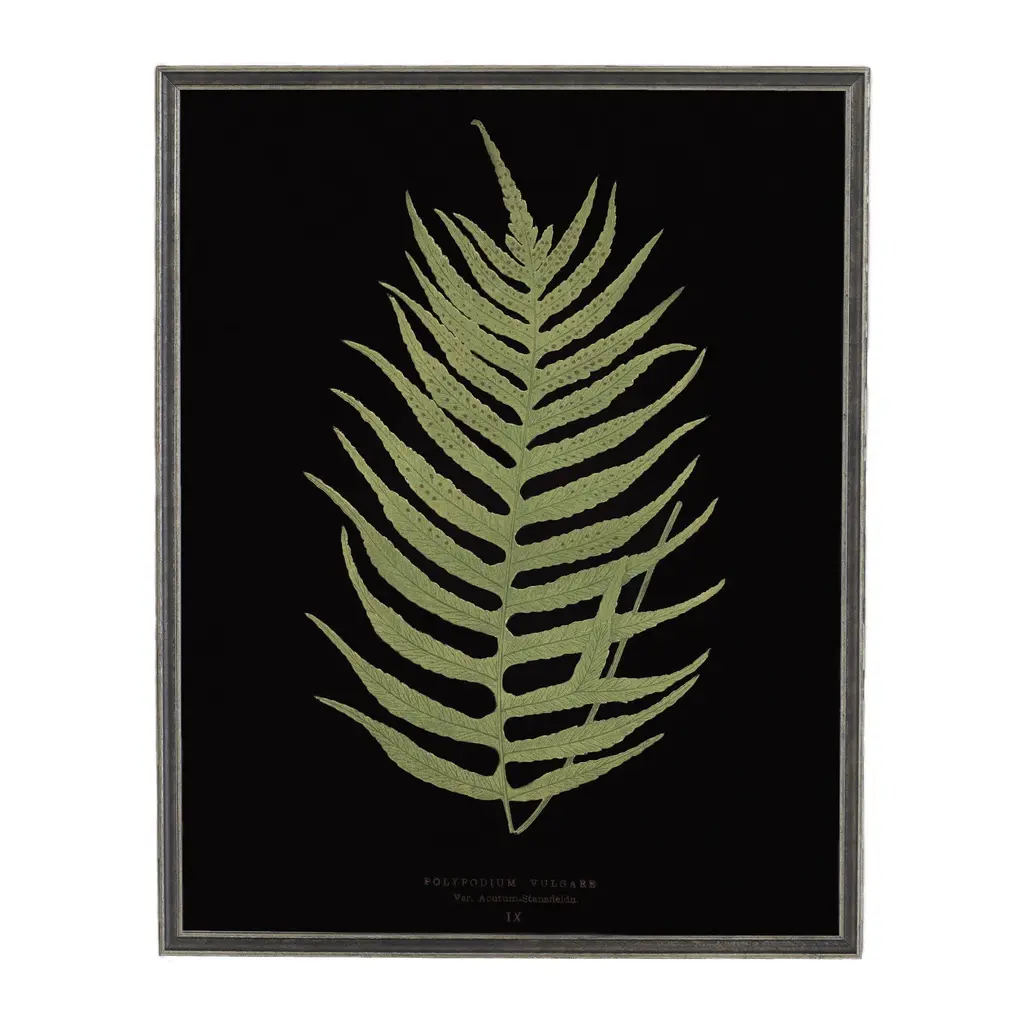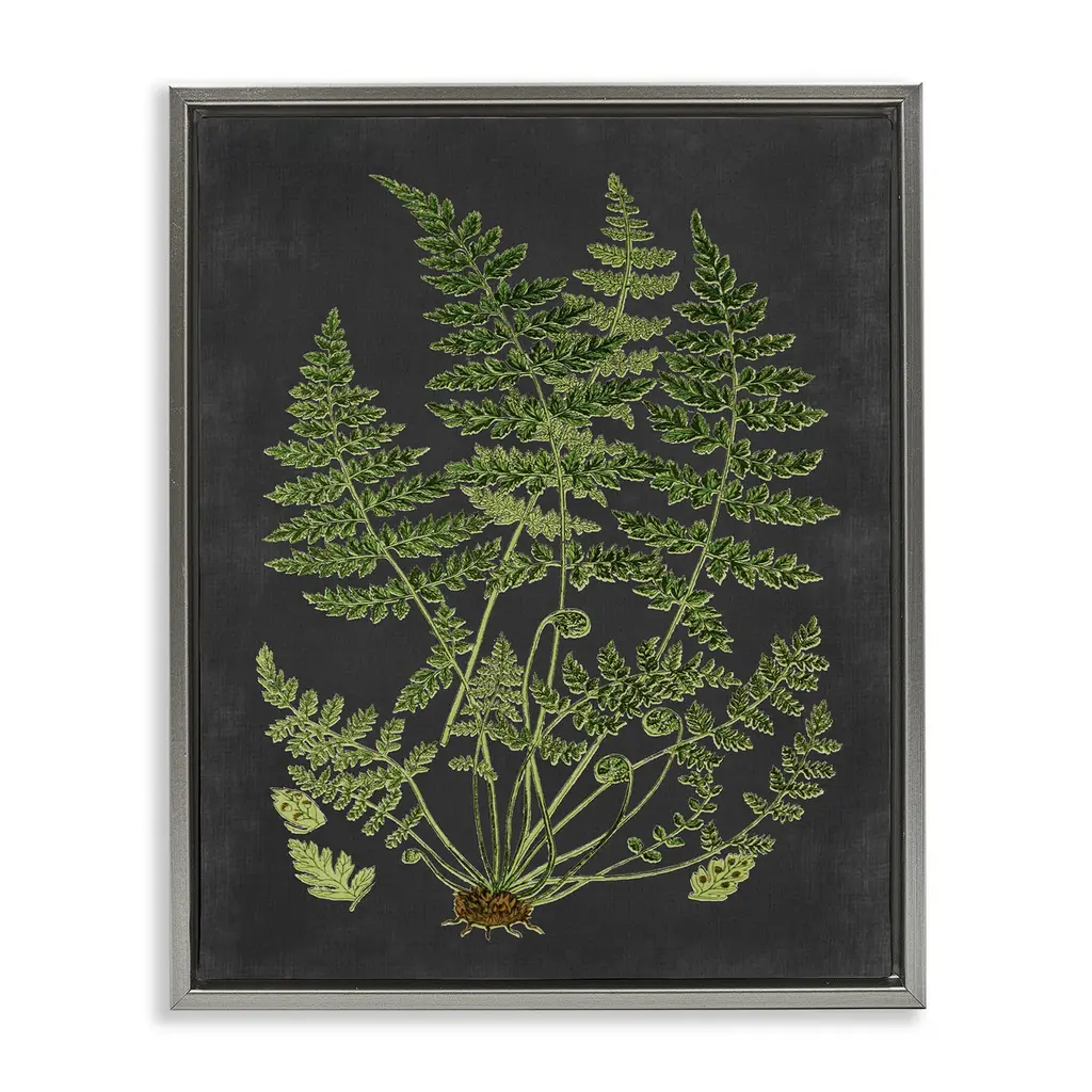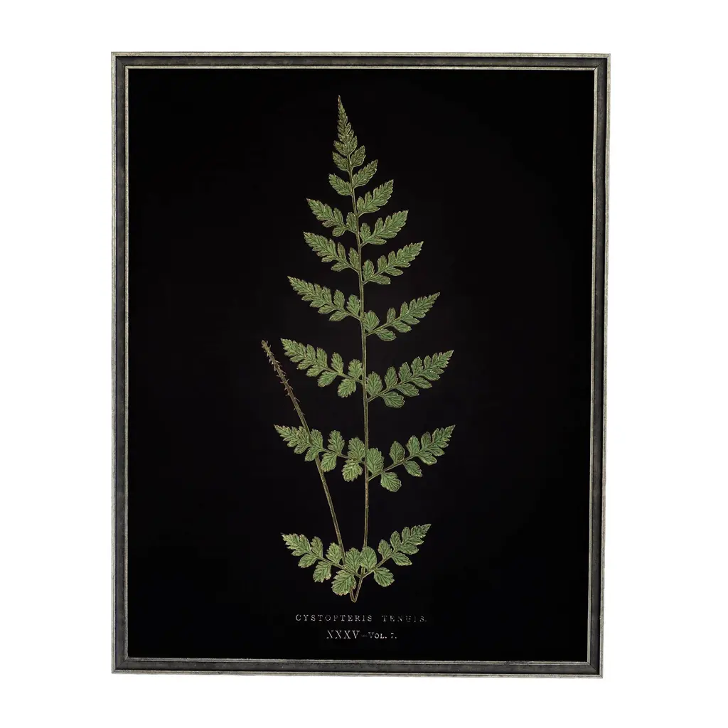 Showcasing the organic essence of botanical wall art, the natural allure of a fern is appreciated and depicted on an aged black background. Create a gallery wall with a variety of fern art in celebration of nature. This vibrant presentation easily compliments transitional settings.