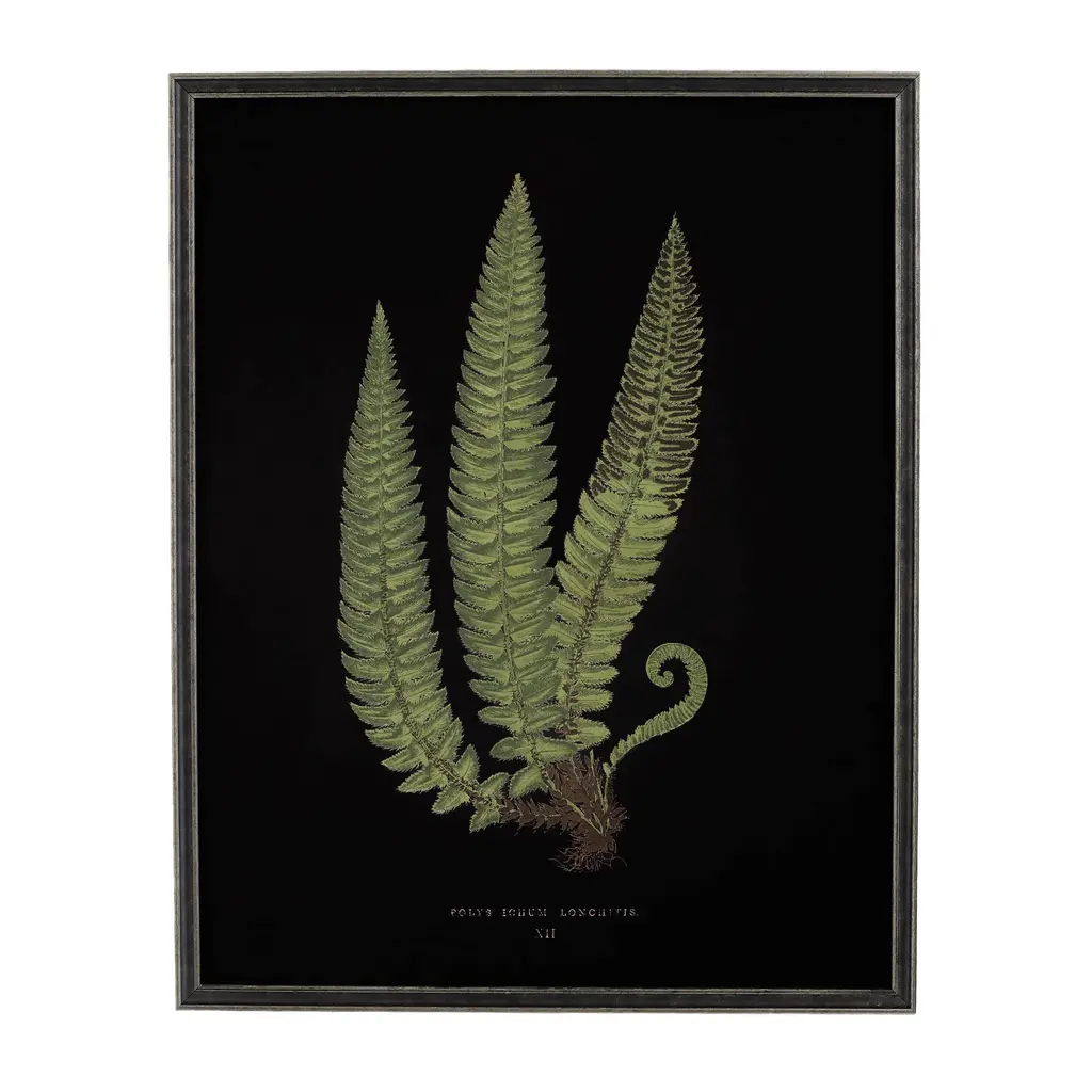 Showcasing the organic essence of botanical wall art, the natural allure of a fern is appreciated and depicted on an aged black background. Create a gallery wall with a variety of fern art in celebration of nature. This vibrant presentation easily compliments transitional settings.