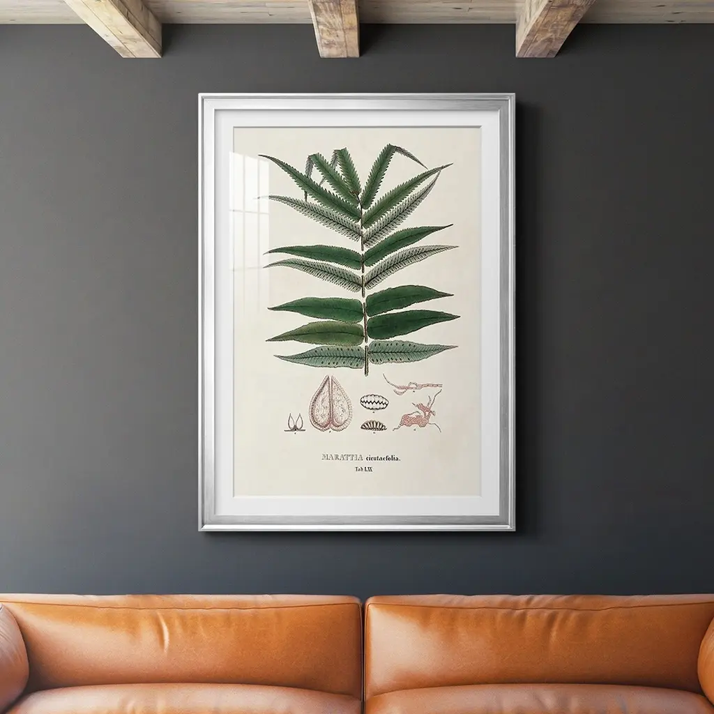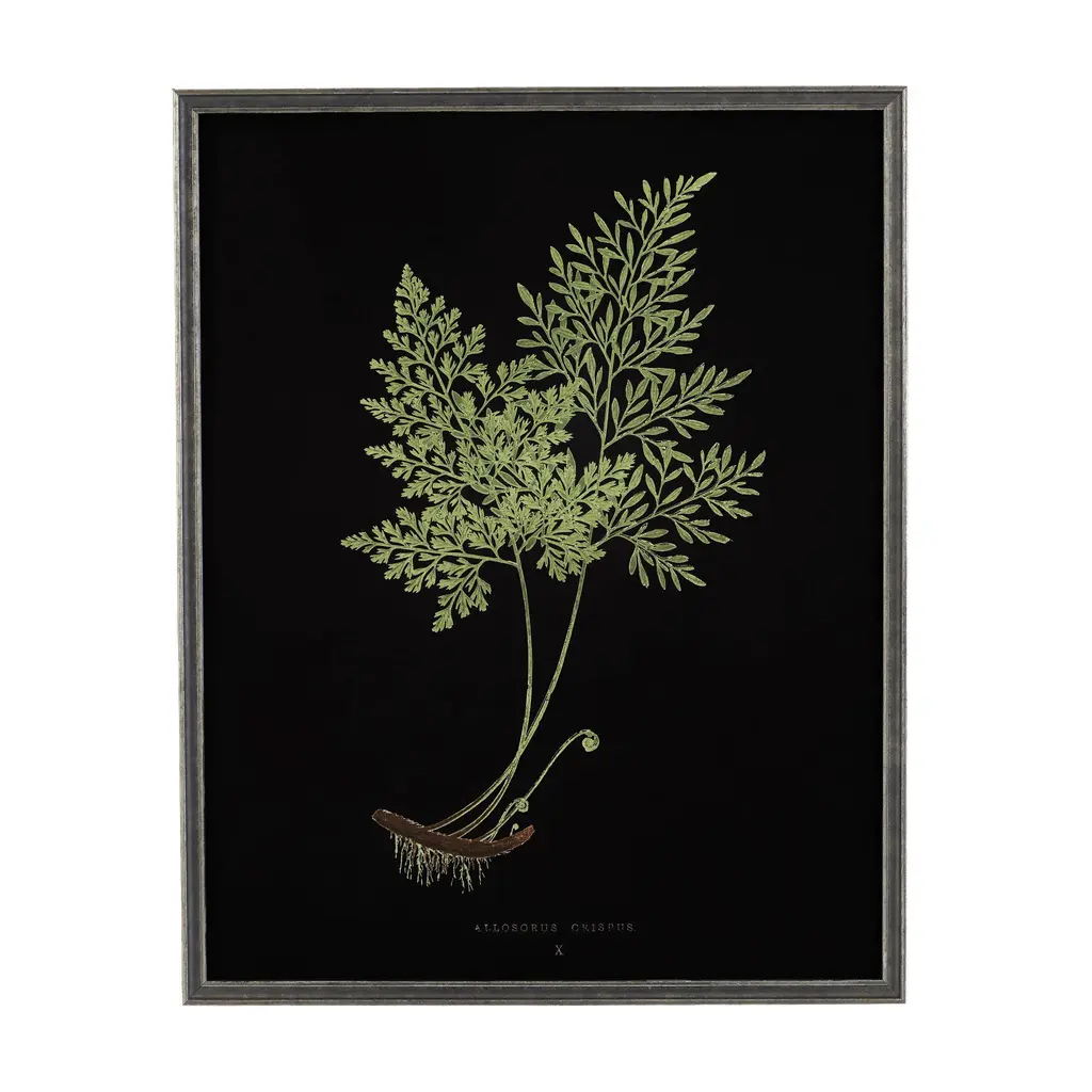 Showcasing the organic essence of botanical wall art, the natural allure of a fern is appreciated and depicted on an aged black background. Create a gallery wall with a variety of fern art in celebration of nature. This vibrant presentation easily compliments transitional settings.