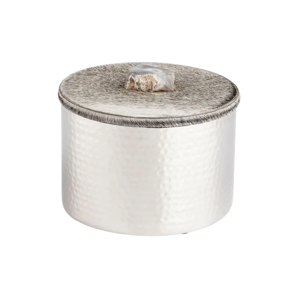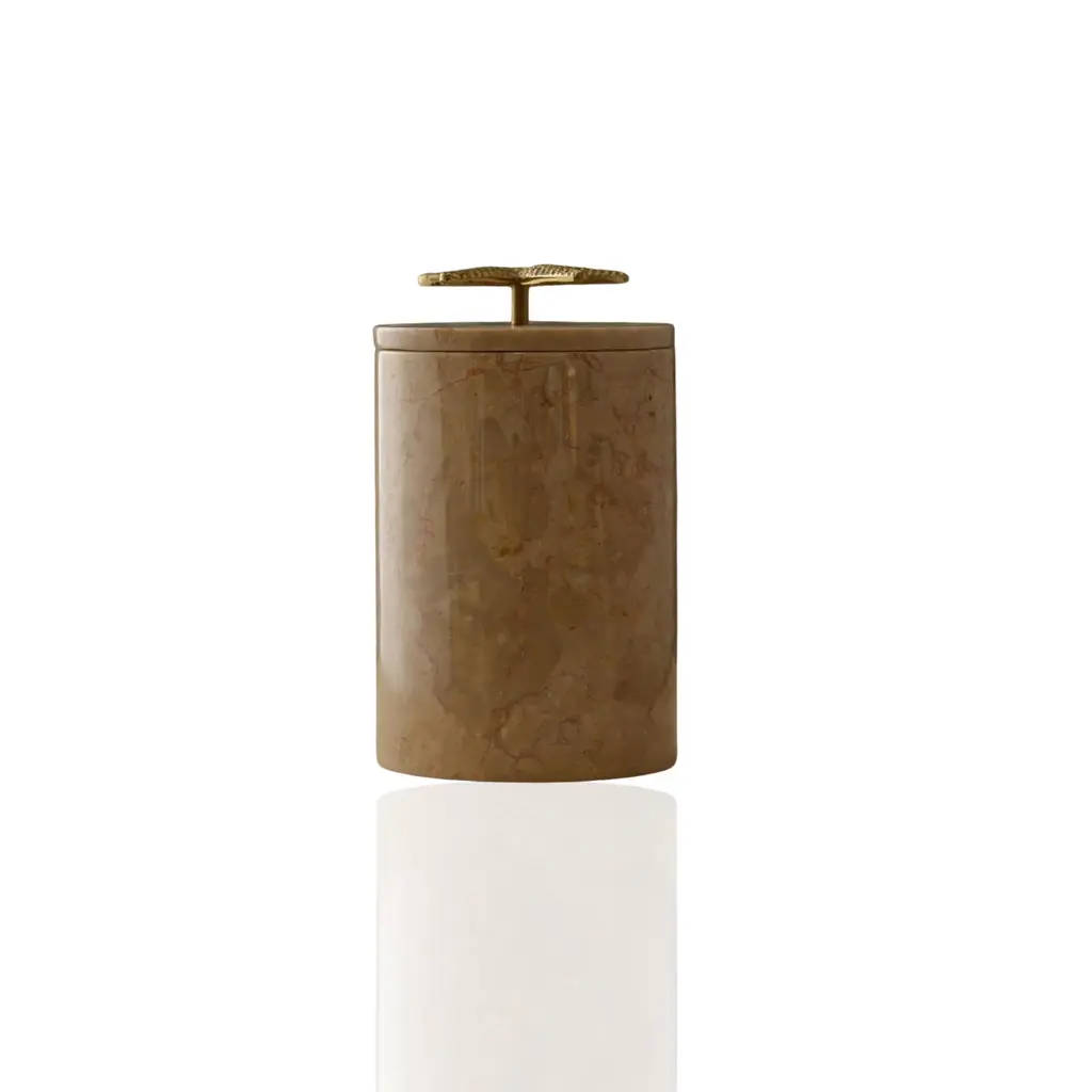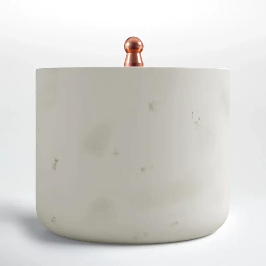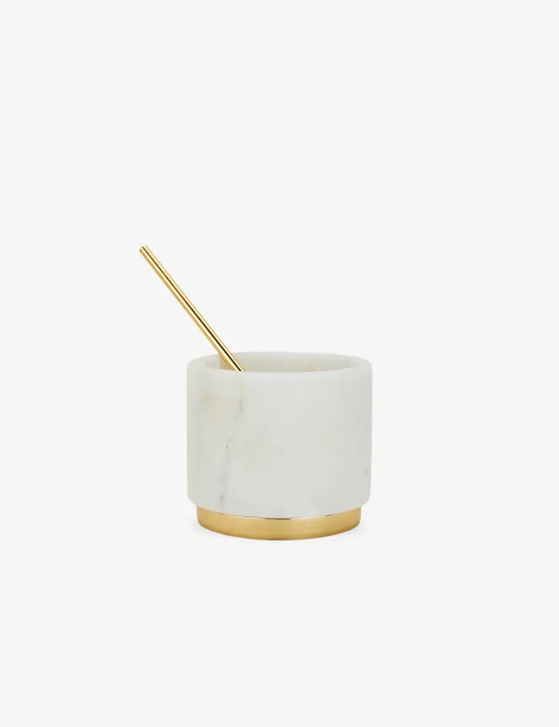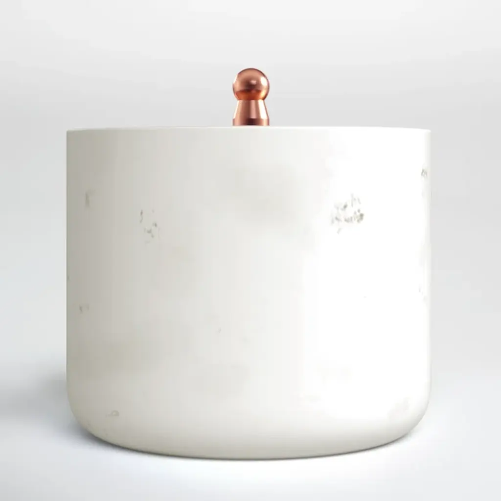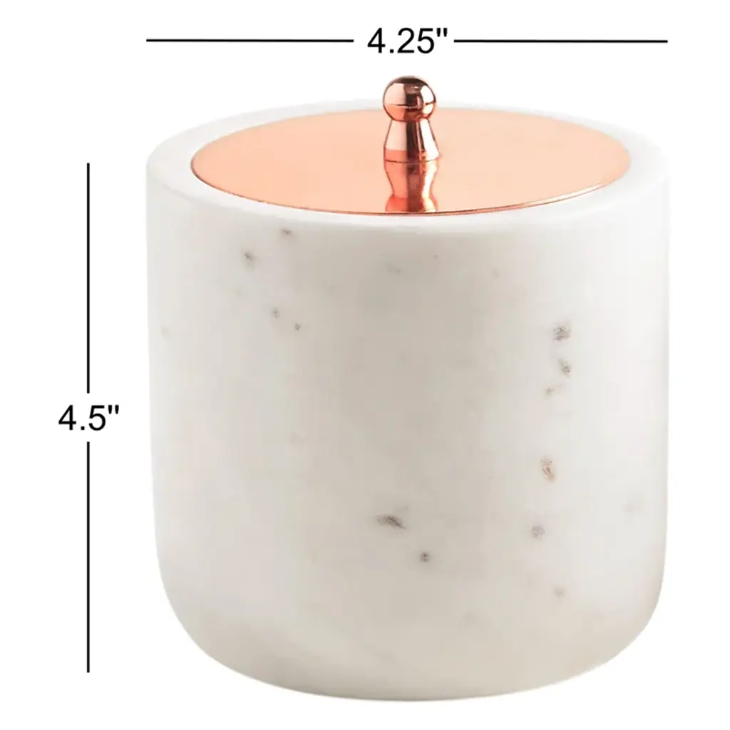 Add an elevated accent to your bathroom or powder room with this freestanding storage container. It's made from marble in a whitewashed hue, and it features veining throughout for an organic look. We love how this round pot is sized just right for cotton balls or swabs, so it helps keep your counter or vanity extra tidy. Plus, it comes with a gleaming, rose gold-colored lid that reminds us of all our favorite fashion accessories.