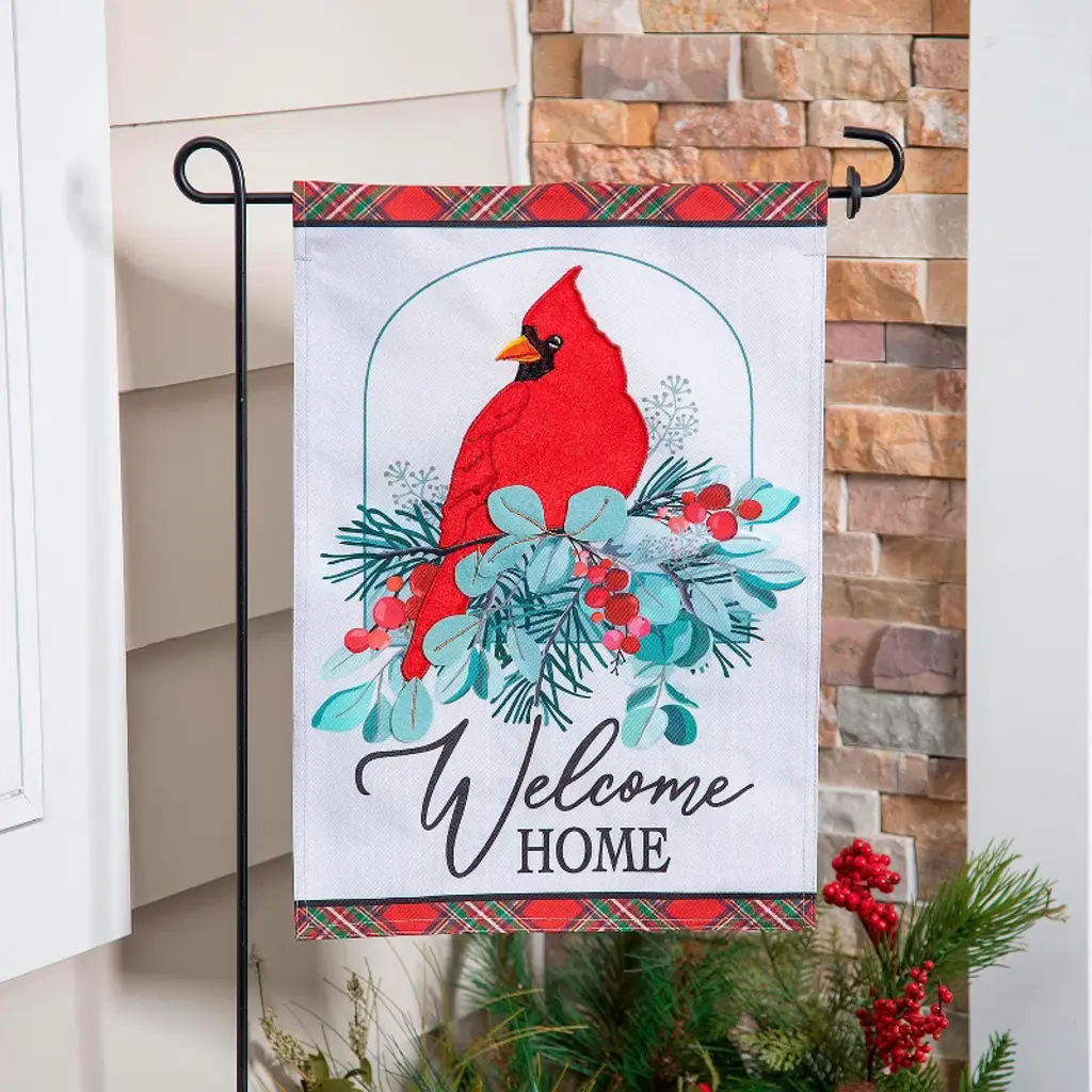 This charming flag adds an extra special touch to any home. It features a beautiful design of finches and flowers. Each Evergreen applique flag is carefully crafted from multiple layers of 310 denier nylon made from recycled plastic that can withstand a variety of weather conditions. We combine pieces of fade-resistant, strong fabric with tight, detailed stitching to create a dimensional mosaic effect. The soft yet heavyweight material illuminates beautifully in sunlight. Each flag features a sleeve that fits standard flagpoles or stands, sold separately. Due to the nature of the packaging, wrinkling may have occurred. Once item is unfolded and mounted on hardware, the creases will naturally fall out. Spot clean only. Never put in a dryer. When not in use, flags can be hung in a closet or placed in a storage container.