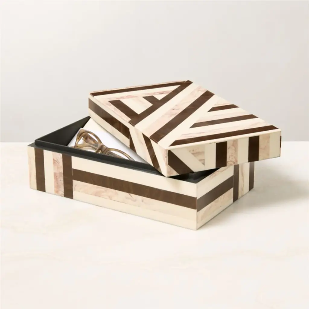 Refined storage box by fashion-designer-turned-home-designer Brett Beldock features a sleek geometric tile pattern inlaid by hand. Acclaimed for her crisp, yet off-beat approach to decor, Beldock drew inspiration for this one-of-a-kind design from her extensive knowledge of art and fashion. CB2 exclusive.
