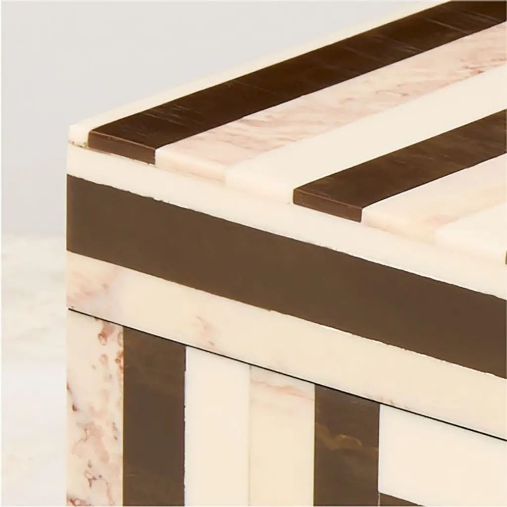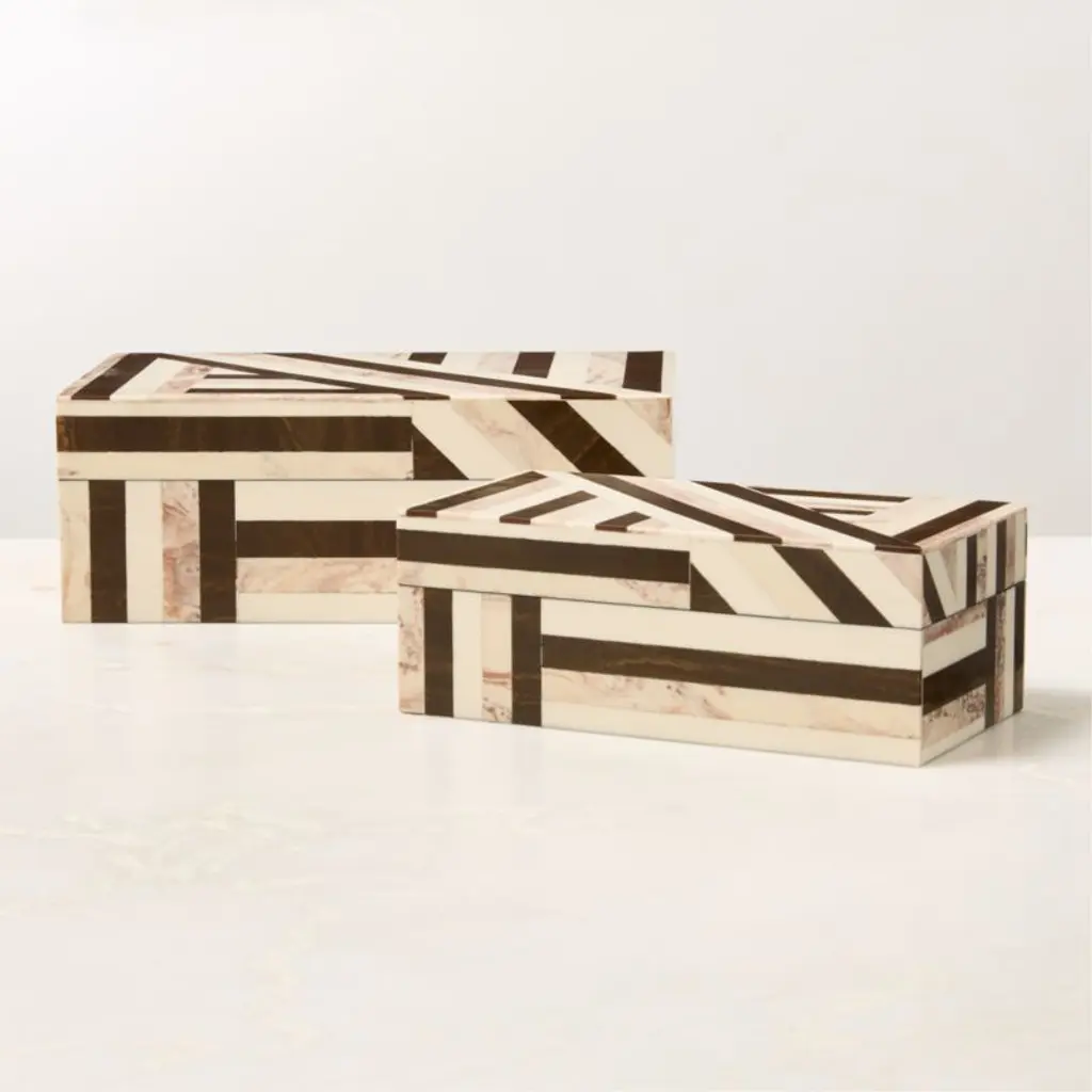 Refined storage box by fashion-designer-turned-home-designer Brett Beldock features a sleek geometric tile pattern inlaid by hand. Acclaimed for her crisp, yet off-beat approach to decor, Beldock drew inspiration for this one-of-a-kind design from her extensive knowledge of art and fashion. CB2 exclusive.