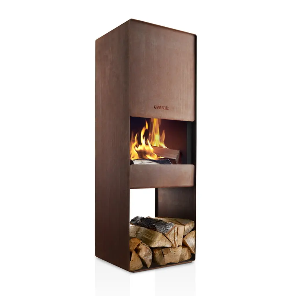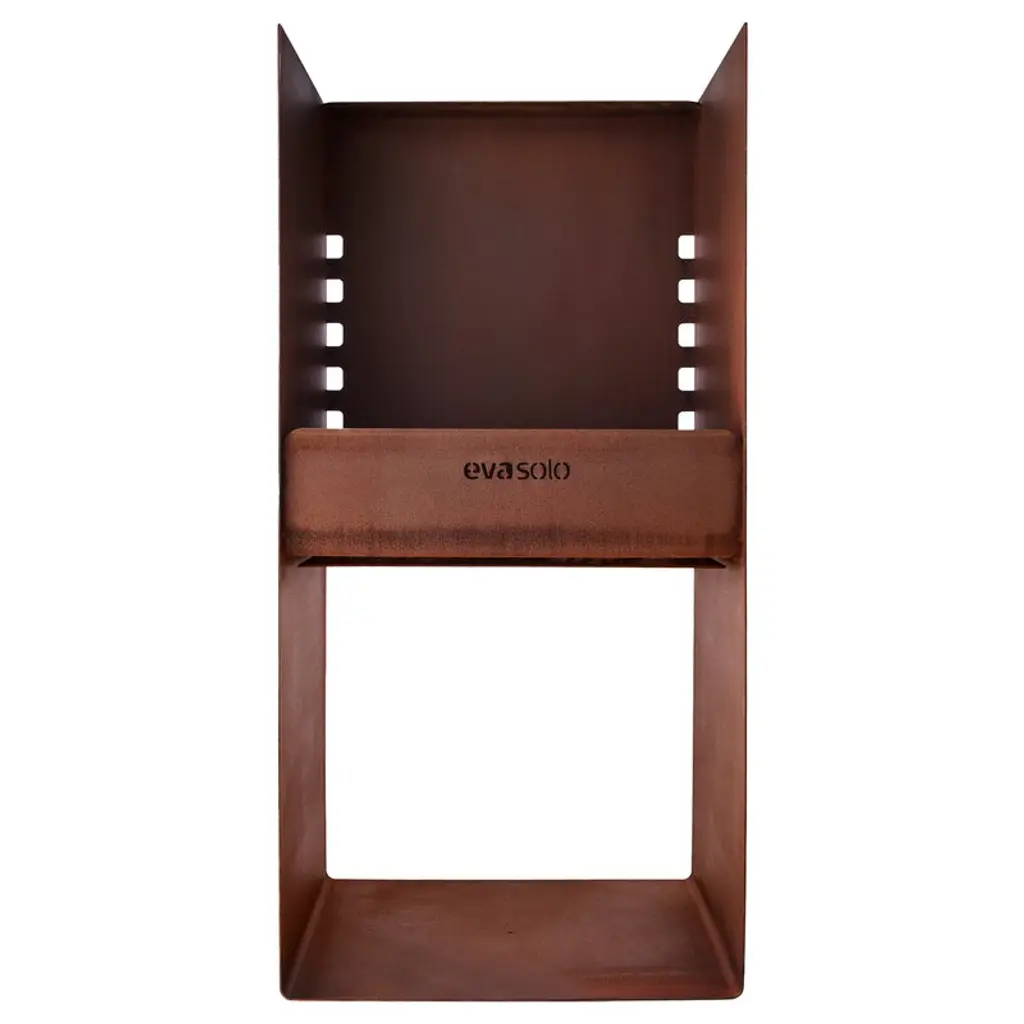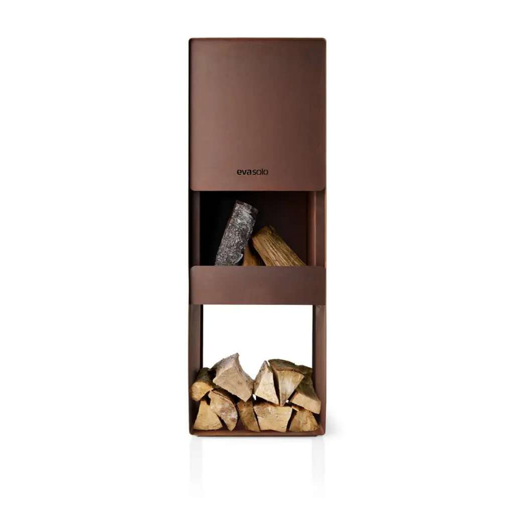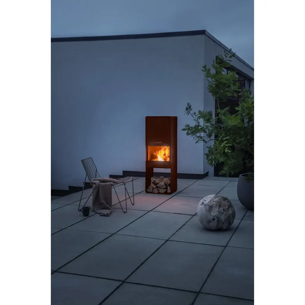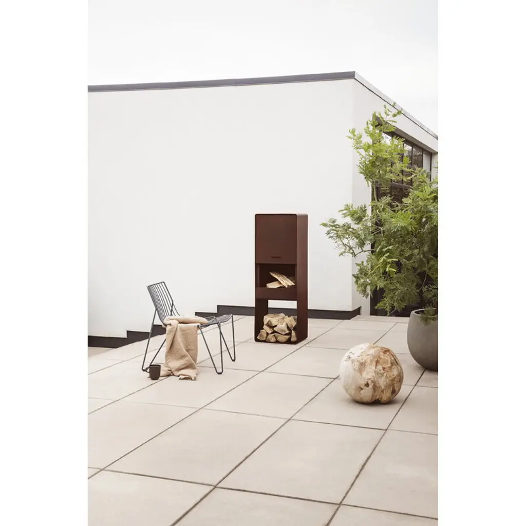 Eva Solo's FireBox garden wood burner infuses your outdoor living space with a cozy atmosphere – the kind that only the crackling of an open fire can bring. The modern and minimalist outdoor fireplace is ideal for a variety of settings from the patio or garden of your home to the summer cottage or vacation home. FireBox is made of top-quality corten steel, an exceptionally weather-resistant material, which ensures that the burner can be left outdoors all year round. What makes the material special is the patina, a stable layer of rust on its surface, that serves as a protective, corrosion-resistant barrier, making sure that the steel won't rust all the way through. The burner will continue to patinate as it is exposed to weather and use which means that the color and surface patterns of the burner will change and develop over time. Along with the fascinating material, the appearance of the FireBox outdoor log burner is characterized by its sleek, reduced design that not only pleases the eye but is also practical: the burner features an integrated firewood holder underneath the actual firebox, allowing you to easily add firewood to the fire. It also has a built-in chimney that directs the smoke out from the back of the burner. The FireBox outdoor wood burner is delivered assembled and ready to use.