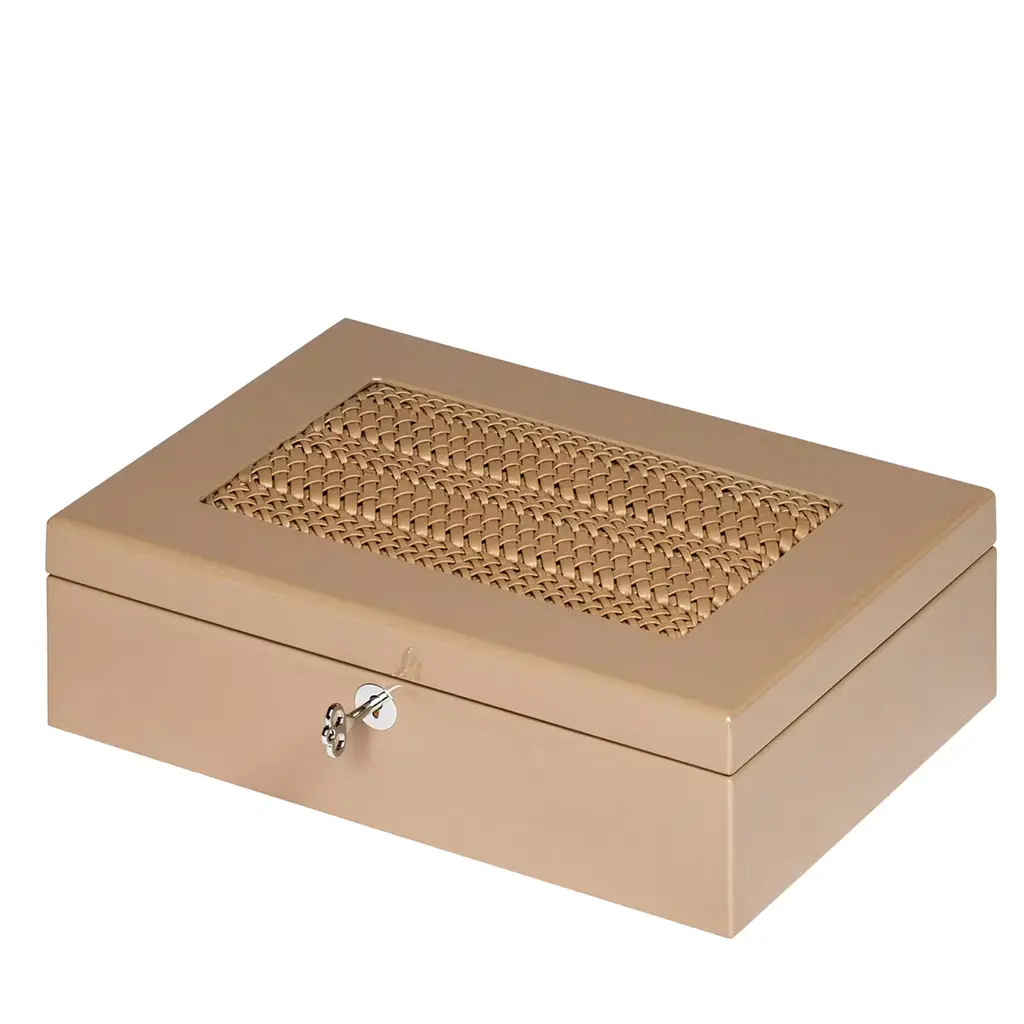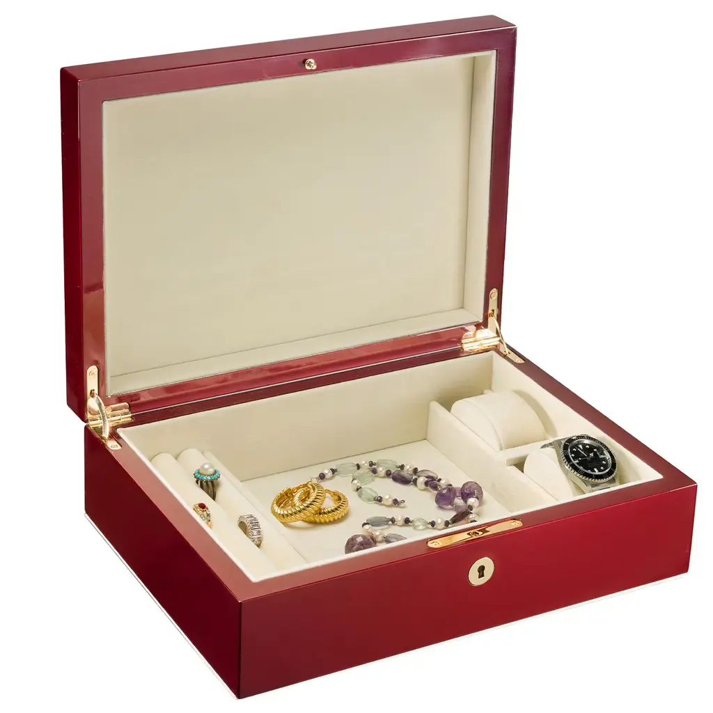 A clean and essential design of sophisticated contemporary flair, this jewelry box is distinguished by a superb ruby color obtained with a brushed and polished polyester finish. Handcrafted of wood, it is enriched with gold-finished metal details and lined with ivory-colored soft Alcantara. The piece features a ring and two watch holders, and two empty compartments one of which is removable.