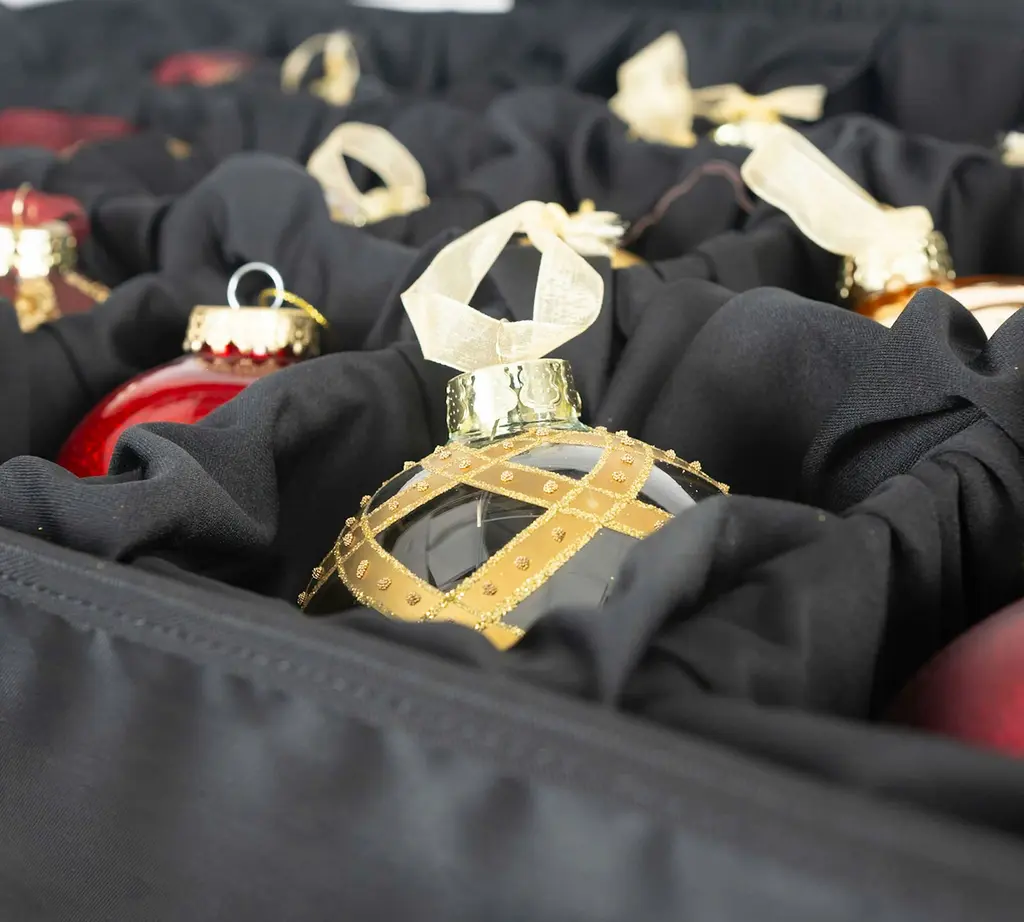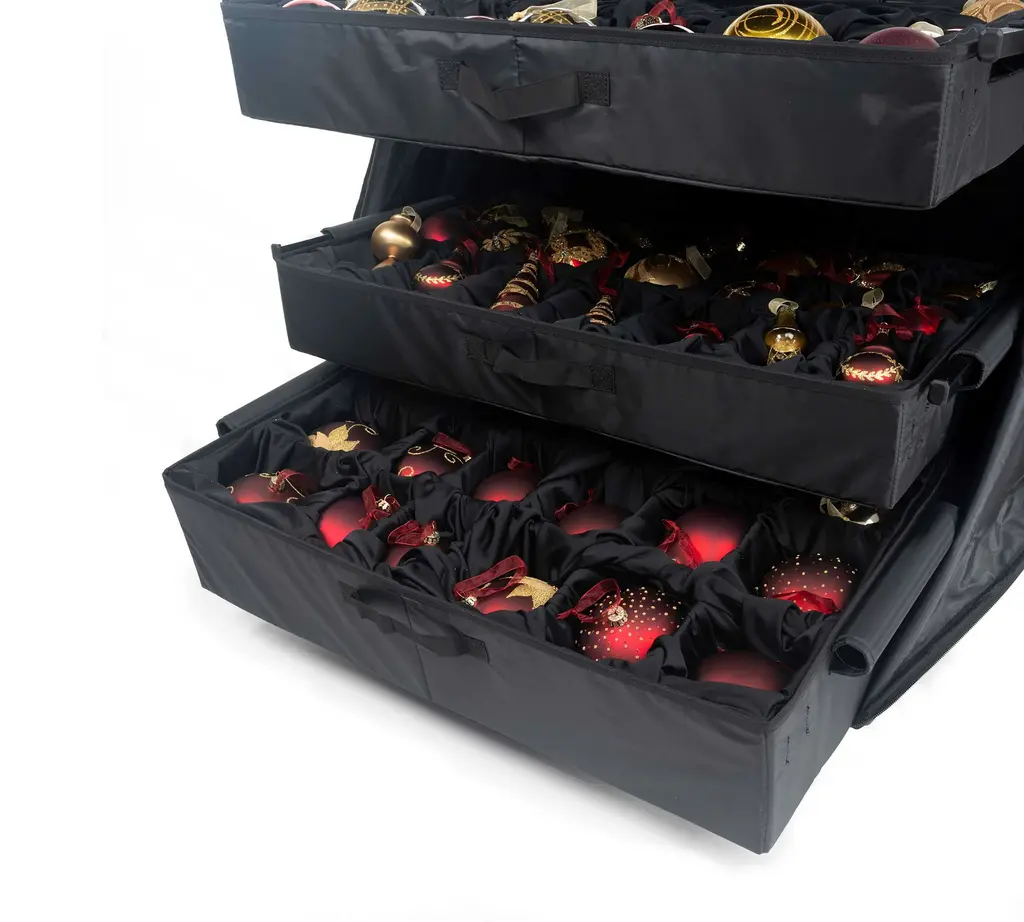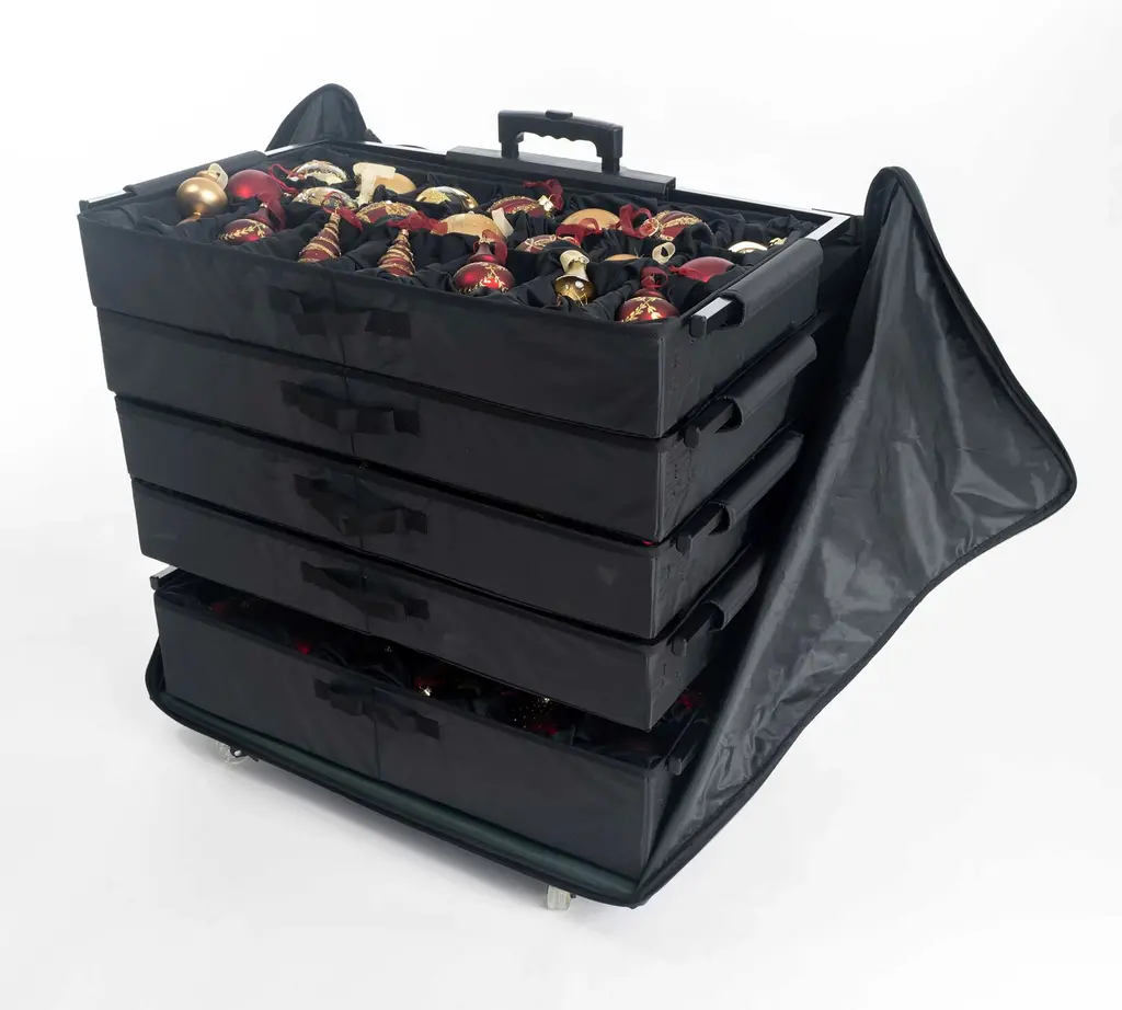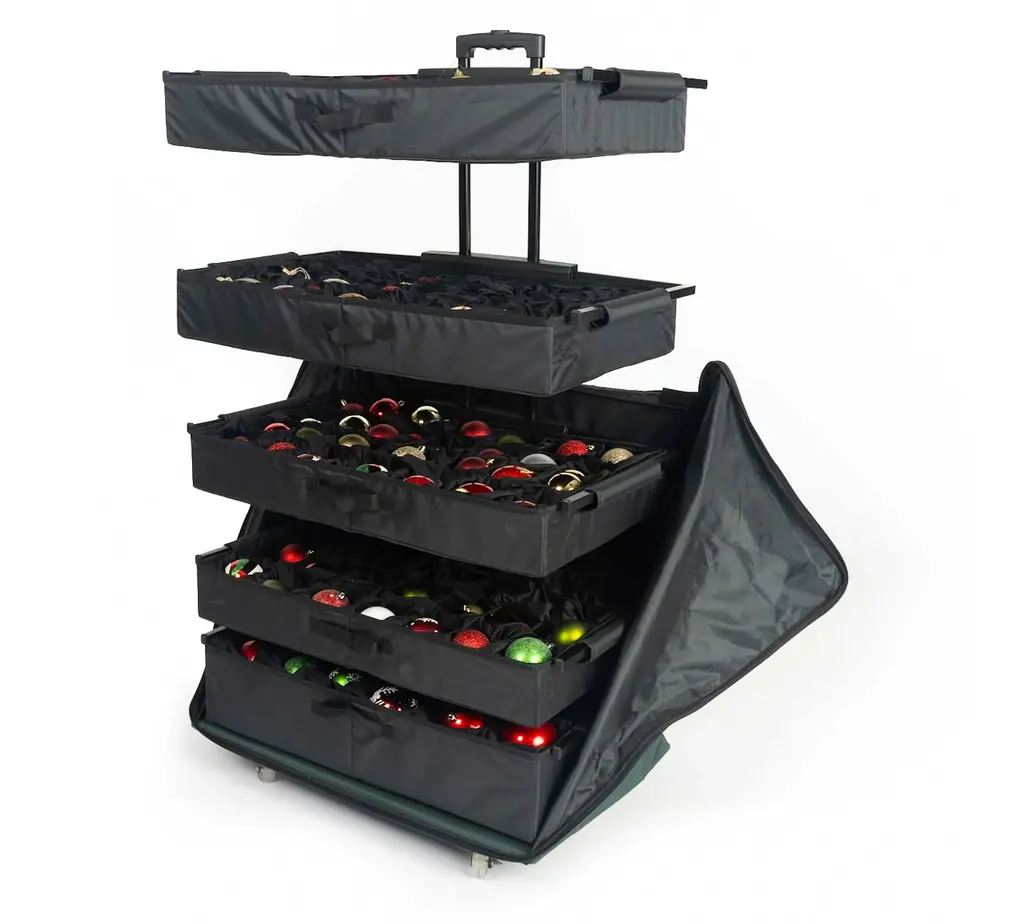 Still throwing all the thingamabobs that make the season merry and bright into a dark, tangled cupboard when not in use? This compact bag takes the muss and fuss out of storing decorations and decorating. The bag has a waterproof exterior and a conveniently extending handle. Inside, five velour-lined trays contain compartments that can be adjusted to fit snugly around ornaments of various sizes. Each tray can be telescoped upward or lifted out entirely to offer easy access and minimize the risk of breakage.