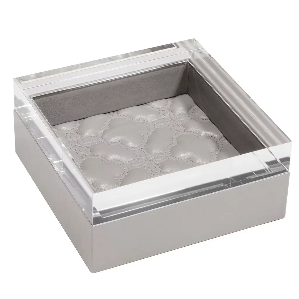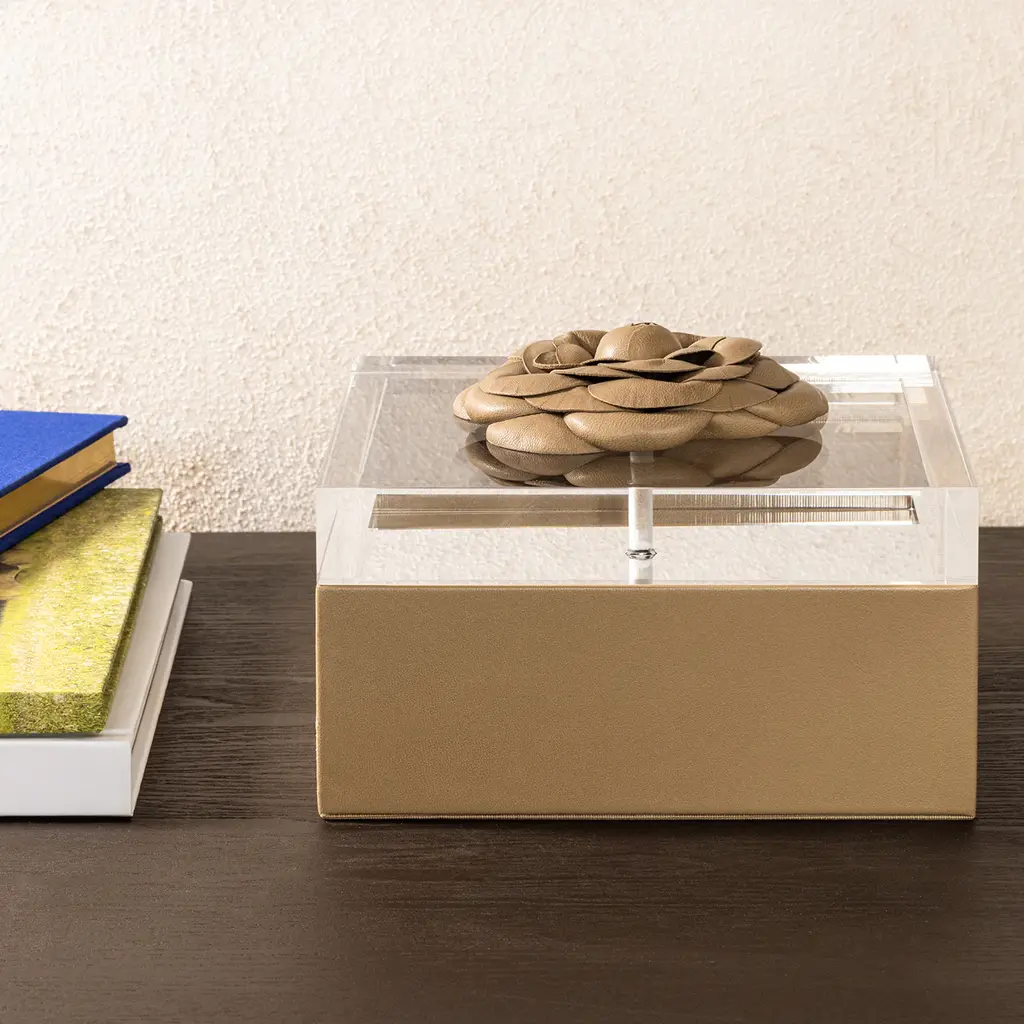 Fleur square box is covered with the finest leather, which makes its appearance timeless, perfect for all kinds of decorations and environments, from classic to modern spaces. It is available in different sizes and boasts an acrylic lid with a leather flower on the top. Internally it has a quilted diamond padded lining.