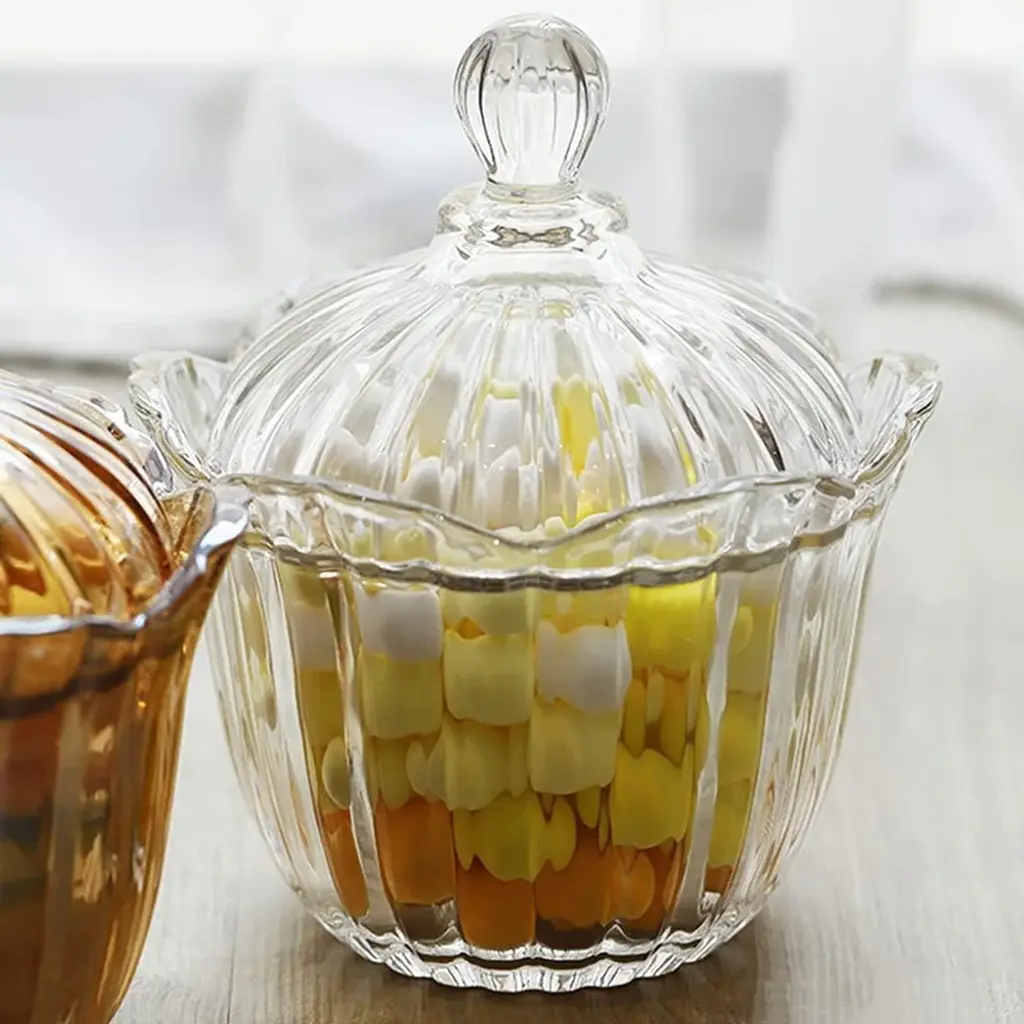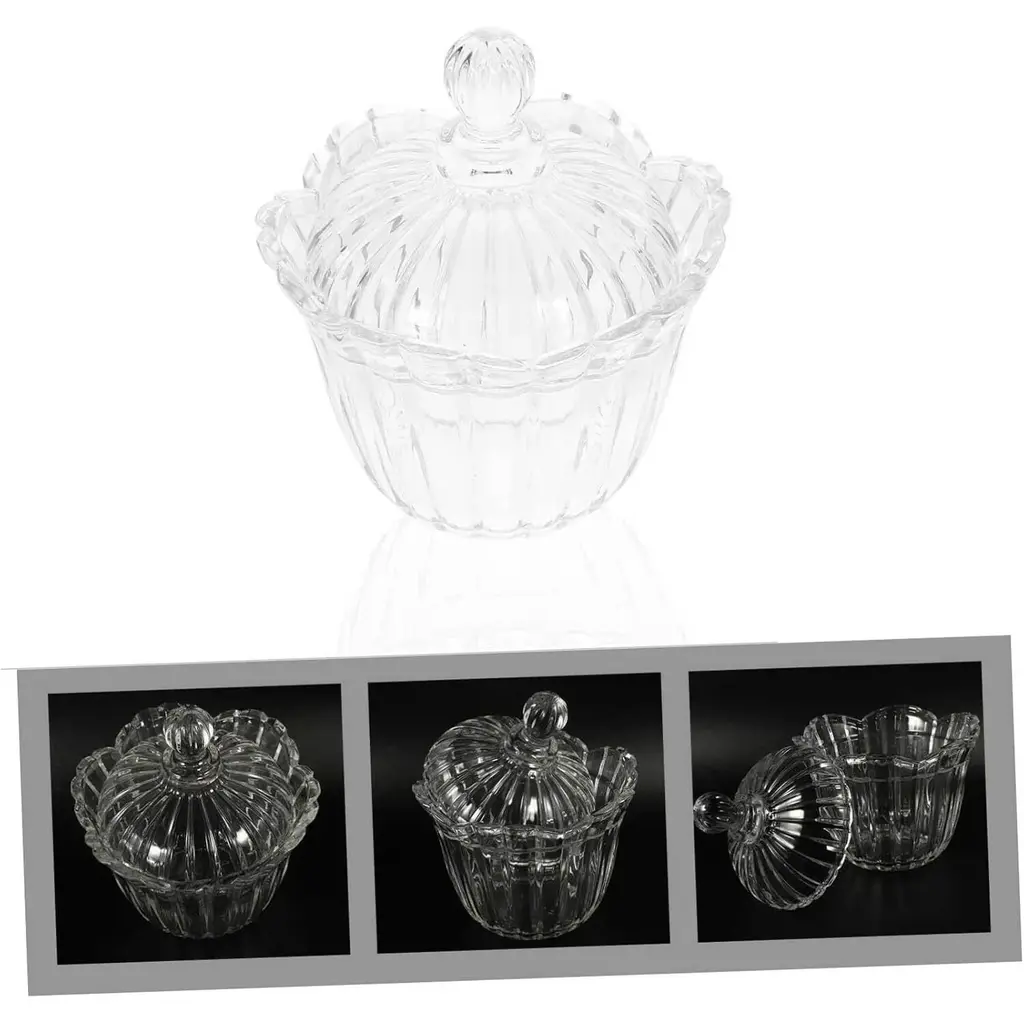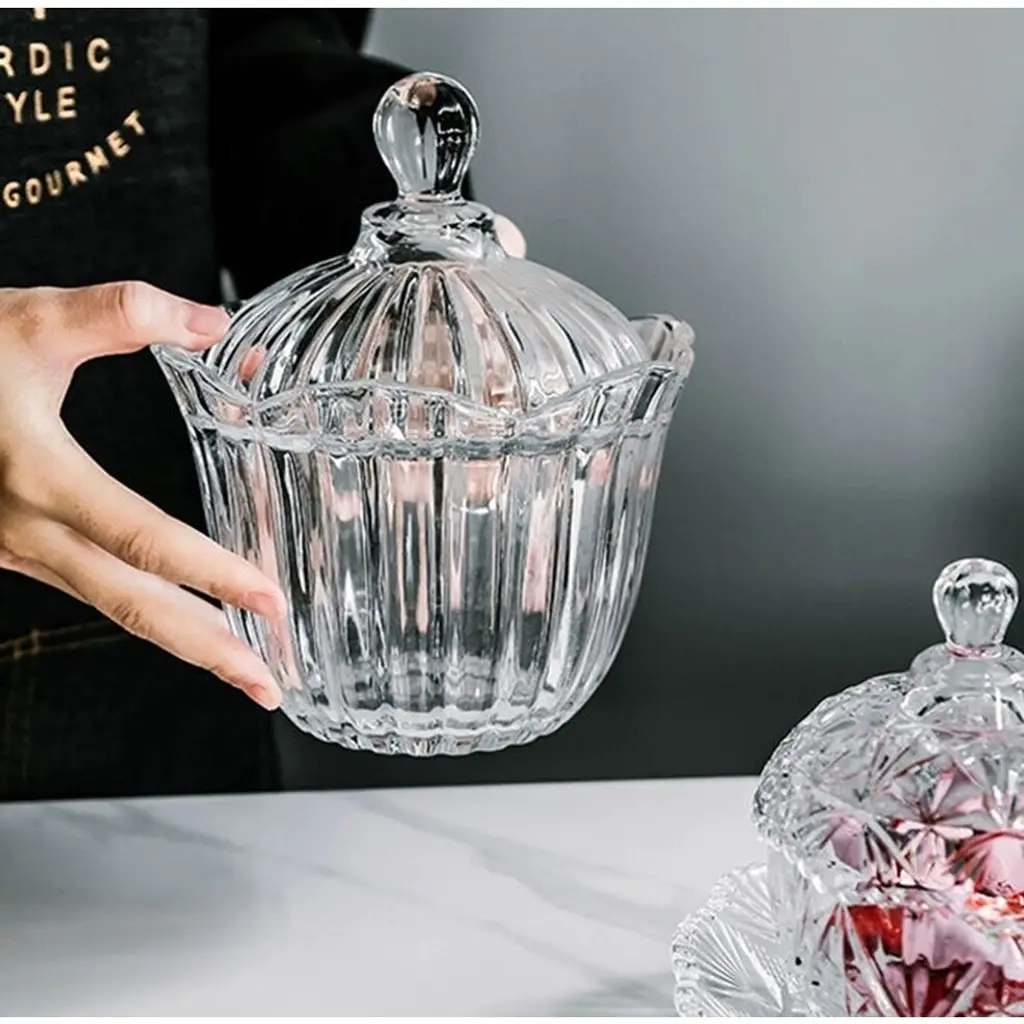 Flower Mouth Crown Shape Clear Engraving Glass Sugar Box With Glass Lid - 6.1"d X 7.1"h - 6.1"d X 7.1"h