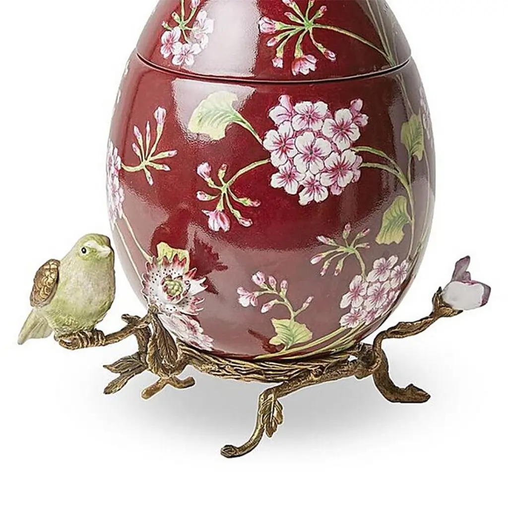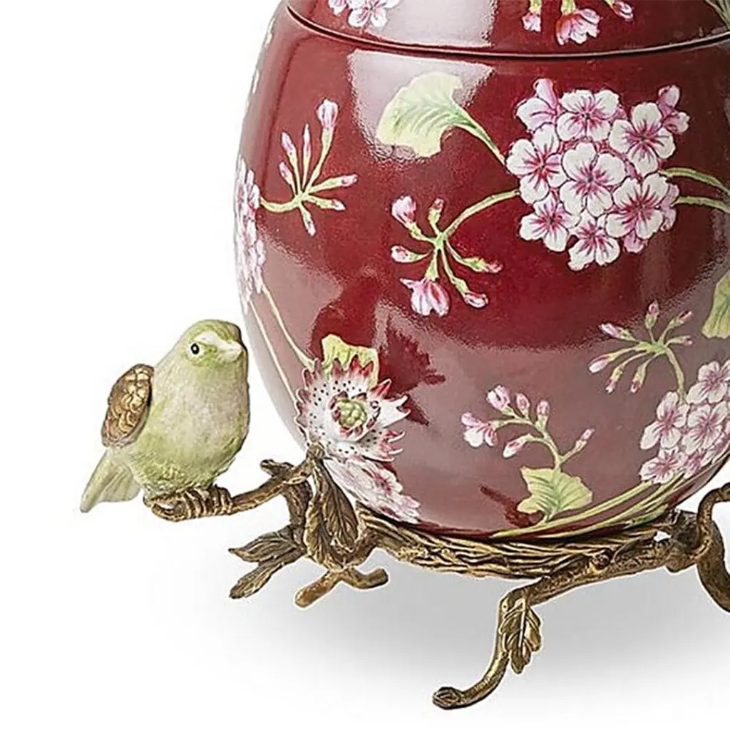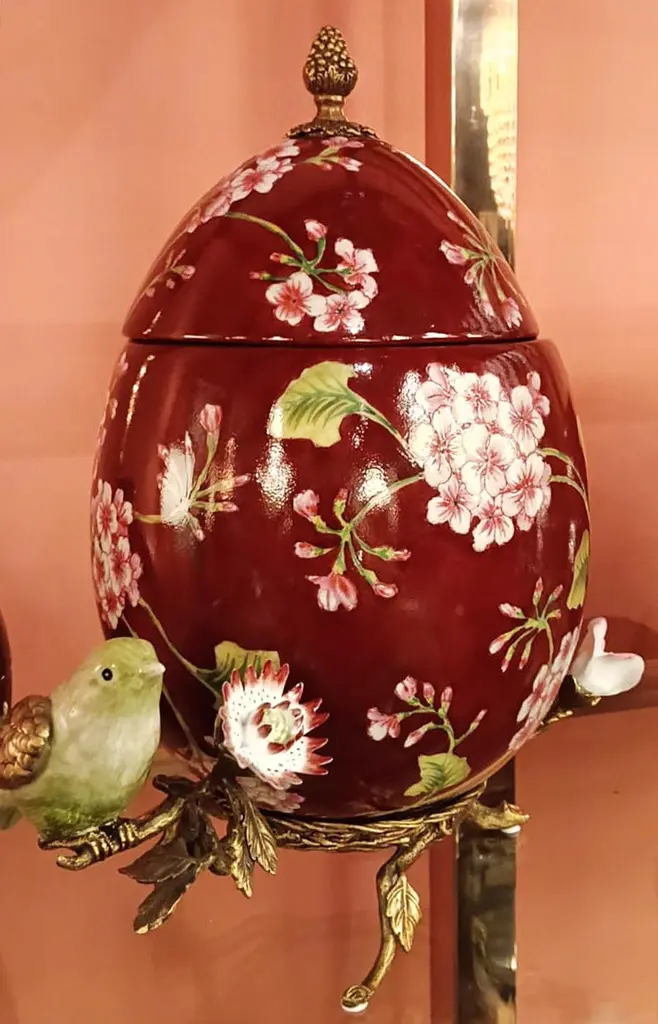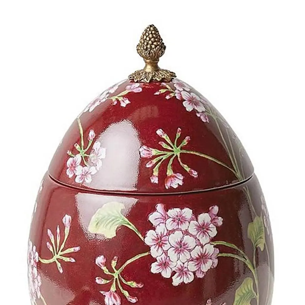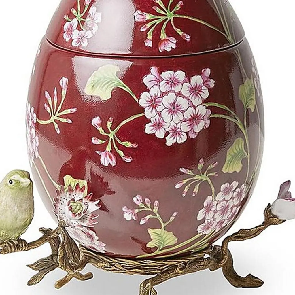 Box Flowers Red Egg all in hand-crafted porcelain,hand-painted porcelain with lid. With solid brass base with green bird in porcelain.