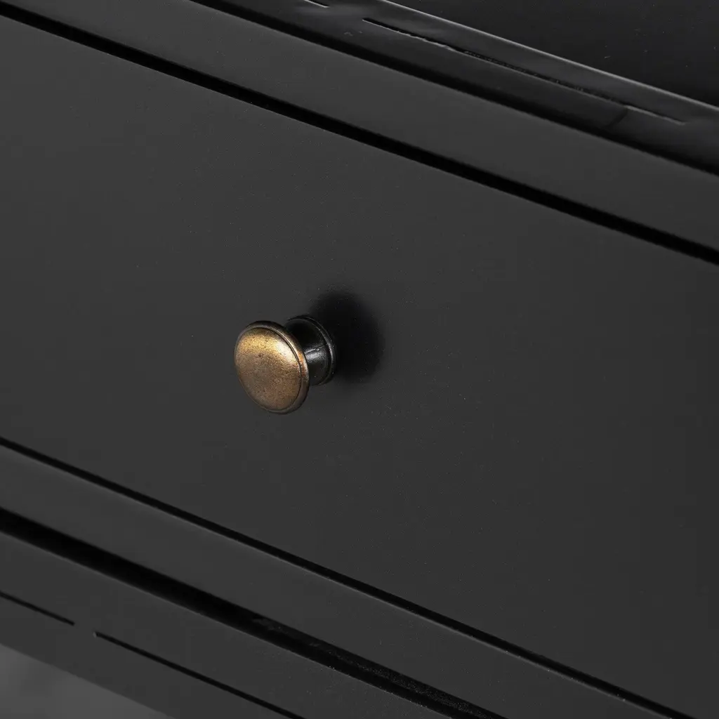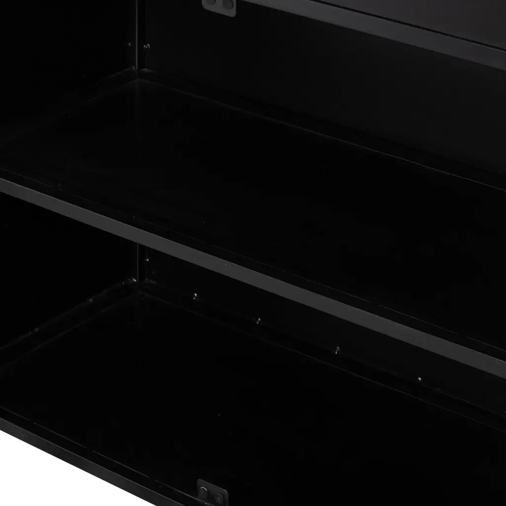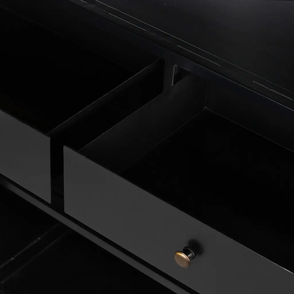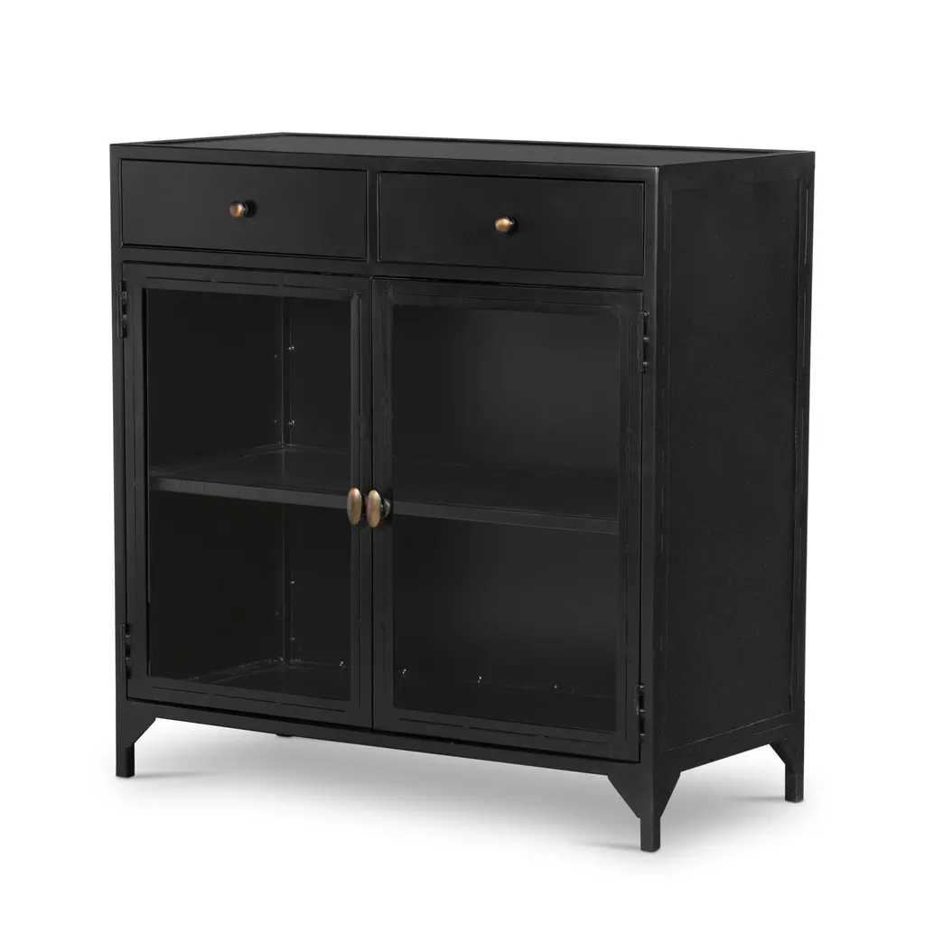 Shadowbox-style cabinetry gives your inner collector a place to play. Frame prized possessions in a glass enclosure with matte-black metal and brass knobs.