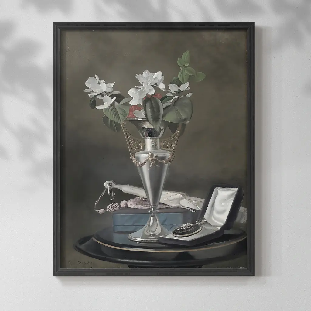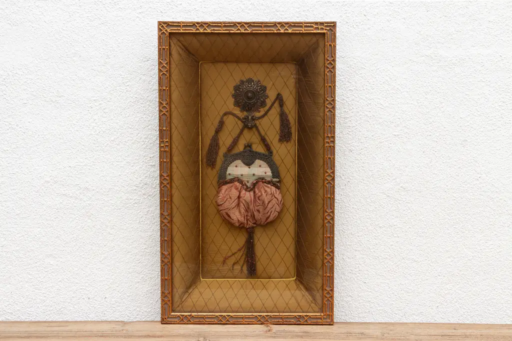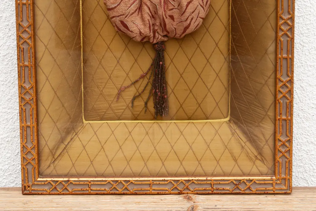 A beautifully framed shadow box showcasing an antique purse, likely from the late 19th or early 20th century. Measuring 18" wide by 31" high, the display highlights the purse’s intricate details, delicate fabric, and ornate embellishments. The elegant presentation enhances its vintage charm, making it a striking decorative accent. Perfect as a standalone piece or part of a collection, it adds timeless glamour and historical depth to any space.