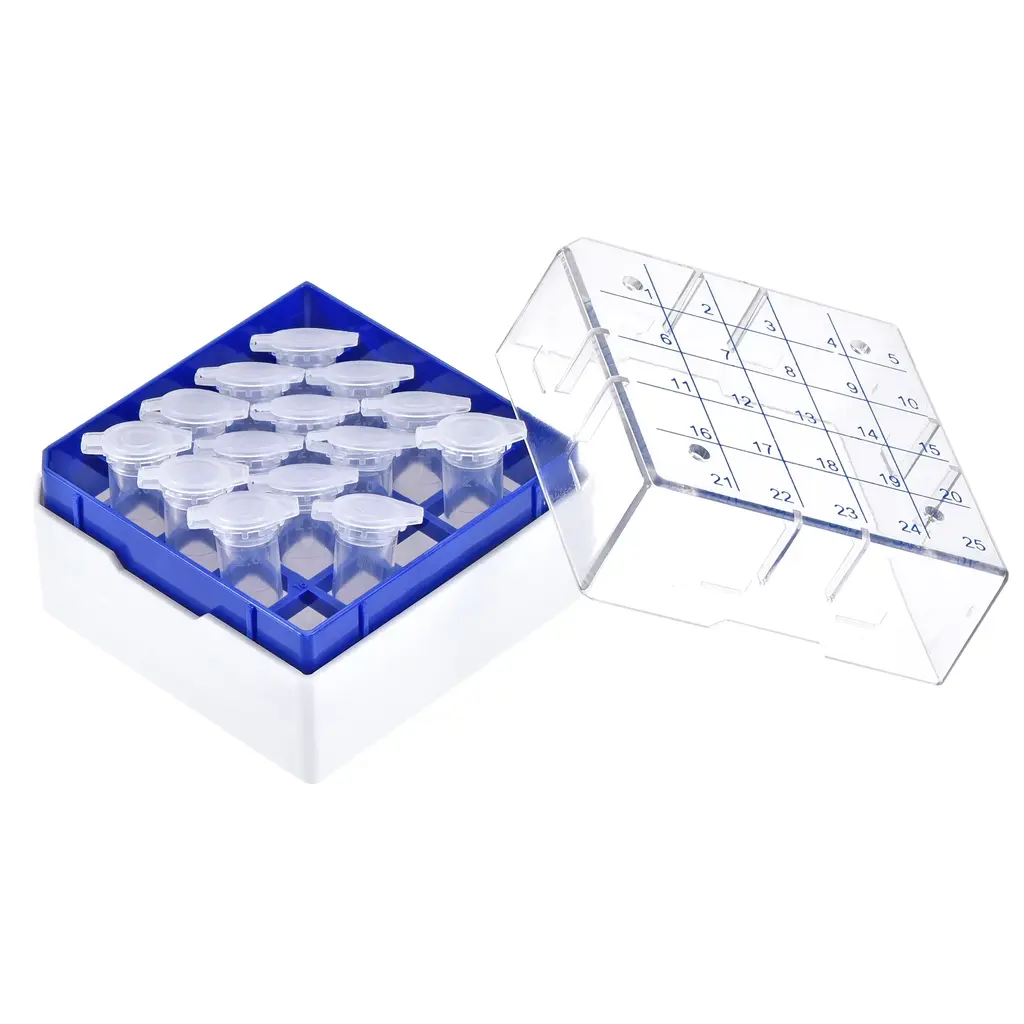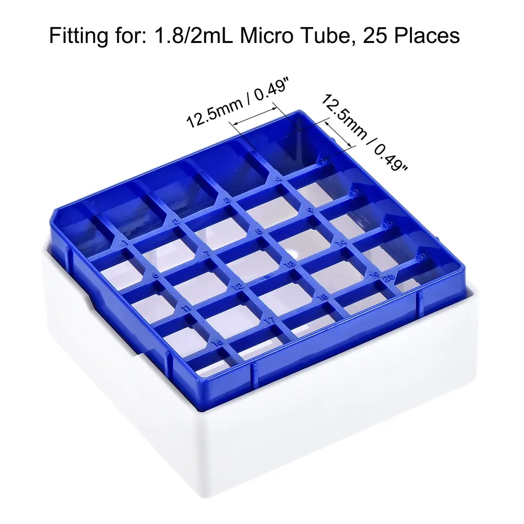 Keep your freezer tubes organized and secure with the Freezer Tube Box 25 Places Rack. This durable rack is designed to fit 1.8/2ml microcentrifuge tubes, with 25 places in a 5x5 array. Made of waterproof polypropylene plastic, this rack is freezer safe and can withstand temperatures ranging from -150 to 120 degrees Celsius. Each hole is inscribed with numbers for easy tube tracking. Whether you're storing laboratory freezer tubes or centrifuge tubes, this rack will keep your samples safe and organized. Tubes not included.Features: