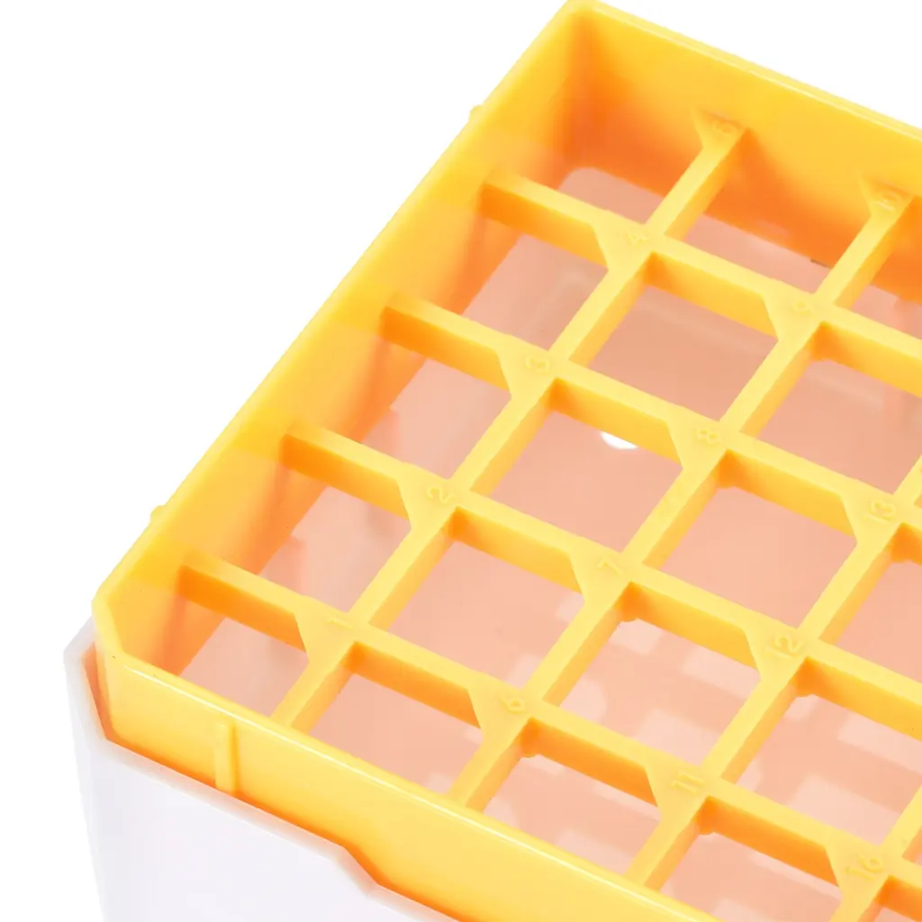 [Size] - Fitting for: 1.8/2mL Micro Tube, 25 Places: Overall Size: 75x75x54mm / 2.95*2.95*2.13 Inch (L*W*H); Hole Size: 12.5x12.5mm / 0.49*0.49 Inch; Hole Depth: 26mm / 1.02 Inch[Material] - Constructed of polypropylene plastic and it is waterproof.[Freezer Safe] - Temperature Resistance Range: -150~120 ℃ / -238~248 ℉[Tracking Mark] - Inscribed with numbers for tracking tubes.[Application] - Widely used on holding laboratory freezer tubes or centrifuge tubes.(Tube are NOT included here)Description:1. Fit for 1.8/2ml freezer tubes, 5x5 array, 25 Places.2. Constructed of polypropylene plastic and it is waterproof.3. Inscribed with numbers for tracking tubes.4. Keeps your freezer tubes firmly inside while the box is closed.5. Widely used on holding laboratory freezer tubes or centrifuge tubes.Specification:Material: Polypropylene PlasticOverall Size: 75x75x54mm / 2.95*2.95*2.13 Inch (L*W*H)Hole Size: 12.5x12.5mm / 0.49*0.49 InchHole Depth: 26mm / 1.02 InchFitting for: 1.8/2mL Micro Tube, 25 PlacesPackage Content: 1 x Freezer Tube Box
