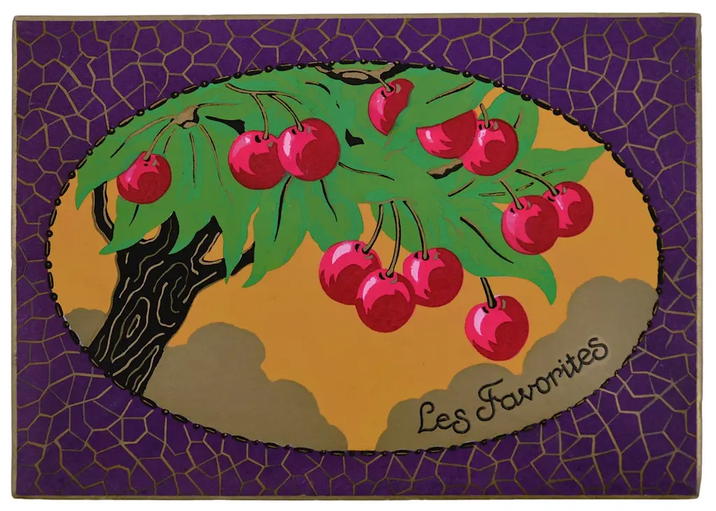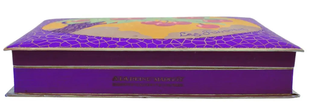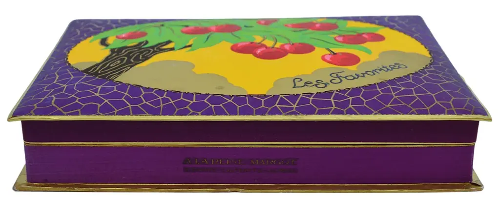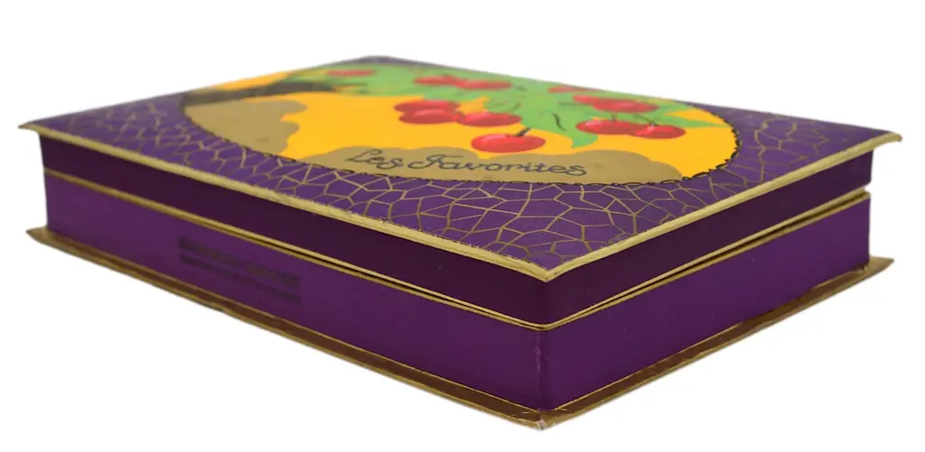 French Art Deco chocolate box, 1910s. Without chocolate inside of course. A La Reine Margot, Biarritz, Cauterets, Lourdes. Cardboard box decorated with a gouache drawing typical of this period. We have 3 boxes which are offered individually. Width: (21cm), Depth: (15cm), Height: (4cm). Marked "Les Favorites" in the pattern of the top and "Biarritz - Cauterets - Lourdes" on the font side. Some traces of age, but a nice condition for its age.