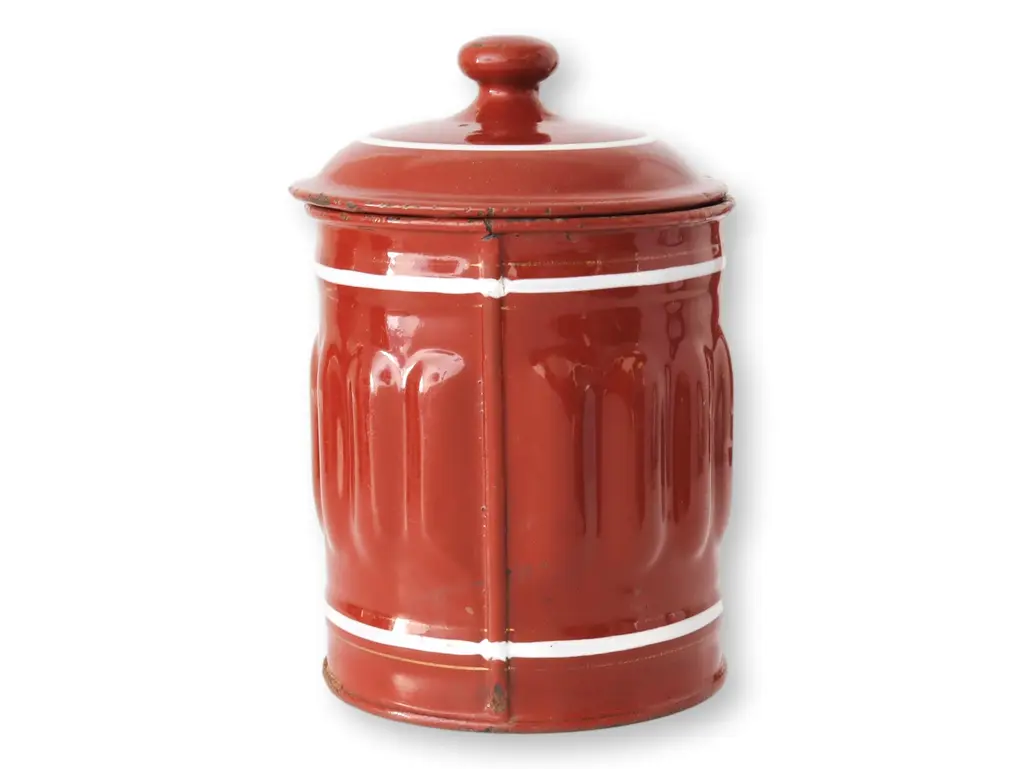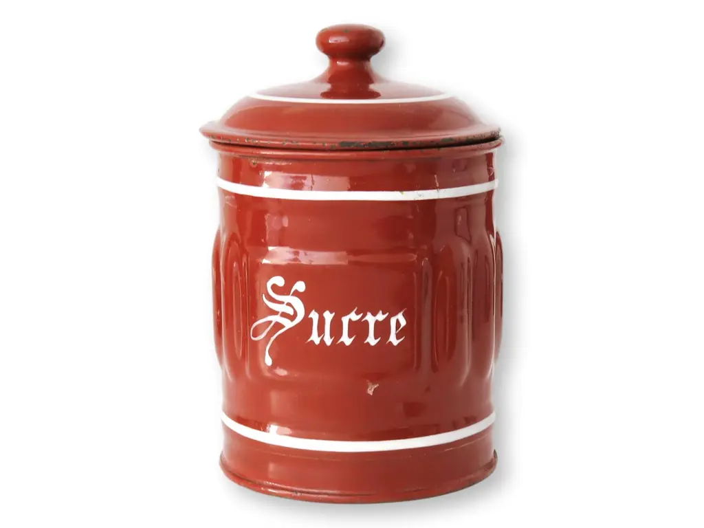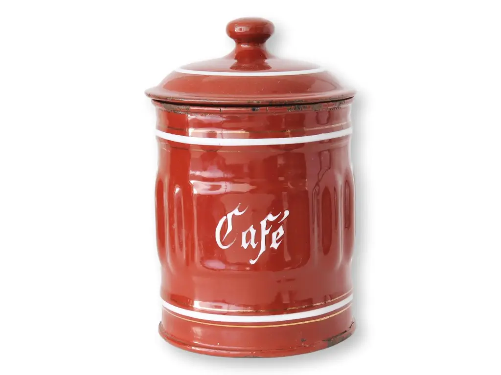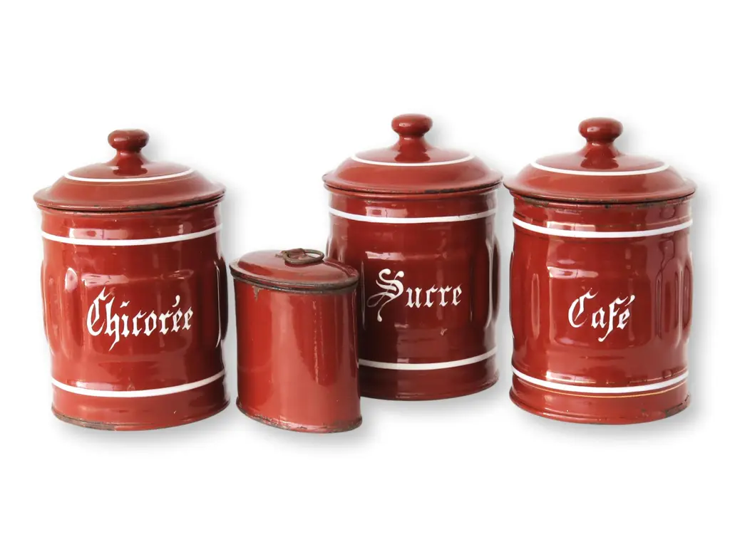 This charming French enamel coffee canister set includes companions for Coffee, Sugar, Chicory, and Tea. With its classic design and vintage flair, it's a delightful nod to traditional French kitchens. Perfect for adding character to your countertops or as a gift for the culinary collector