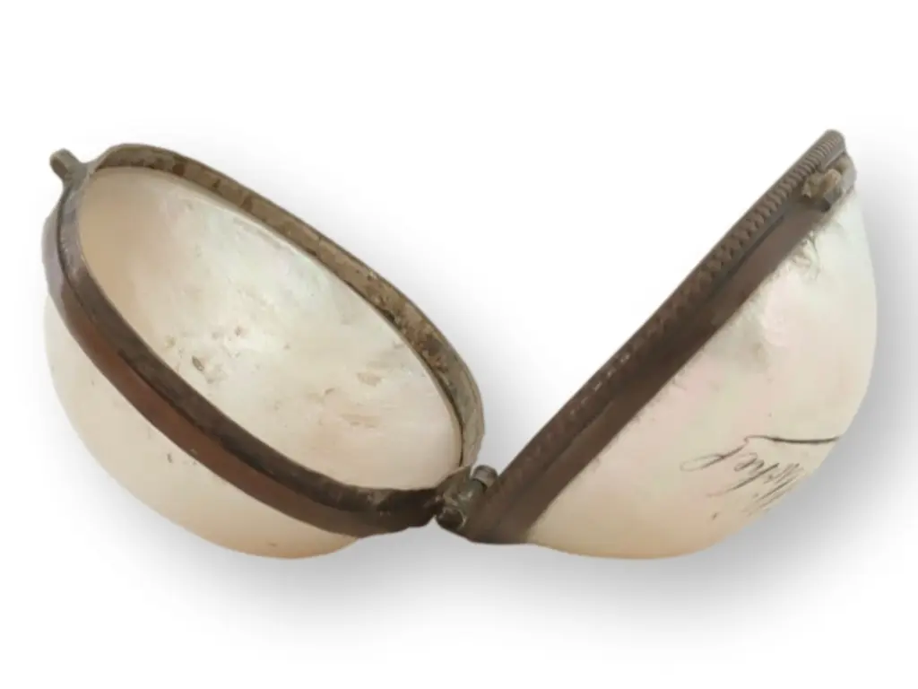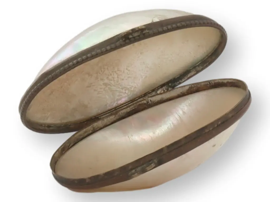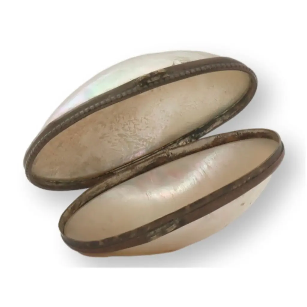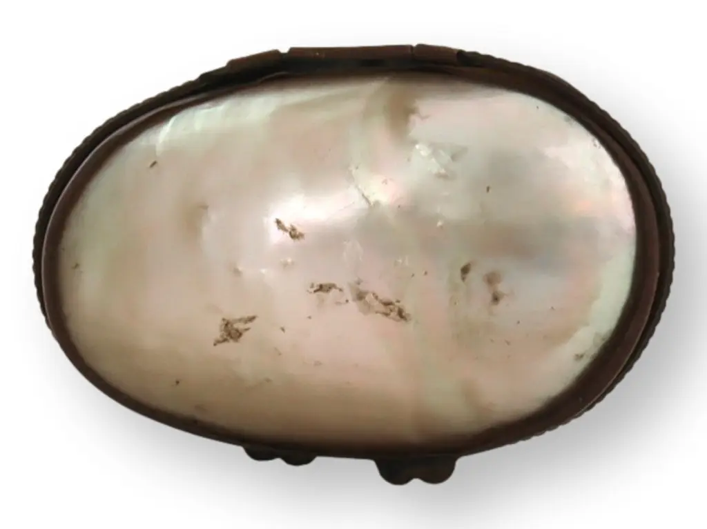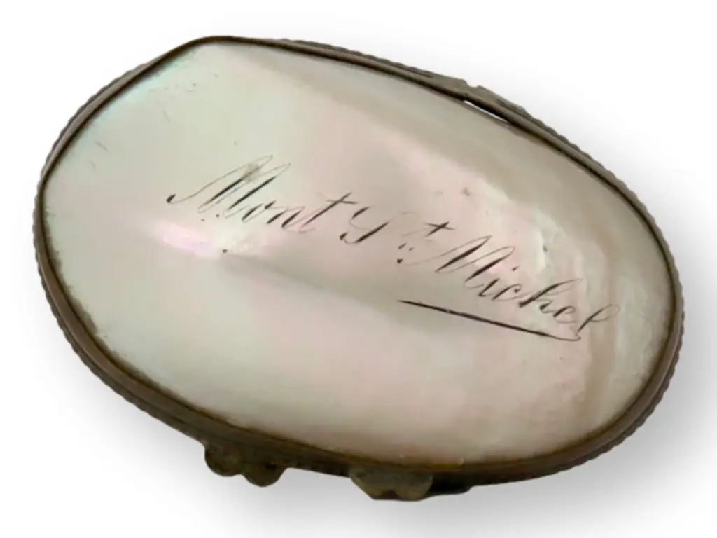 Delicate mother of pearl shell trinket box, a charming souvenir from Mont St. Michel. The box features a beautiful iridescent surface engraved with 'Mont St. Michel,' capturing the elegance of this iconic location. Perfect for storing small keepsakes or as a decorative piece, this box adds a touch of historical charm and natural beauty to any collection. Ideal for lovers of French souvenirs or unique coastal collectibles.