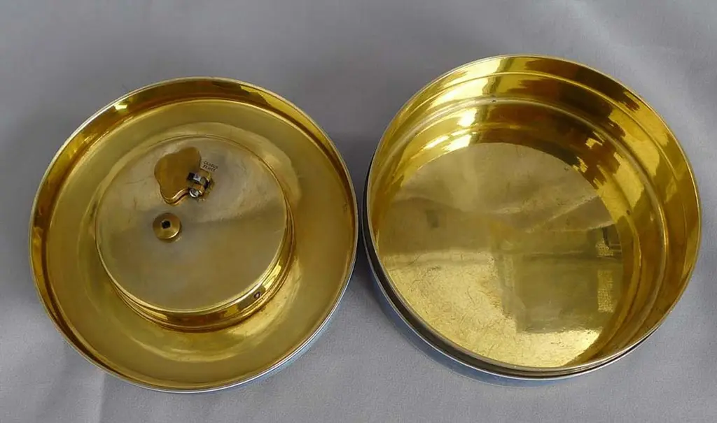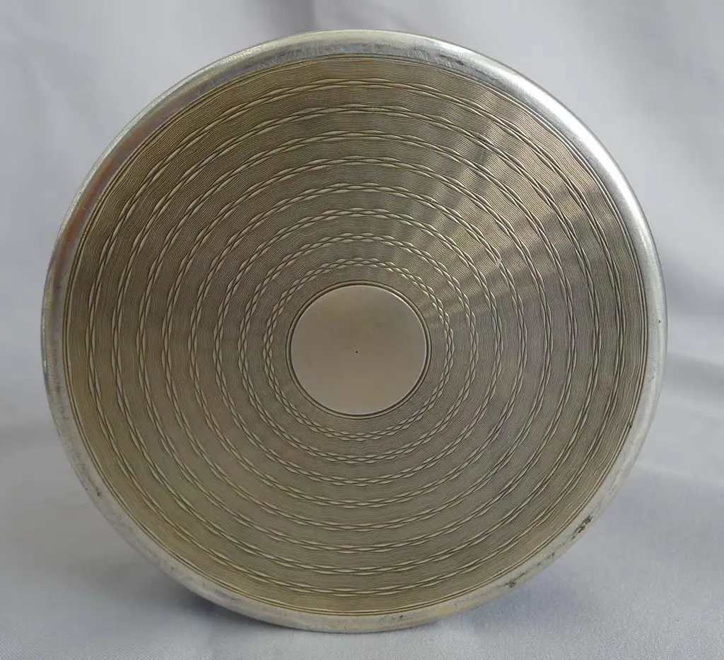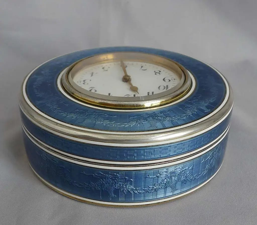 A most unusual and quite beautiful, large silver gilt and florally decorated French grey/blue guilloche enamel box clock. The circular box with engine turned silver gilt base with bands of silver and white enamel with a wide floral guilloche enamel band to the base. The upper part of the box with a band of lilac guilloche enamel with the top decorated with French blue floral guilloche enamel and centered by an 8-day clock with white enamel dial. The quality of this piece is extraordinary, not only is the box silver gilt but also the bezel and most unusually, the backplate holding the movement which in turn is beautifully gilded. The box is French as is the fine 13 jewel clock with 3 adjustments.