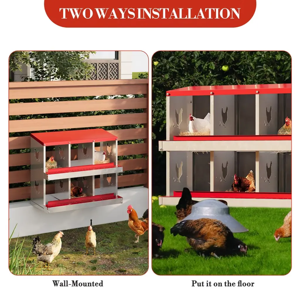 Upgrade your coop with this professional-grade nesting box featuring patented roll-away egg technology. The 7° sloped floor gently directs eggs into a protected collection tray, reducing breakage by 90% while keeping nests hygienic. Constructed entirely from galvanized steel with reinforced corners, it withstands years of farm use without rusting or corrosion. Key Specifications: Material: 0.8mm galvanized steel (roof/walls) + food-grade PVC trayDimensions: 40"W x 16"D x 13"H (6-hole) / 60"W x 16"D x 13"H (10-hole)Ventilation: 8 airflow ports per compartmentMaintenance: Hose-clean surfaces; wipe tray weeklyThe spacious design (12"x12" per nesting hole) accommodates standard to large breeds comfortably. Strategic roof vents prevent condensation while the removable dividers simplify deep cleaning. Perfect for:• Preventing egg-eating habits• Humid climates requiring moisture control• Free-range setups needing durable outdoor solutions• Small farms with limited cleaning time Why Farmers Recommend:✓ Saves 20+ weekly egg collection minutes✓ Eliminates 95% of broken eggs✓ Adds 18+ months to equipment lifespan✓ Suitable for chickens/ducks/rabbits Routine Care: Inspect mounting brackets seasonally; apply silicone lubricant to tray rails annually.