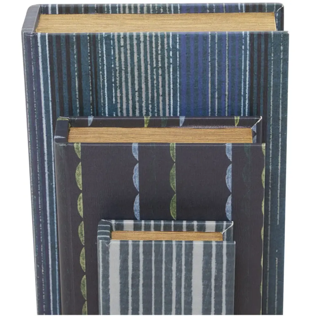 A set of 3 wooden book boxes highlights a chic print design that can elevate the visual aesthetic of simplistic furniture pieces and create height on bookshelves and consoles. This item ships in 1 carton. Books are capable of nesting within each other. A faux leather box makes a great gift for any occasion. Suitable for indoor use only. This item ships fully assembled in one piece. This gray-colored book-shaped box comes in a set of 3. Traditional style.
