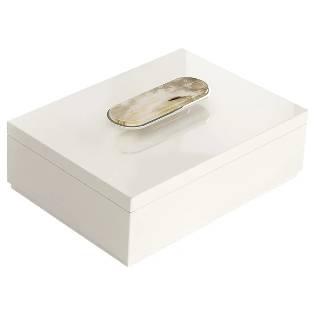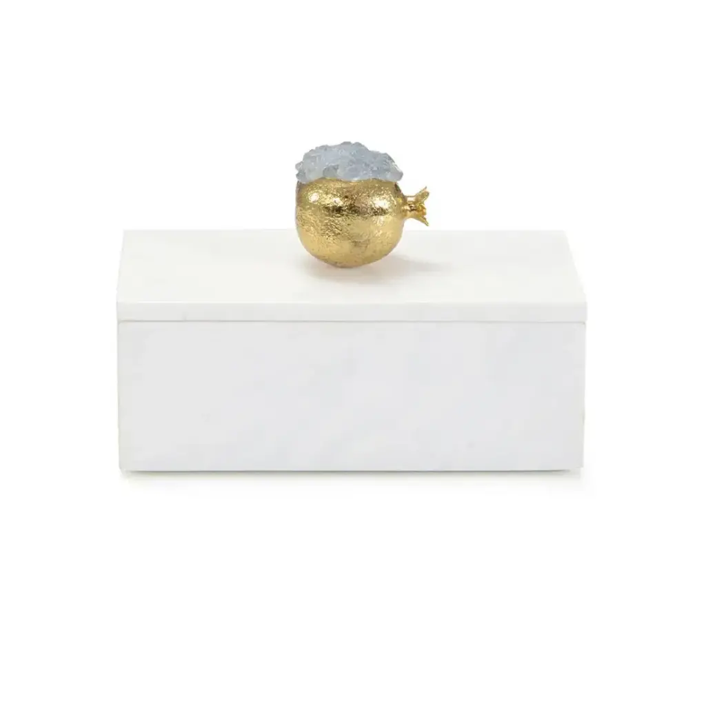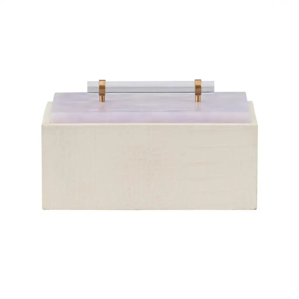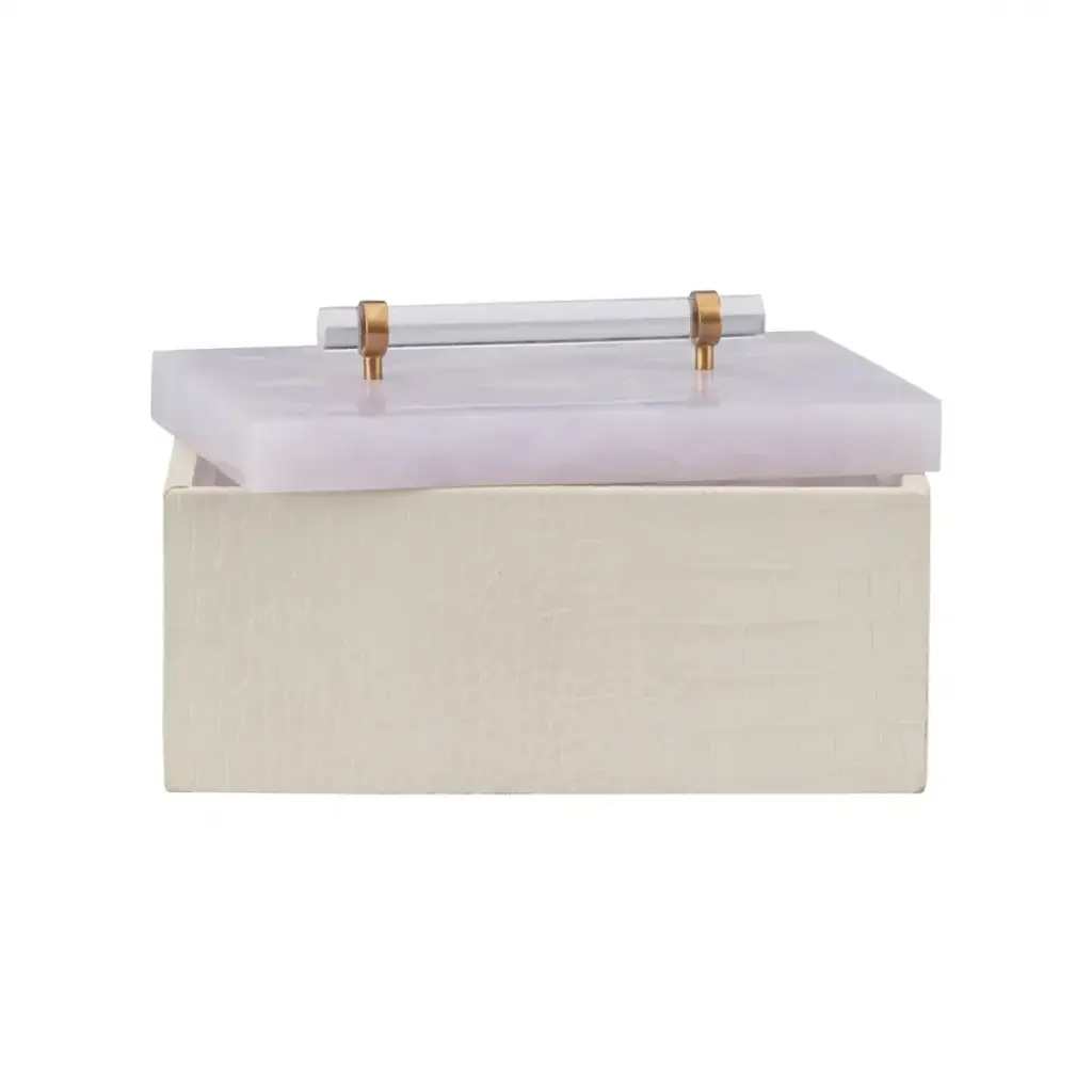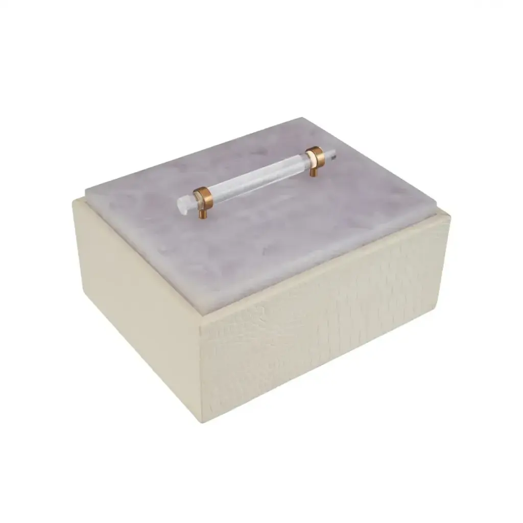 The Gem Box in white exudes luxury with its faux croc leather exterior and a translucent quartz-like acrylic lid that rests seamlessly on an interior ledge. Finished with a sleek acrylic handle and champagne detailing for an elegant touch. Designed by Shayla Copas.