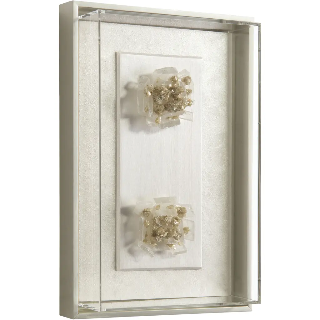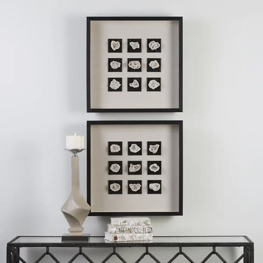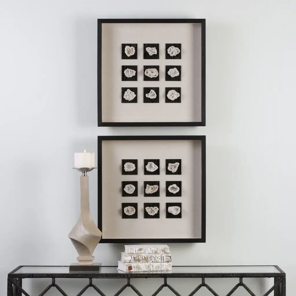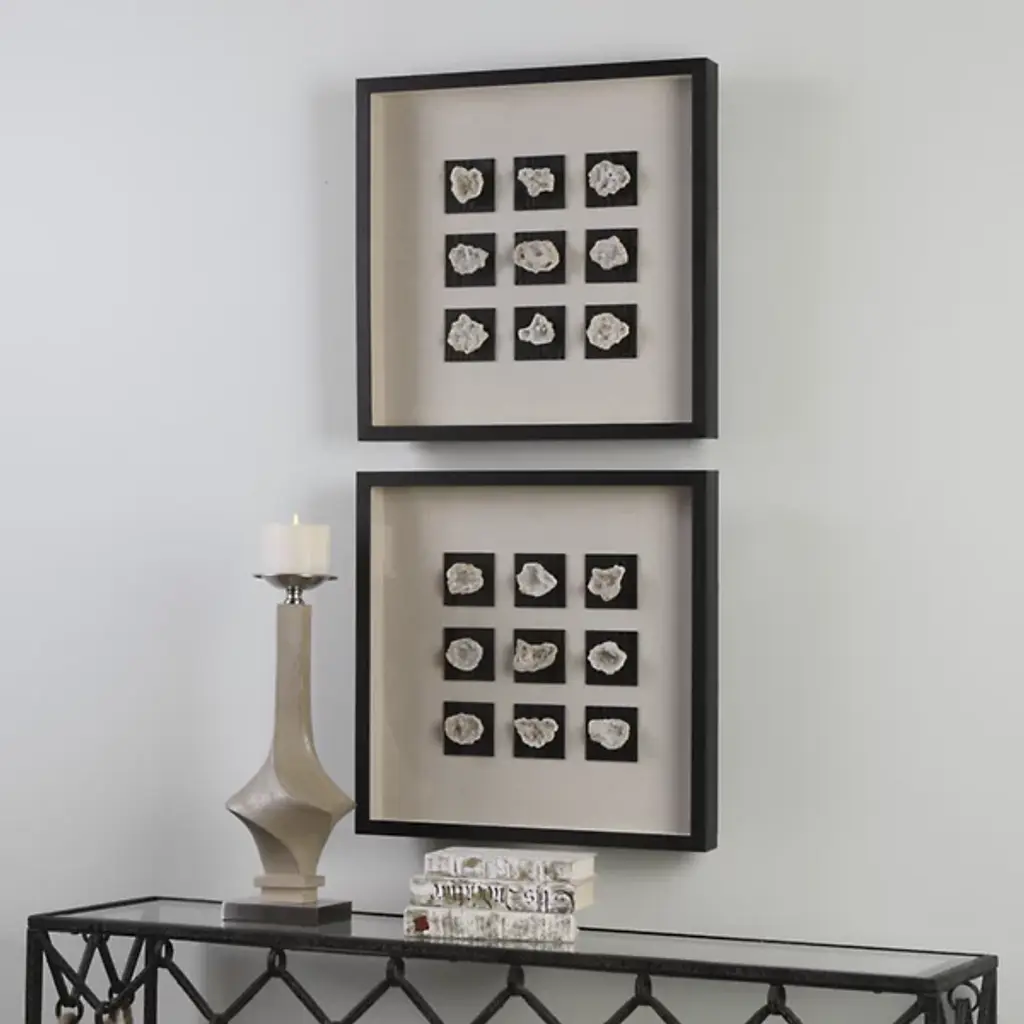 The Geode Shadow Box from Uttermost displays Earth's hidden treasures in a museum-worthy presentation. Each crystalline formation sits perfectly centered on individual wood grain platforms, creating a grid of geological specimens that invite closer inspection. The multiple display format encourages comparison between subtle variations in crystal structure and formation patterns. The layered matting technique—fabric under wood—adds dimensional depth that enhances the three-dimensional quality of the minerals themselves. This scientific approach to presentation transforms natural specimens into curated art while maintaining their authentic character. The precise arrangement brings order to nature's organic formations, creating harmony between raw geology and refined presentation.