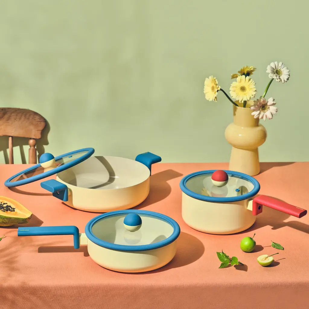 Like bright, colorful toys for your kitchen, this cookware design brings happy hues to your daily meal prep. Each Geometric Cookware design (sold separately) features a clear glass lid for cooking visibility, with a brightly colored silicone rim and contrast color handles and lid knob. Its non-stick PFAS-free ceramic coating ensures easy food release and simple cleanup. Made to be used on all types of stovetops—gas, electric and induction—this cookware’s outer body is made from durable aluminum which is known for its equal distribution of heat and high thermal efficiency. Avoid using with metal utensils to prevent scratching the non-stick surface. Features of Geometric Cookware include: Colorful design looks good in your kitchen. Made for everyday use. Non-stick PFAS-free ceramic coating. Cream-colored aluminum outer body for even heat distribution. Light color of the cookware showcases your food. Clear glass lid with silicone rim for sealing in heat during cooking. Heat-resistant Bakelite handles. Made without lead or cadmium so no toxic gas is emitted during cooking. Can be used on all types of stovetops: gas, electric & induction. To avoid scratches, please do not drag or shake cookware on inductions cooktops. Avoid heating the pan when empty to ensure a longer lifespan. Avoid using the cookware as a long-term food storage container. Allow pan to completely cool before washing by hand. Do not immerse in water while hot. Do not use in the oven or microwave. Not dishwasher-safe. After washing, dry the cookware completely with a kitchen towel.