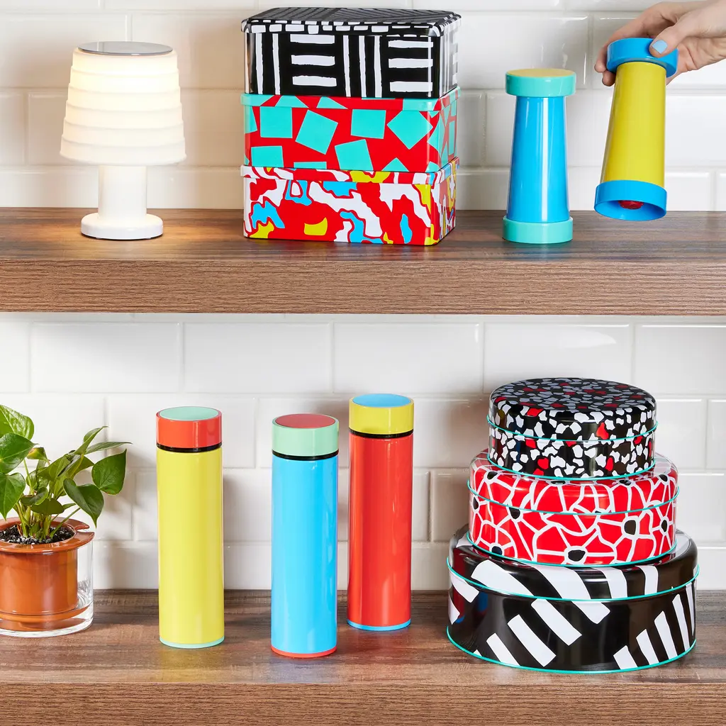 MoMA Exclusive: Adorned with the kind of colorful and energetic patterns that designer George Sowden is known for, this set of three versatile lidded tins has multiple functions. Use it to store dry ingredients, keepsakes, photos, jewelry, art supplies, small toys, candy, shell and rock collections—the possibilities are endless. When empty, the tins can be nested inside each other for easy storage. George Sowden is a founding member of the Memphis Design Group and Memphis designs are represented in MoMA’s collection.