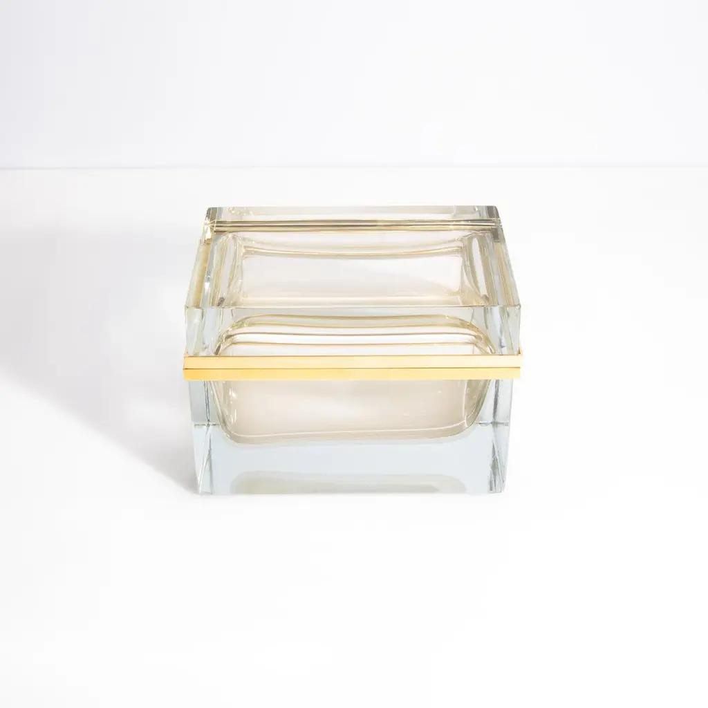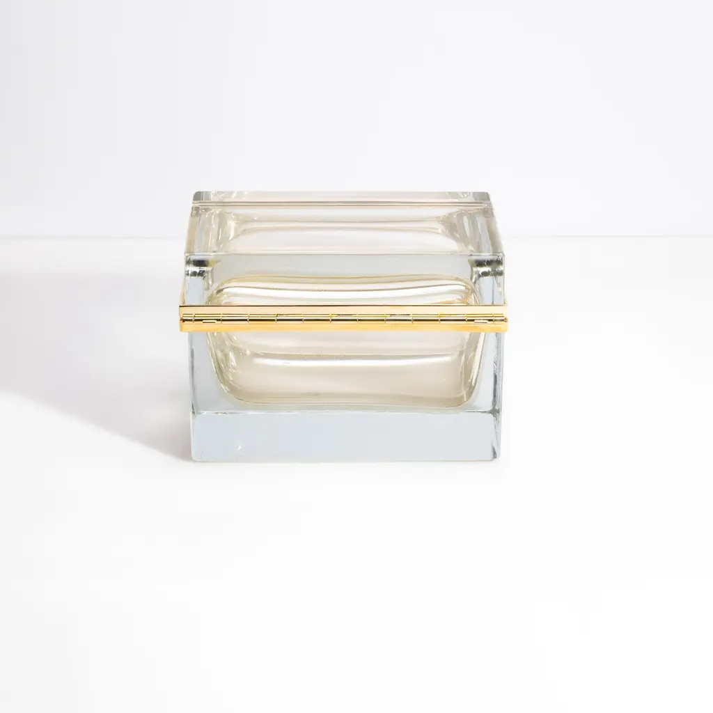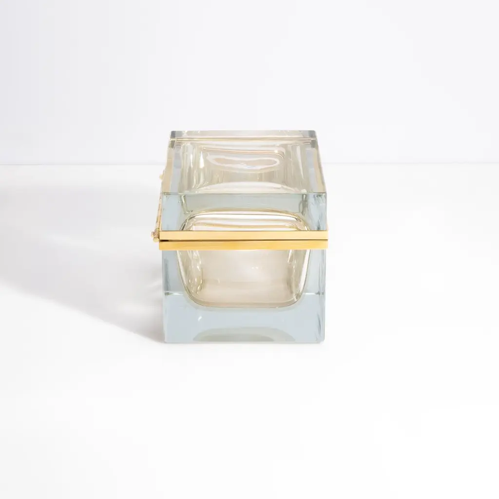 Impressive in its scale alone, this exquisite Murano glass box is a masterpiece of luxurious craftsmanship, featuring a pristine crystal body adorned with shimmering 24-karat gold flecks. The clear, sparkling crystal provides a perfect canvas for the intricate gold details, creating a stunning interplay of light and reflection. The sleek, rectangular silhouette is framed by polished gold-tone accents, adding a touch of sophisticated elegance to its design.Inside, the box continues to dazzle with its crystal clarity, beautifully complemented by the subtle sparkle of gold flecks. The lid, gracefully hinged, features a matching crystal panel with gold accents, ensuring a cohesive and refined aesthetic. The delicate gold embellishments along the edges enhance the box's luxurious appeal, making it a timeless addition to any decor.Handcrafted by master artisans, this Murano glass box is a true work of art. The combination of crystal clarity and 24-karat gold flecks creates an opulent and unique piece, perfect for showcasing treasured items or serving as a standalone decorative accent. This elegant box is a must-have for those who appreciate the finest in luxury design.All Murano Glass Boxes are in excellent condition and signed for MOGUL.Reference Number: 179108B