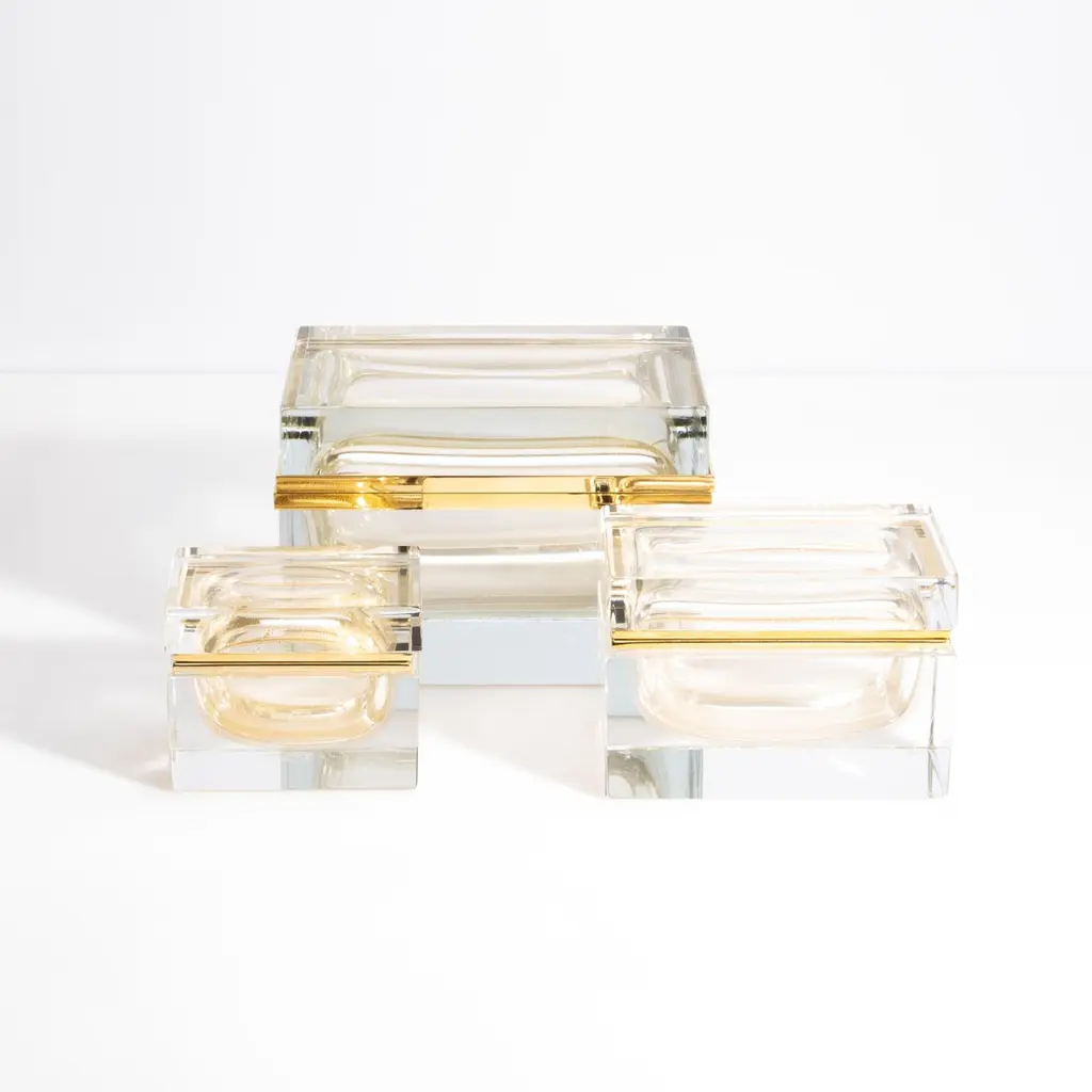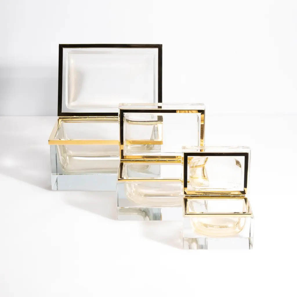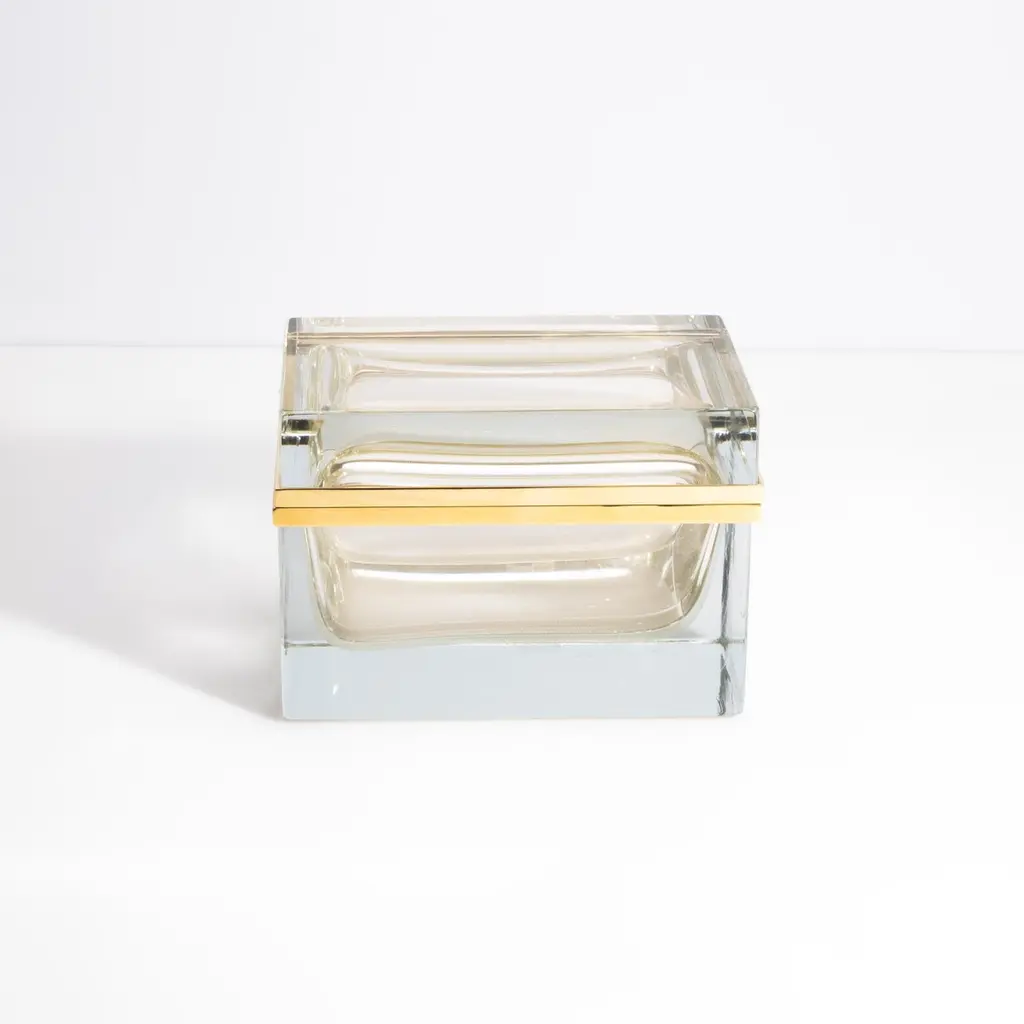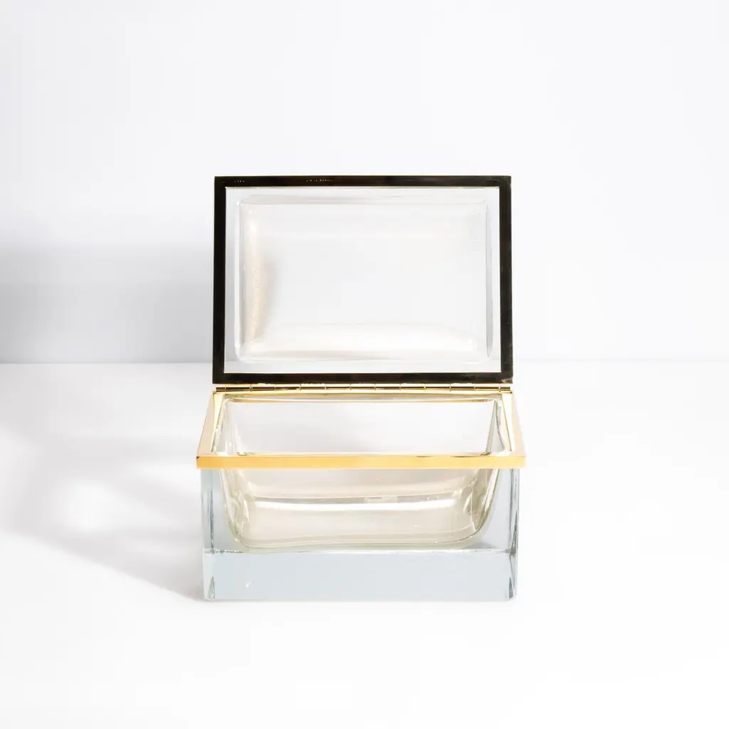 Impressive in its scale alone, this exquisite Murano glass box is a masterpiece of luxurious craftsmanship, featuring a pristine crystal body adorned with shimmering 24-karat gold flecks. The clear, sparkling crystal provides a perfect canvas for the intricate gold details, creating a stunning interplay of light and reflection. The sleek, rectangular silhouette is framed by polished gold-tone accents, adding a touch of sophisticated elegance to its design.Inside, the box continues to dazzle with its crystal clarity, beautifully complemented by the subtle sparkle of gold flecks. The lid, gracefully hinged, features a matching crystal panel with gold accents, ensuring a cohesive and refined aesthetic. The delicate gold embellishments along the edges enhance the box's luxurious appeal, making it a timeless addition to any decor.Handcrafted by master artisans, this Murano glass box is a true work of art. The combination of crystal clarity and 24-karat gold flecks creates an opulent and unique piece, perfect for showcasing treasured items or serving as a standalone decorative accent. This elegant box is a must-have for those who appreciate the finest in luxury design.All Murano Glass Boxes are in excellent condition and signed for MOGUL.Reference Number: 179108B