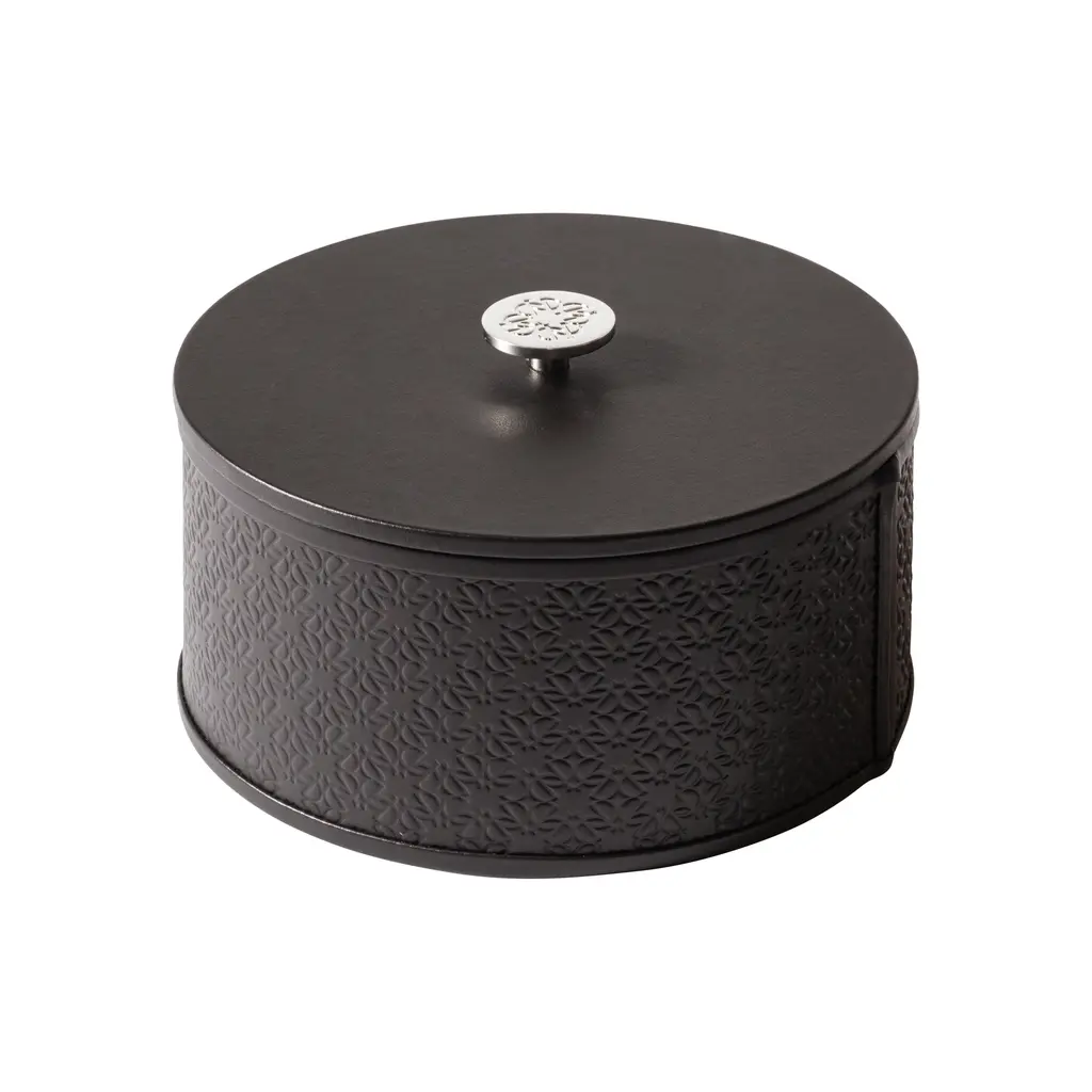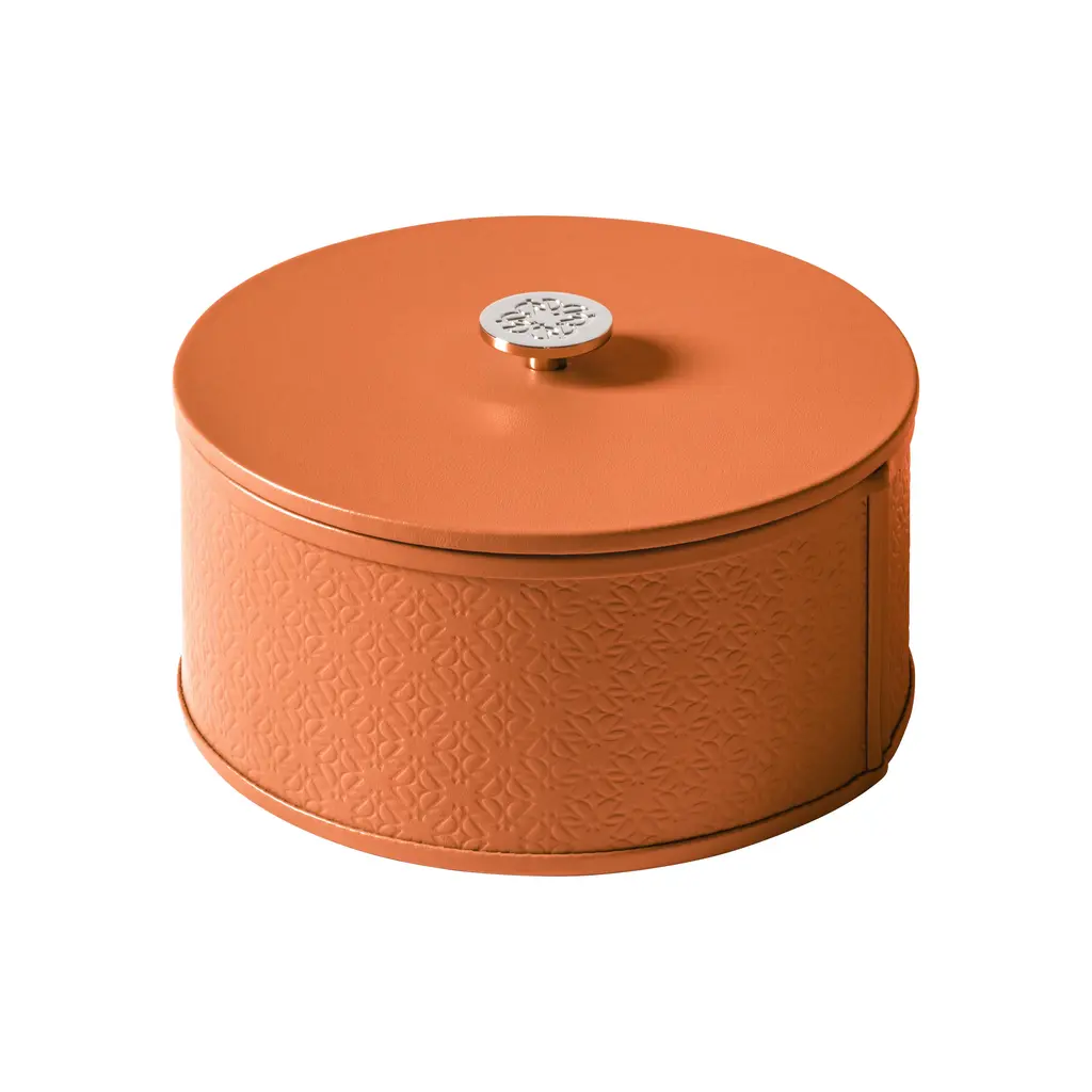 A jewel box for your treasures, the Giobagnara x Elie Saab Monogram Box with Lid is a sophisticated creation from the Giobagnara and Elie Saab collaboration. Expertly handcrafted in Italy, this round container features a soft, padded finish embossed with the exclusive ELIE SAAB Monogram pattern. The tactile design offers a chic sanctuary for cherished belongings, while a carved detail in brilliant palladium on the lid provides a final touch of opulence. It brings an intimate touch of haute couture to any personal space. Highlights: