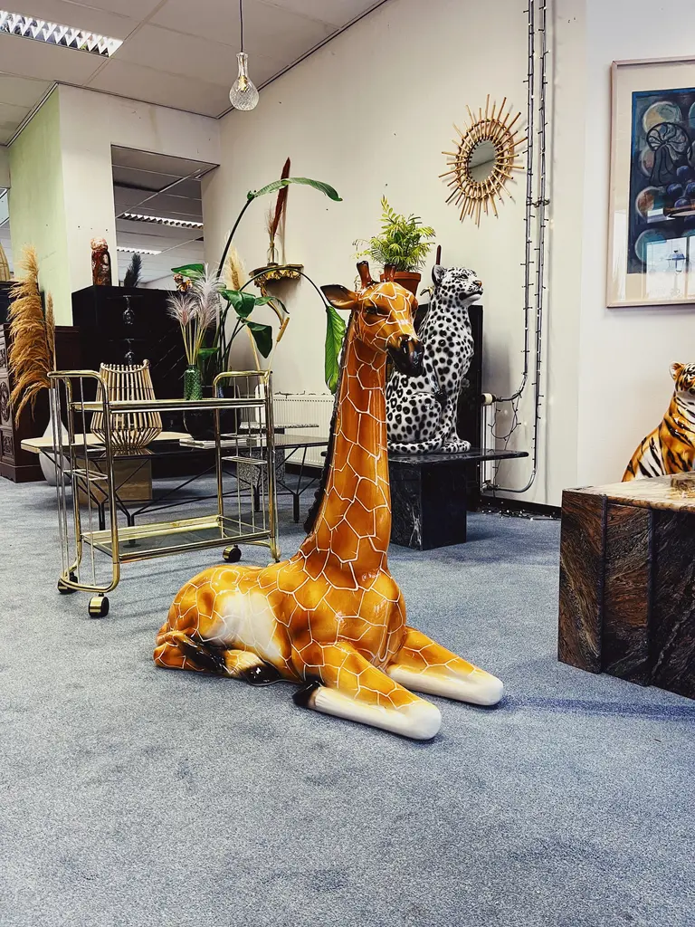Unique handmade statue of a giraffe. This Hollywood Regency statue, crafted from hand-painted ceramic and made in Italy, will undoubtedly add a stunning and sturdy look to your interior! All statues come directly from a family business in Northern Italy that has specialized in high-quality ceramic statues since 1985. Everything is made by hand, making each image unique. Dimensions Height: 89cm Width: 33cm Depth: 81cm Stamped by Maker