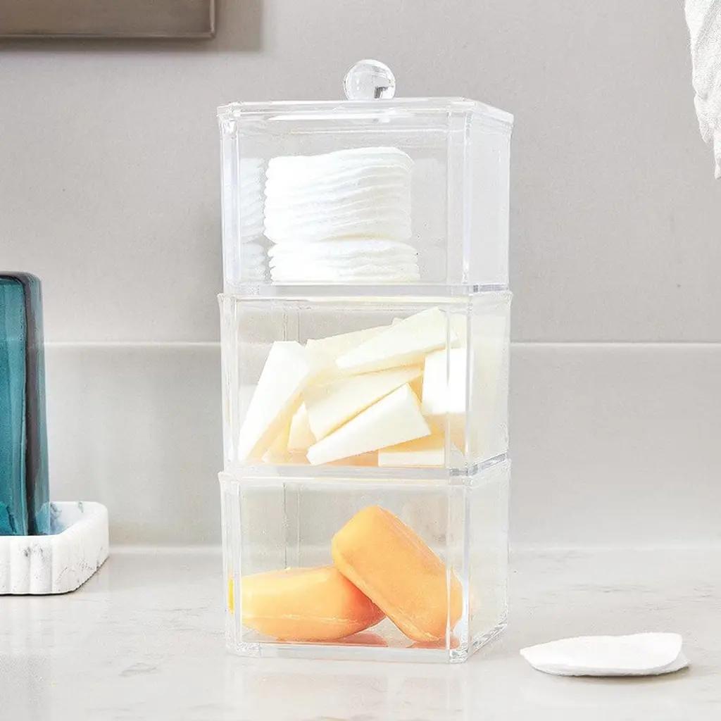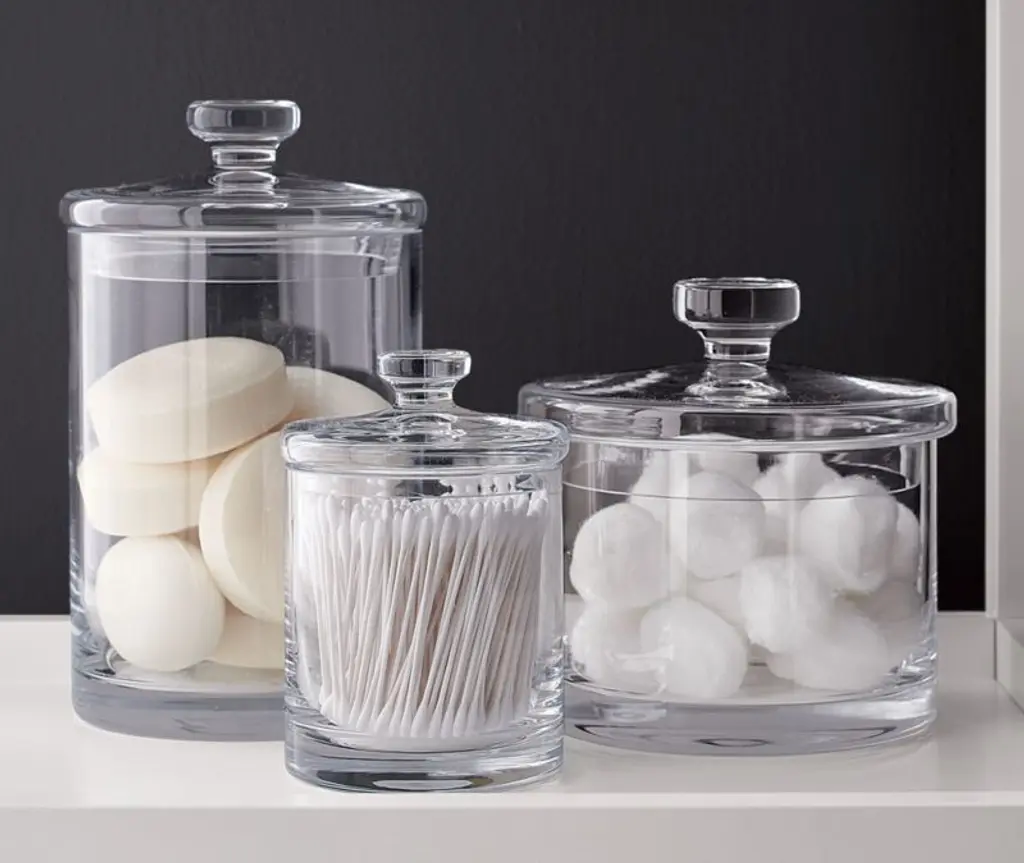 Simple bathroom storage with a retro feel. Handmade glass canisters with nesting lids update a classic apothecary look.